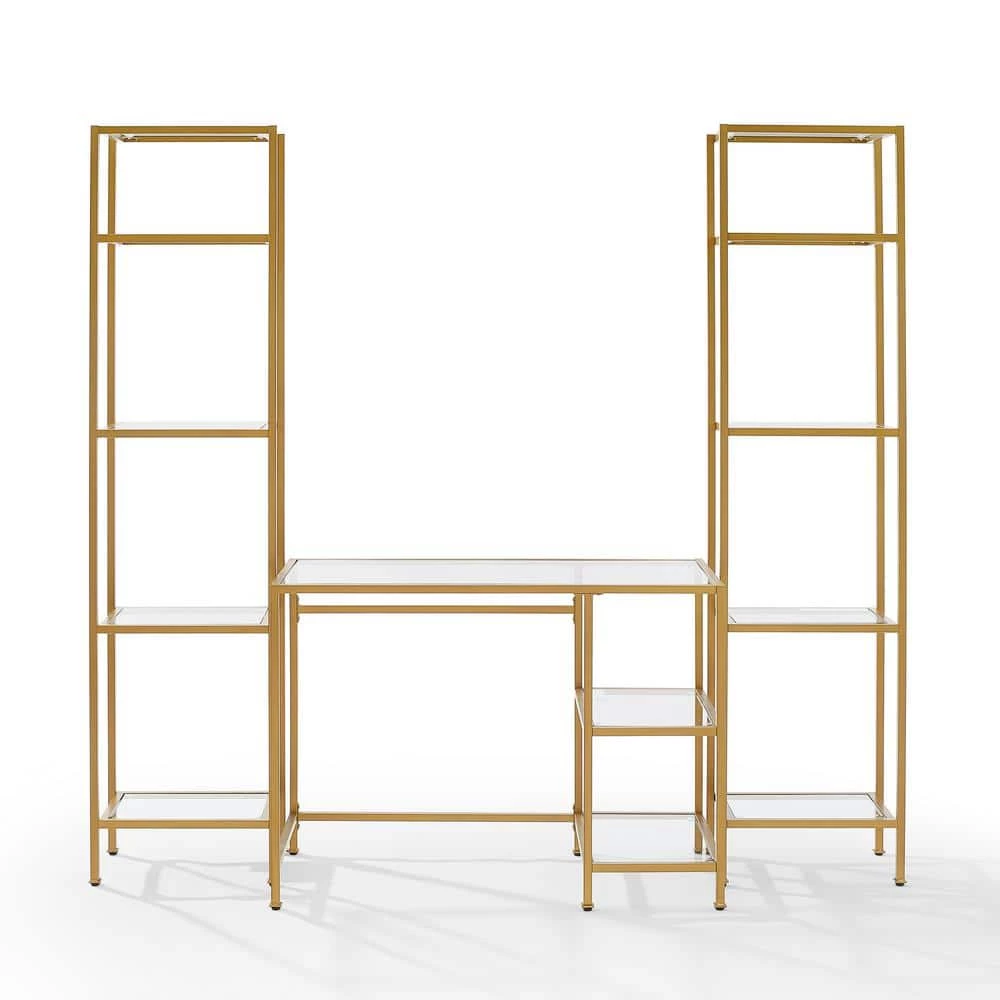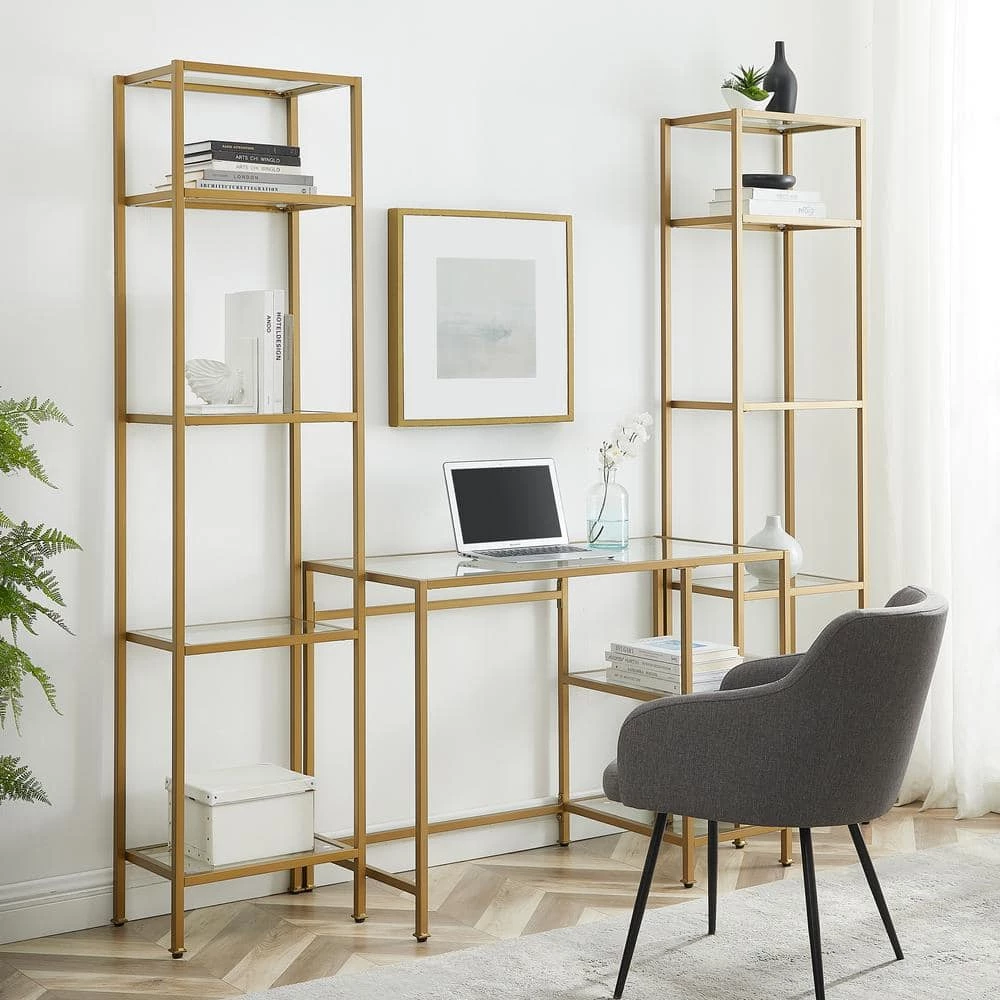Stylish and modern, the Aimee 3-piece Desk and Etagere Set is an eye-catching addition to any home office. With a sleek steel frame and tempered glass on the desktop and shelves, this set pairs with a variety of decor. Bring fashion and versatility to any room with the Aimee 3-Piece Desk Set.