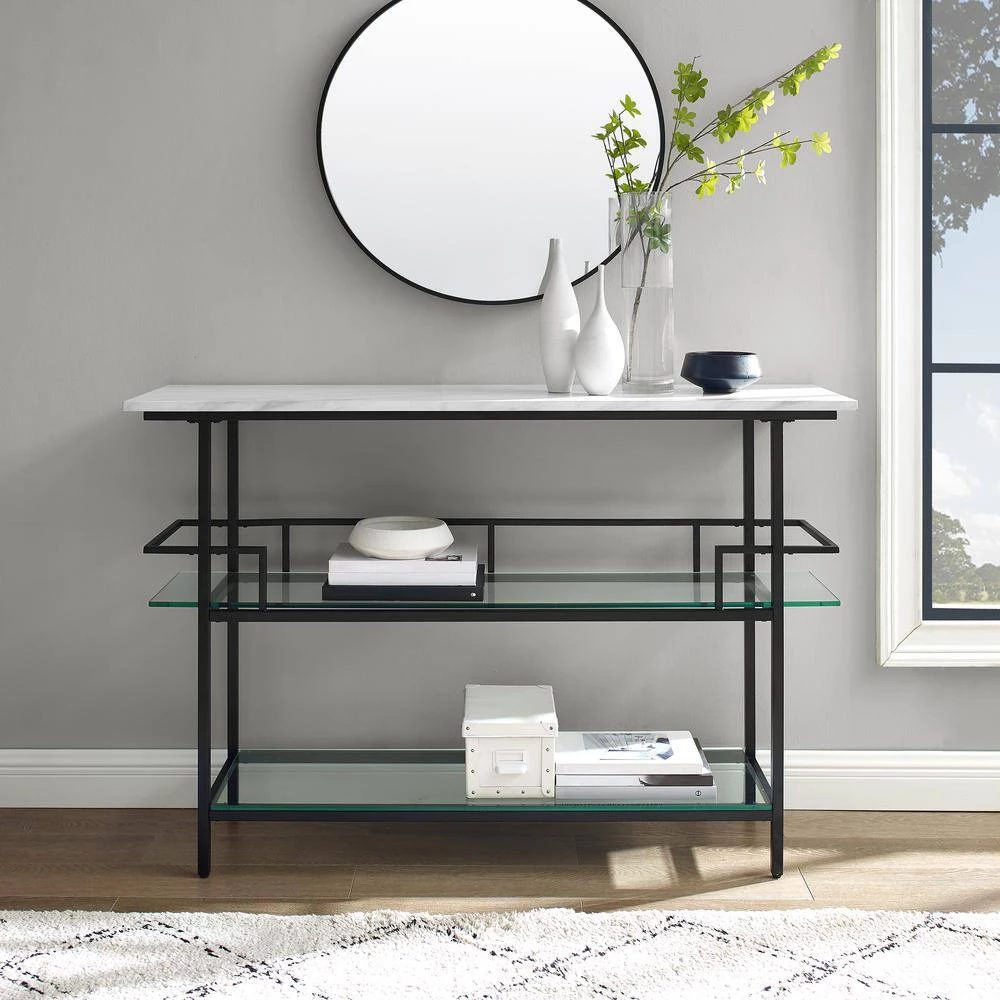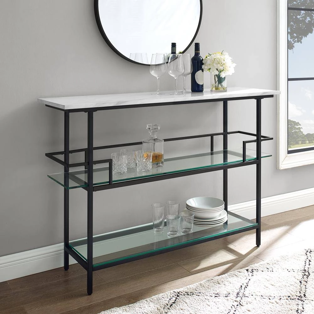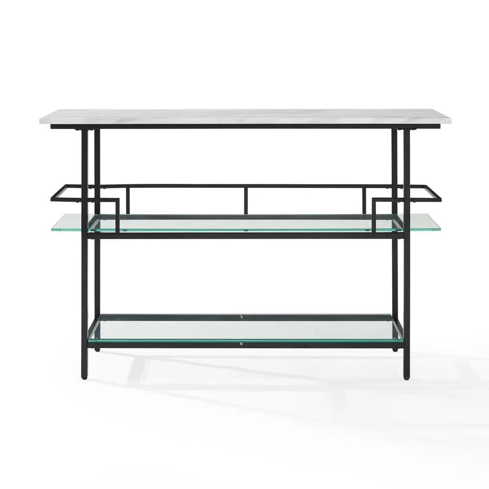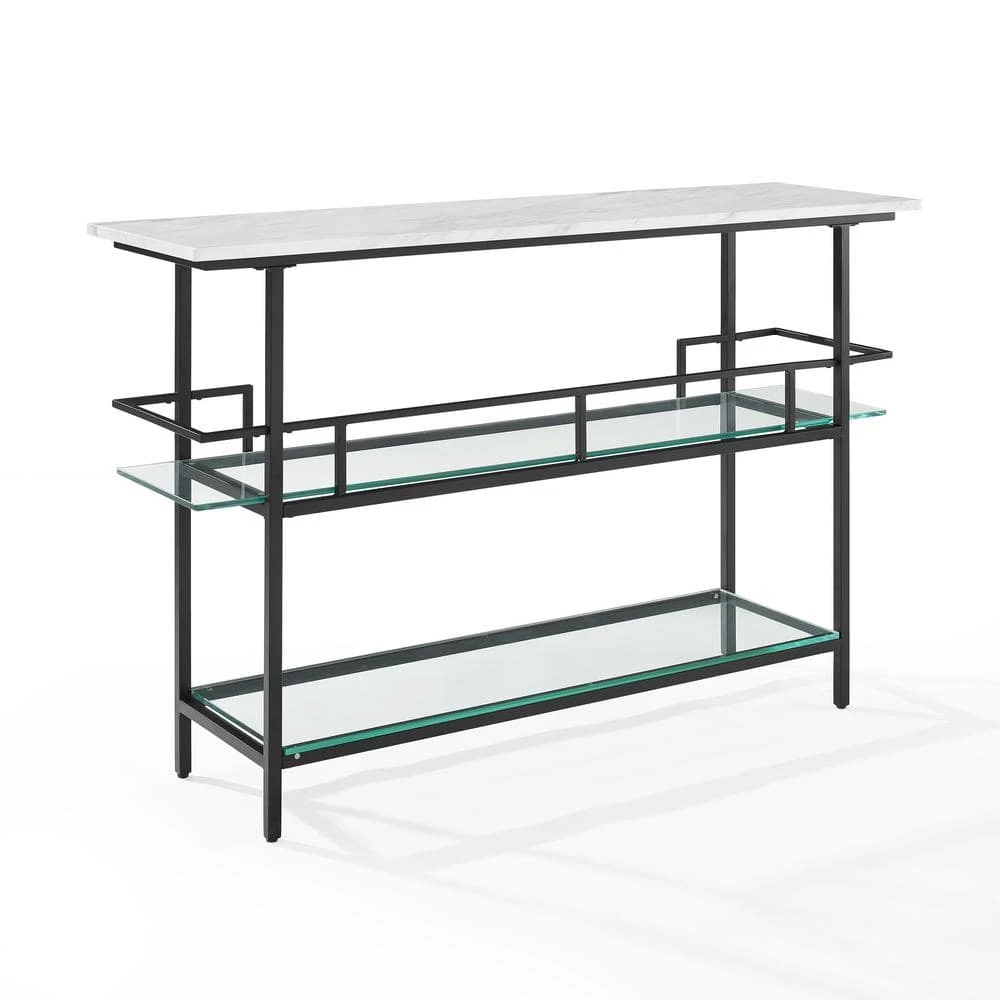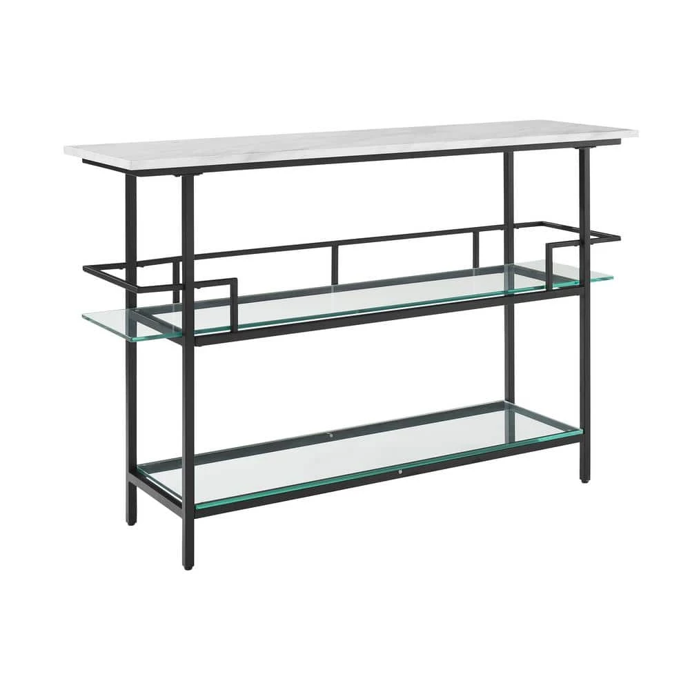 Stylish and modern, the Aimee Bar is an eye-catching addition to any home. The steel frame and tempered glass shelves create an open silhouette that works as a bar or console table. With its faux marble top, the Aimee Bar adds a touch of luxury and fashion to at-home entertaining.