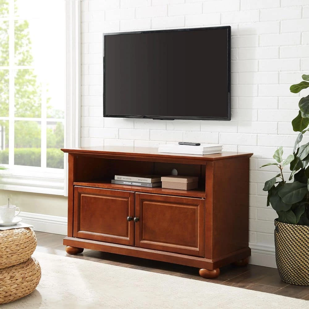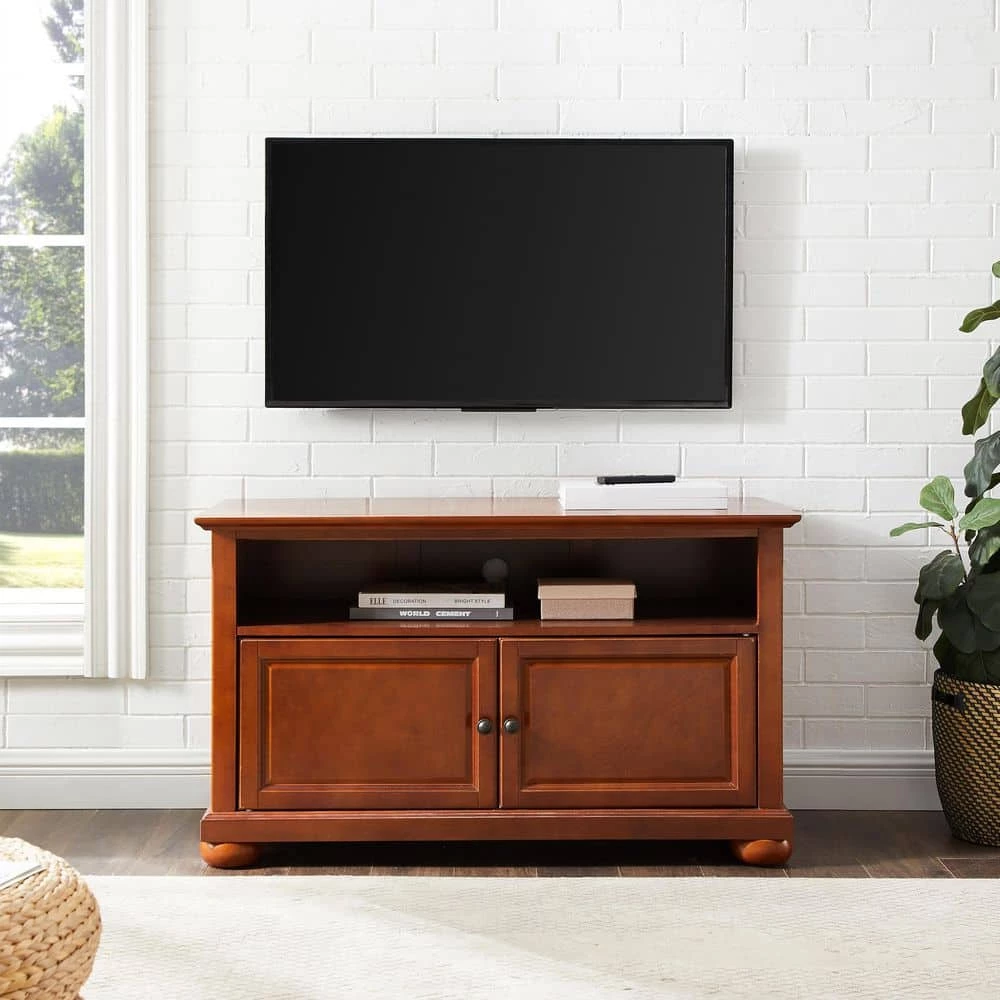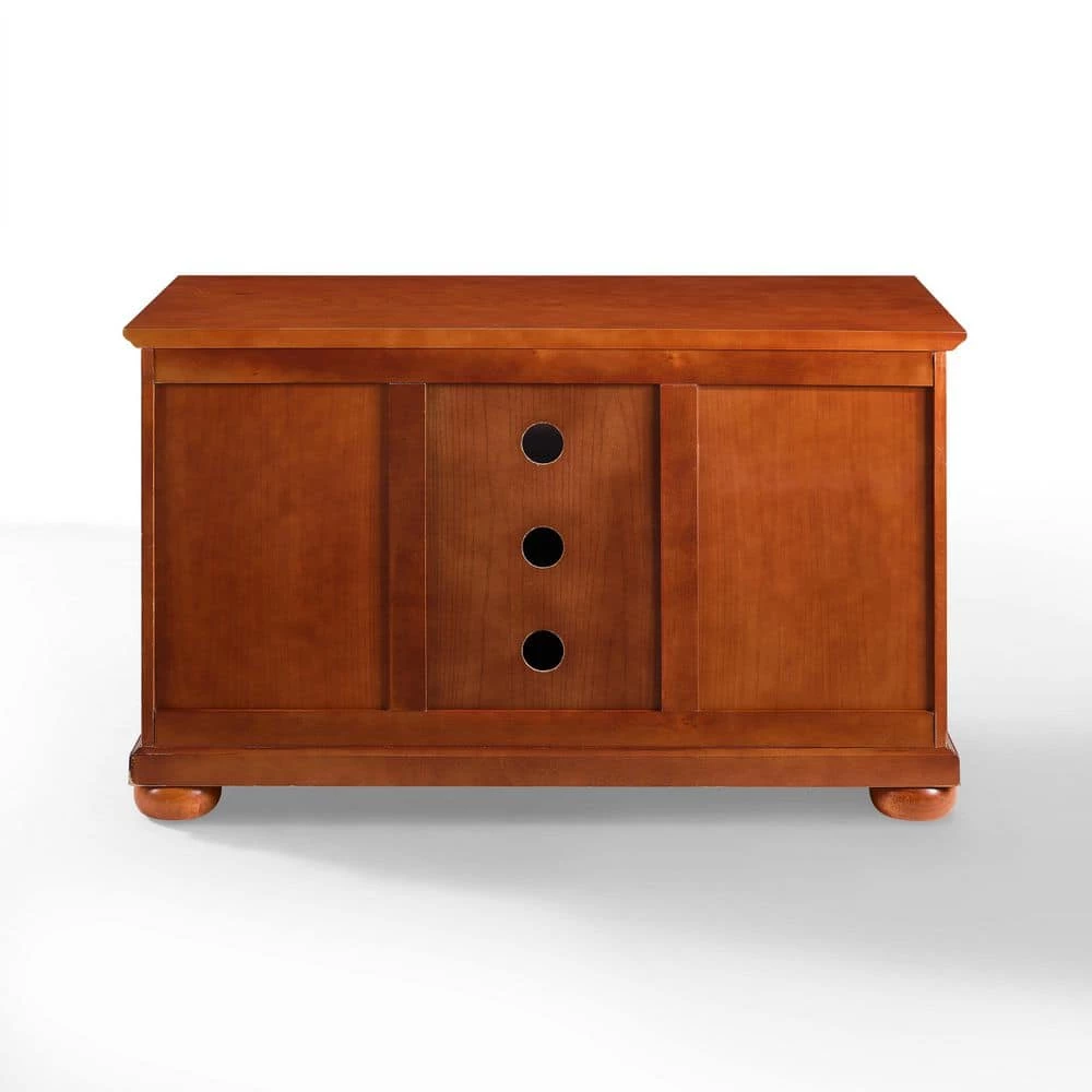 Constructed of solid hardwood and wood veneers, this cabinet is designed for longevity. The rich hand rubbed, multi-step Classic Cherry finish is perfect for blending with the family of furniture that is already part of your home. Antique Brass finish hardware adds a touch of style to this already beautiful cabinet. There is plenty of storage space and wire management behind the beautiful raised panel doors to hide electronic components, gaming consoles, DVDs and other items that you would prefer to be out of sight. The 42 in. width means that this cabinet is perfect for most 44 in. TV’s. Style, function and quality make this cabinet a wise choice for your home furnishings needs and is sure to be a part of your home for years to come.