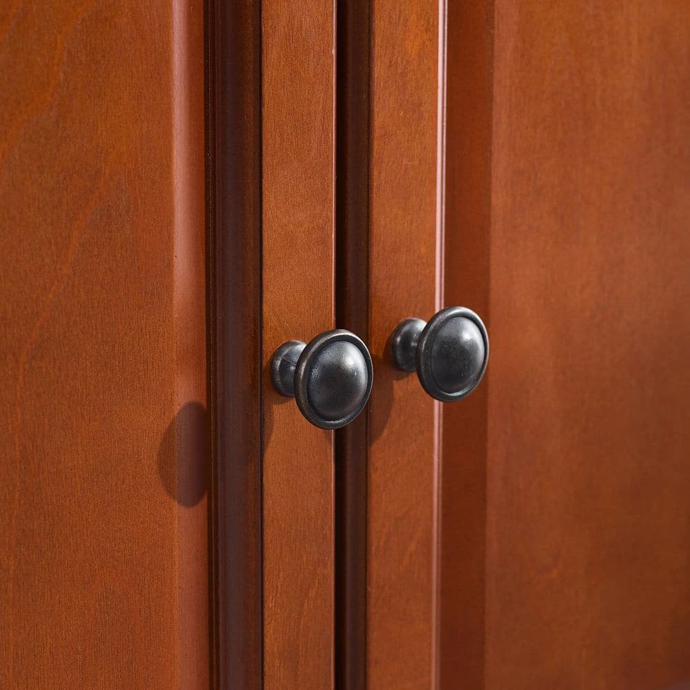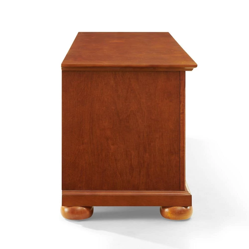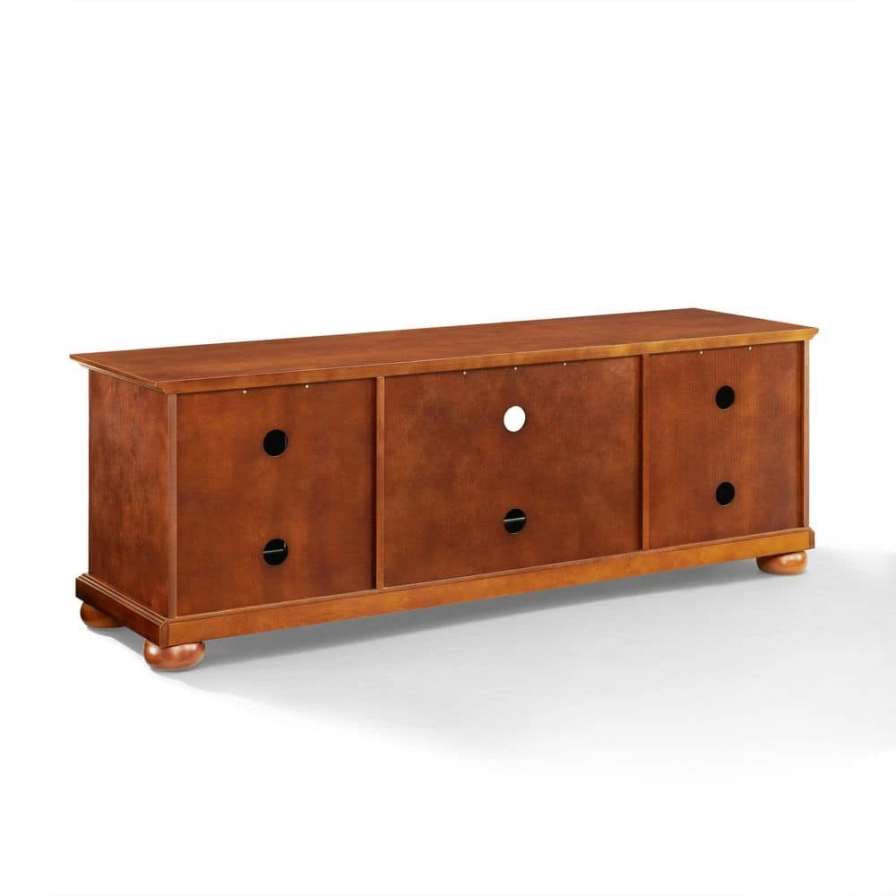 Enhance your living space with Crosley’s impeccably-crafted low profile TV stand. This signature cabinet accommodates most flat panel TVs and is handsomely proportioned featuring character-rich details sure to impress. The hand rubbed, multi-step Classic Cherry finish with antique brass finish hardware is perfect for blending with the family of furniture that is already part of your home. Raised panel doors strategically conceal stacks of CD/DVDs and various media paraphernalia. Tempered beveled glass doors not only add a touch of class; they protect those valued electronic components, while allowing for complete use of remote controls. Adjustable shelving offers an abundance of versatility to effortlessly organize by design, while cord management tames the unsightly mess of tangled wires. Style, function and quality make this cabinet a wise choice for your home furnishings needs.