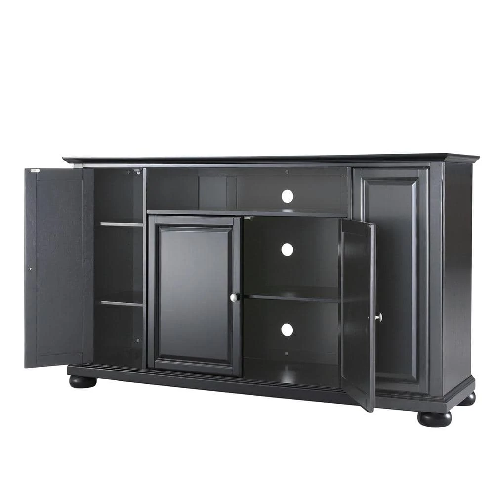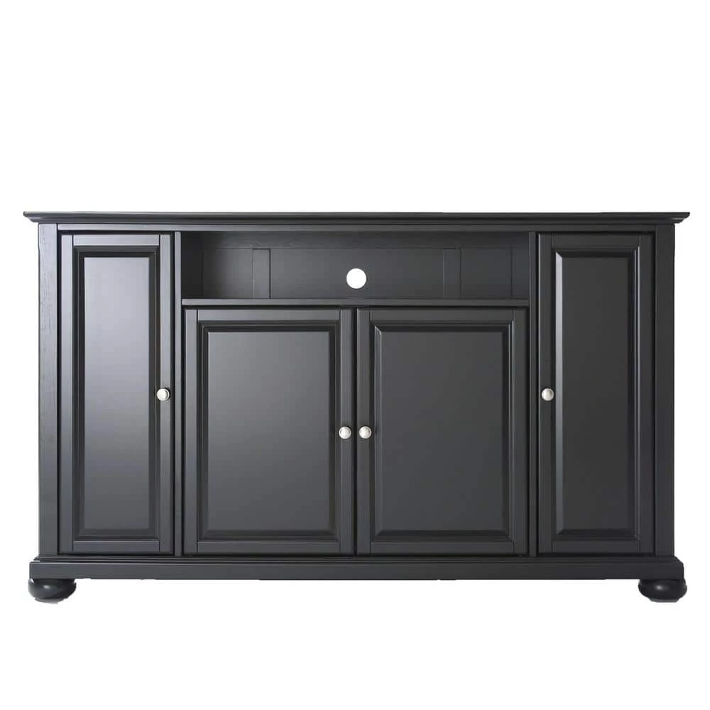 Constructed of solid hardwood and wood veneers, this cabinet is designed for longevity. The rich hand rubbed, multi-step black finish is perfect for blending with the family of furniture that is already part of your home. Brushed Nickel hardware adds a touch of style to this already beautiful cabinet. There is plenty of storage space and wire management behind the beautiful raised panel doors to hide electronic components, gaming consoles, DVDs and other items that you would prefer to be out of sight. The 59-3/4 in. width means that this cabinet is perfect for most 60 in. TV’s. This cabinet is not just for the TV room. The 36 in. height makes for great TV viewing in the bedroom. Behind the four doors, you will find adjustable shelves and lots of storage space for things other than electronics. Style, function and quality make this cabinet a wise choice for your home furnishings needs and is sure to be a part of your home for years to come.