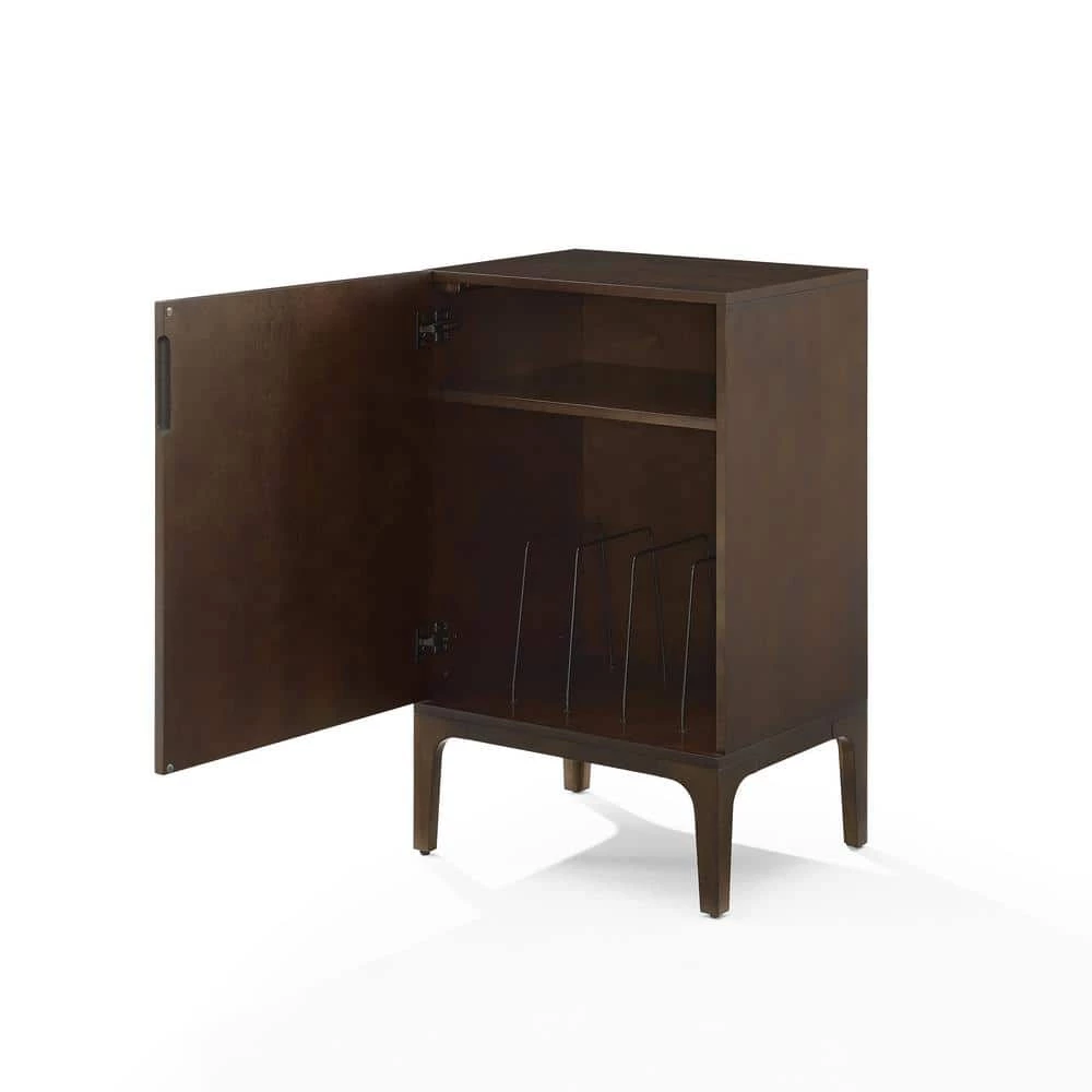 Get in the groove with the Asher Record Storage Stand. This modern stand features a sleek profile and a slatted look on the door. The top is sized perfectly to accommodate most component record players. A must have for any vinyl enthusiast, this cabinet offers wire record dividers, plus a shelf for storing accessories or a receiver.