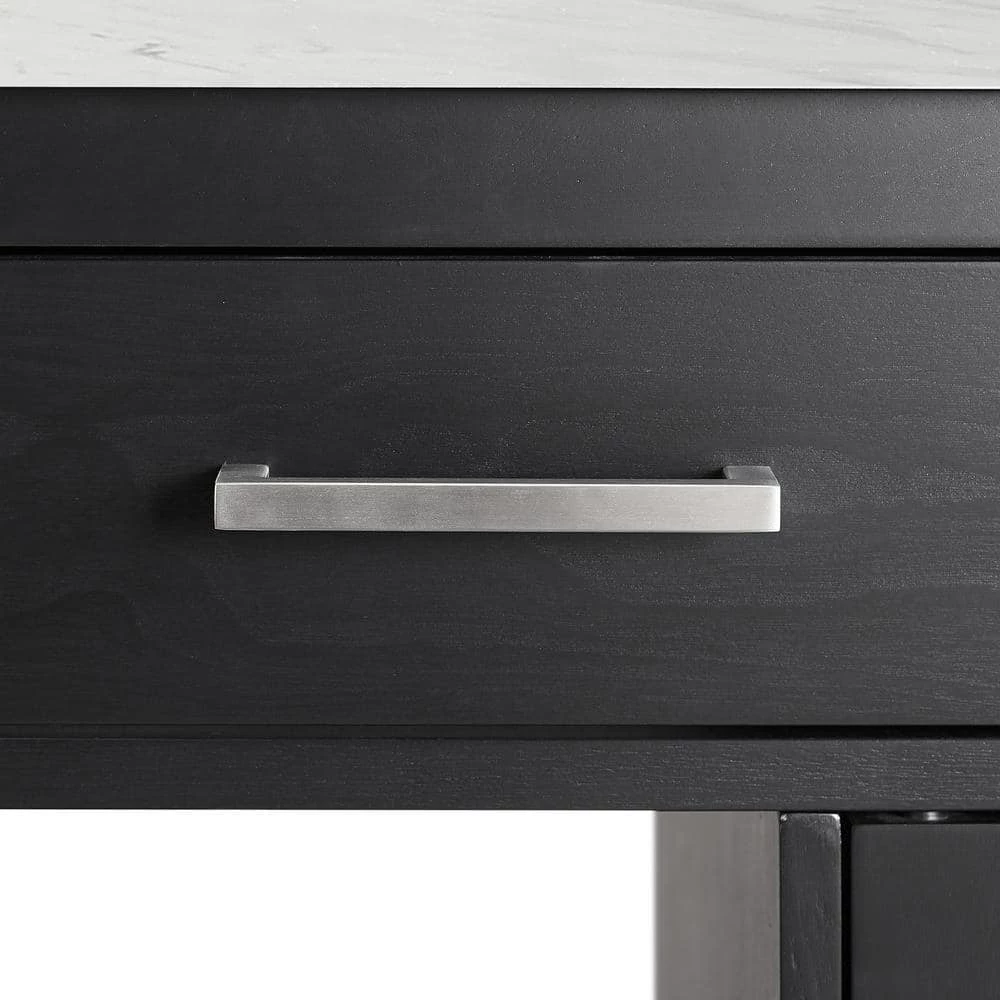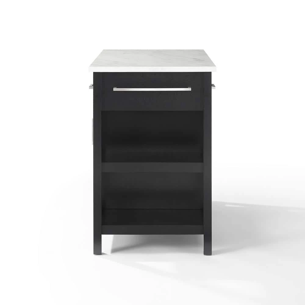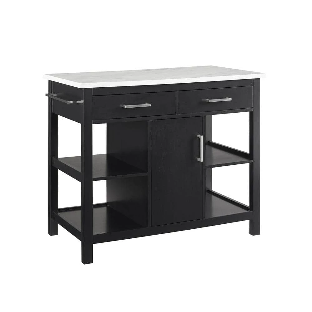 Ready to take center stage, this kitchen island offers storage and food prep in a sleek functional package. A beautiful faux marble countertop and bar hardware create a look of luxury with a modern edge. With a pass-through cabinet and two pass-through drawers, you can easily access cookware, small appliances and utensils from either side of the island. The four open stationary shelves on the sides of the island keep necessities close at hand while an adjustable shelf within the cabinet provides versatility in storage space.