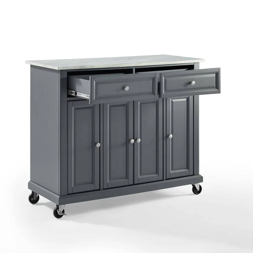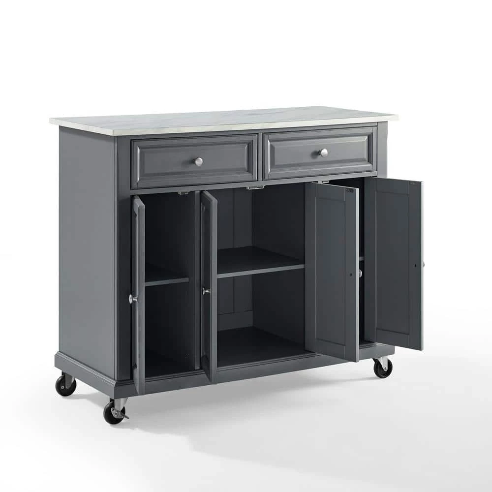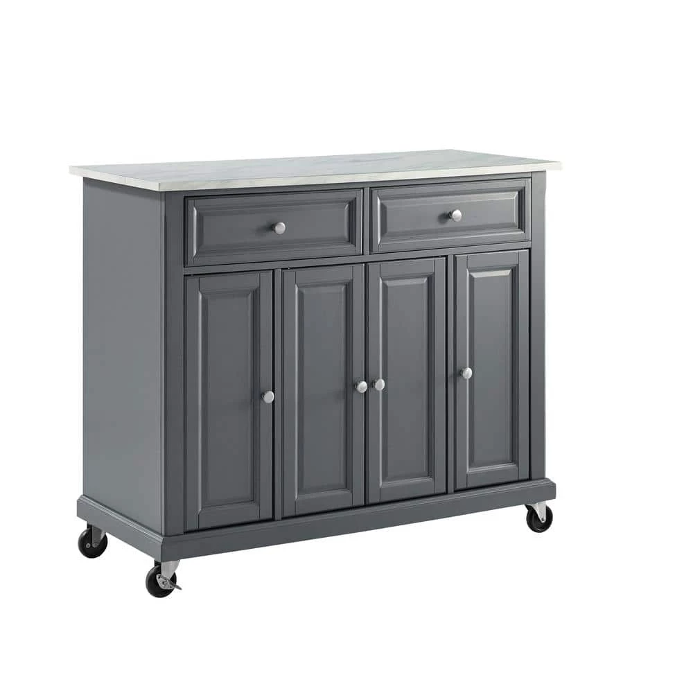 Increase the functionality of your kitchen with the Avery Kitchen Cart/Island. This traditional style packs a storage punch with two large drawers and three cabinets, perfect for tucking away servingware and seasonal items. The solid top features a paper marble finish for a rich yet cost-effective aesthetic. Crafted from solid hardwood and birch veneers, its a sturdy addition. Brushed nickel hardware completes the monochrome look. Both casters and classic feet are provided for your choice of stationary island or rolling cart.