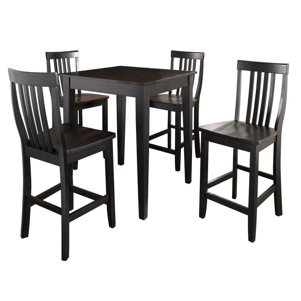 Constructed of solid hardwood and wood veneers, the 5 piece Pub / High Dining set is built to last. School House style bar stool is designed for longevity. Contoured seats and shaped back provide the ultimate in comfort. Whether you are looking for dining for four, or just a great addition to the basement or bar area, this set is sure to add a touch of style to any area of your home.