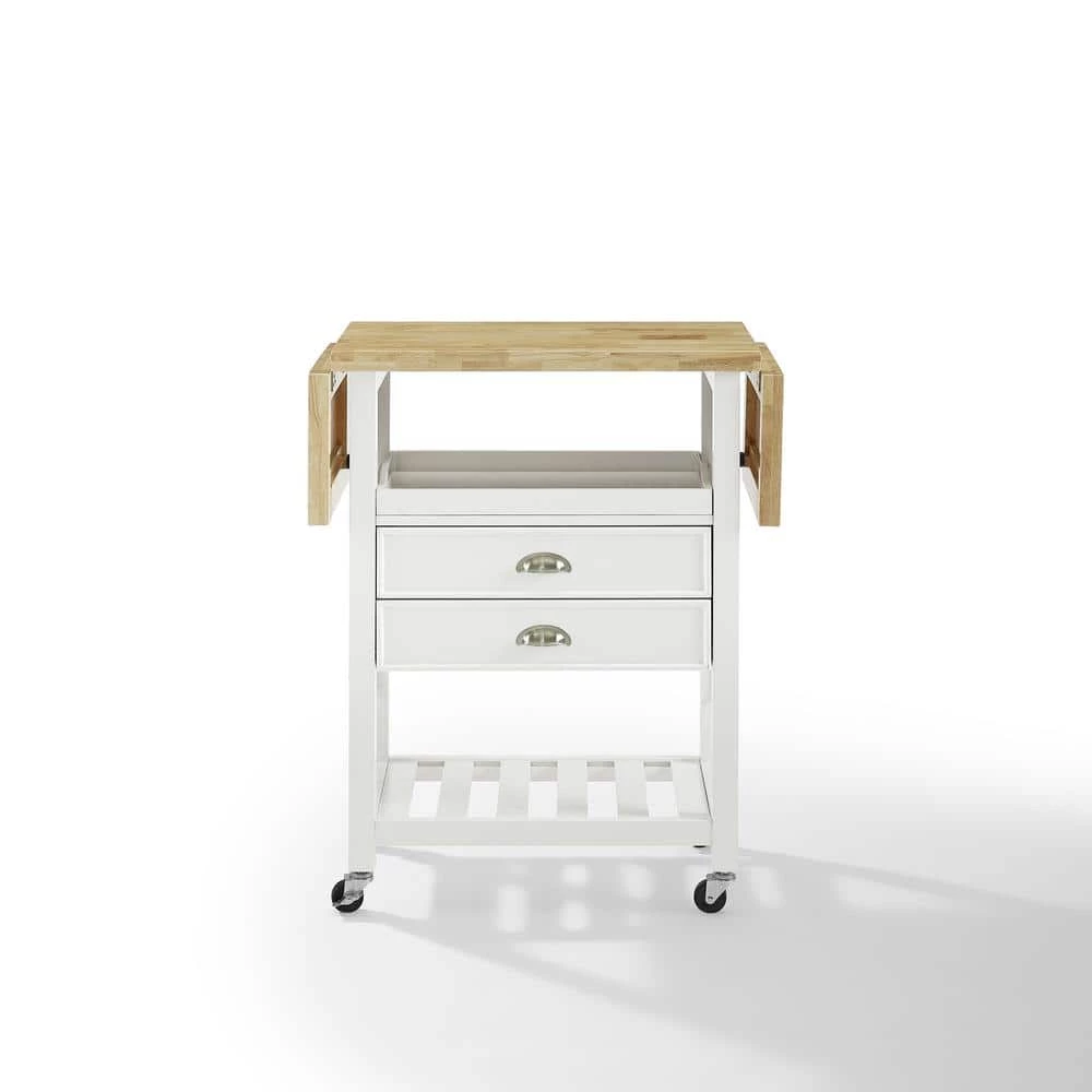 Simple design and high function are the hallmarks of the Bristol Double Drop Leaf Kitchen Cart. The drop leaf design doubles the counter space which can be used for food prep or as additional dining space. Two full-extension drawers and an open shelf provide ample storage, while the removable serving tray and caster wheels create a functional serving space. Perfect for a kitchen or dining area, the Bristol kitchen cart blends seamlessly with a variety of home decor.