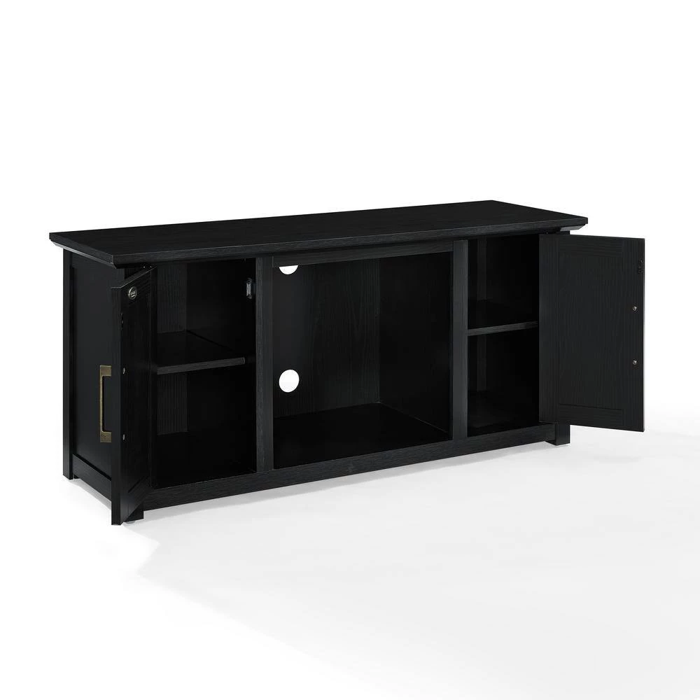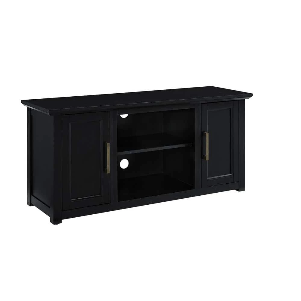 Gather together for a family movie night with the Camden 48 in. Low Profile TV Stand. This TV stand features two cabinets with an adjustable shelf in each, offering ample storage for your books, video games or other media. The open storage in the center has an adjustable and removable shelf, plus two pre-cut holes in the back for cable management. Sized to fit most TV’s up to 50 in., the Camden 48 in. Low Profile TV Stand exudes rustic style with the look of wood-grain and substantial metal hardware.