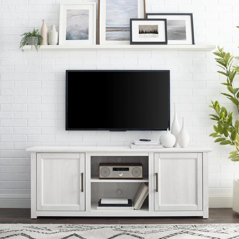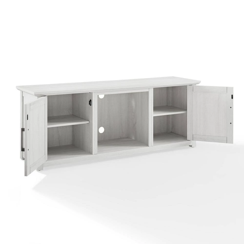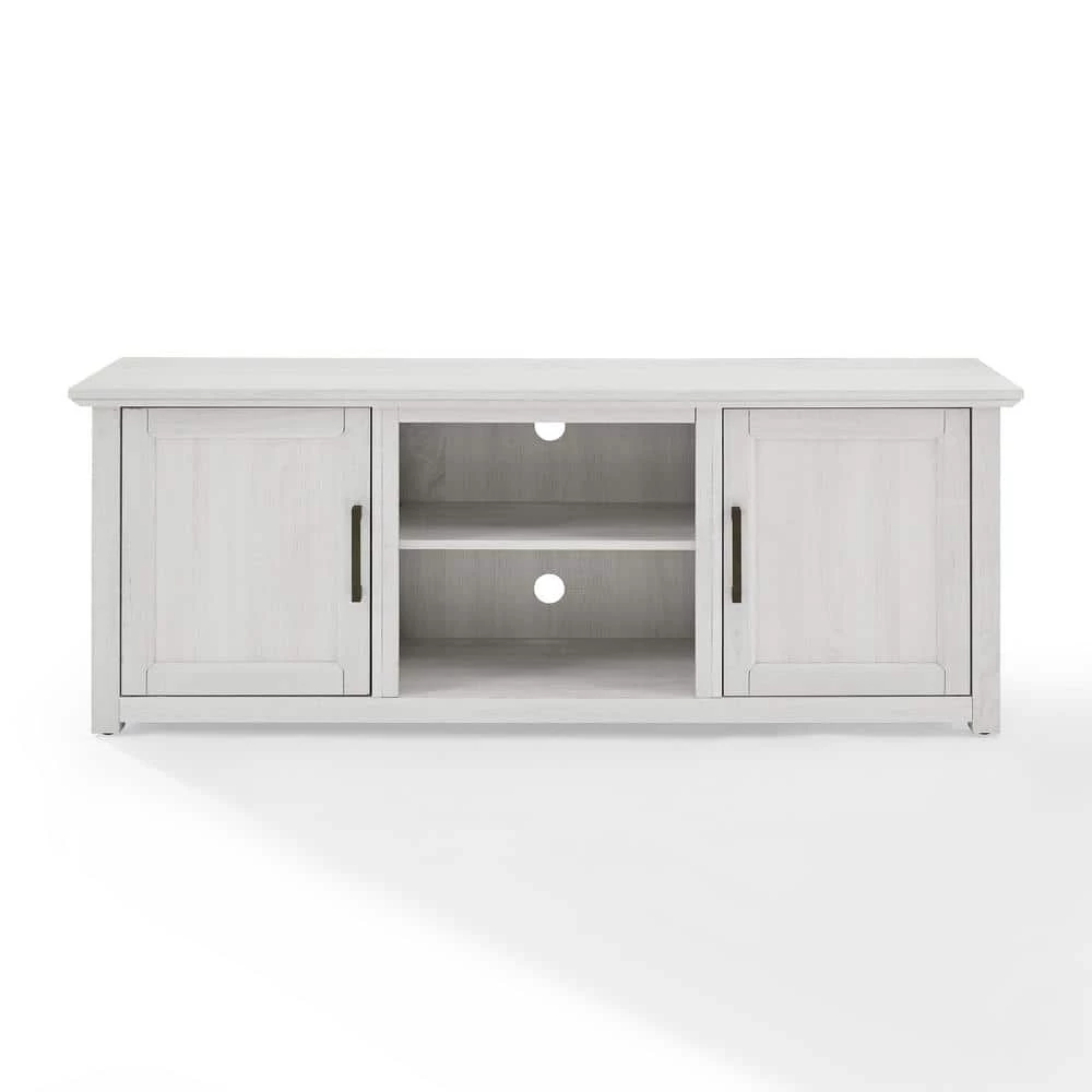 Gather together for a family movie night with the Camden 58 in. Low Profile TV Stand. This TV stand features two cabinets with an adjustable shelf in each, offering ample storage for your books, video games, or other media. The open storage in the center has an adjustable and removable shelf, plus two pre-cut holes in the back for cable management. Sized to fit most TV’s up to 60 in., the Camden 58 in. Low Profile TV Stand exudes rustic style with the look of wood-grain and substantial metal hardware.