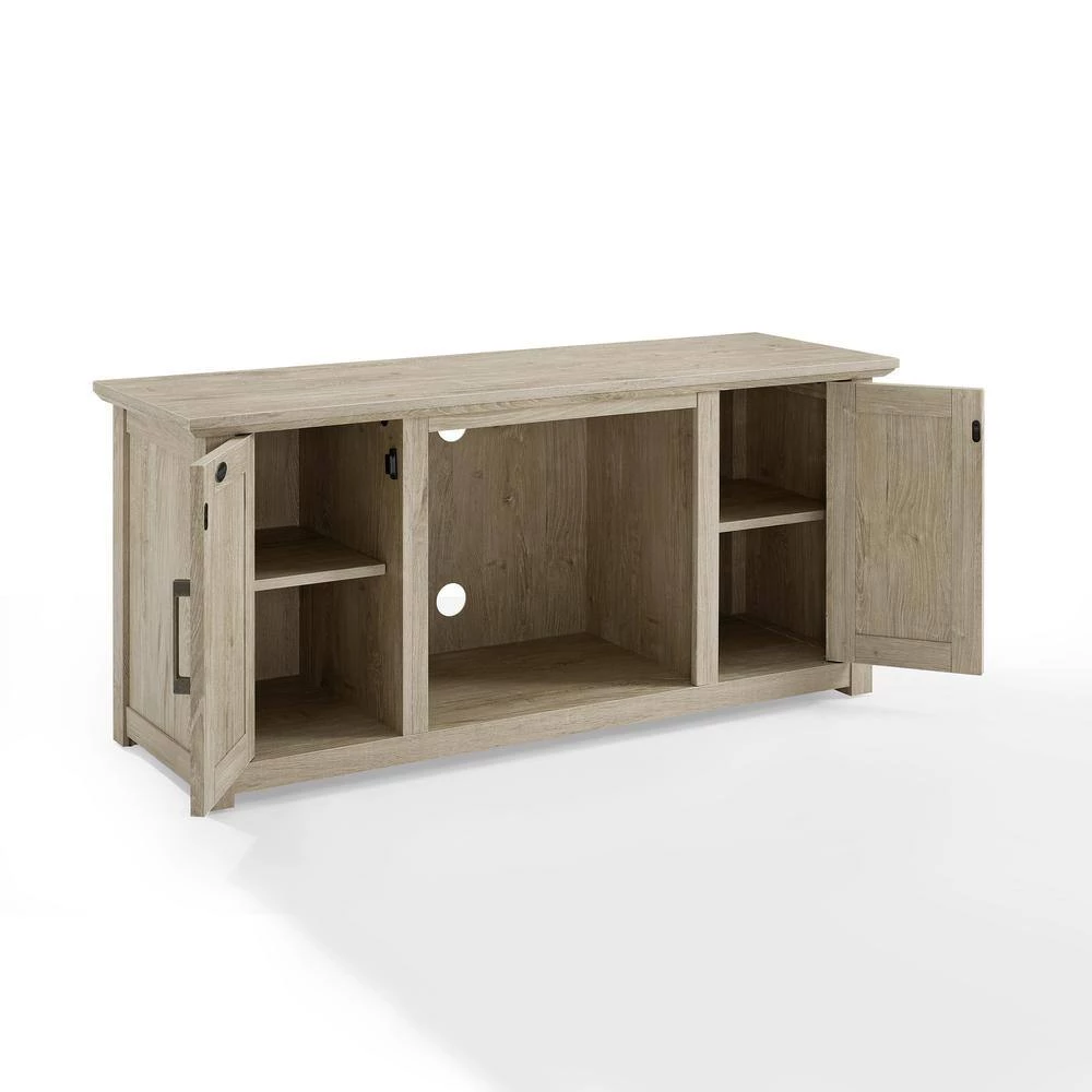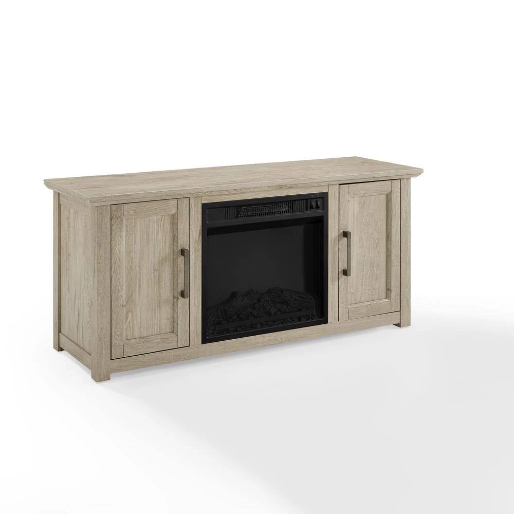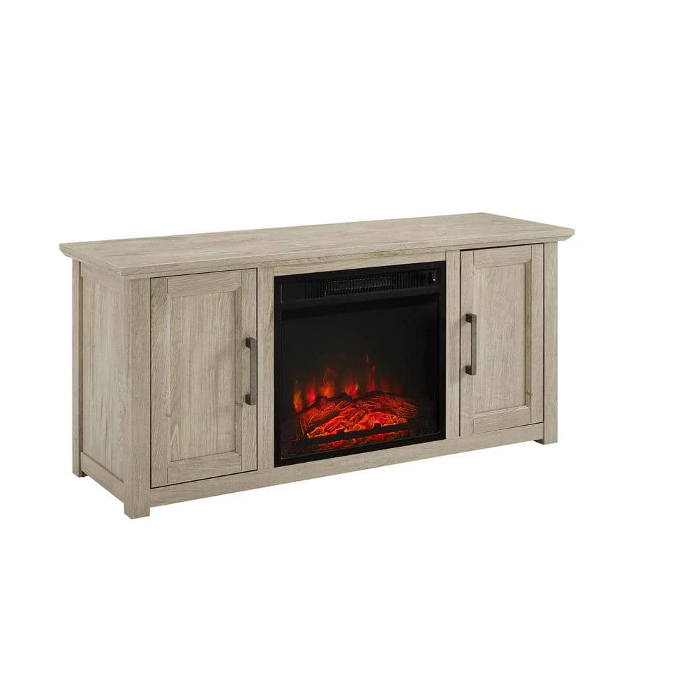 Cozy up for a relaxing evening with the Camden 48 in. Low Profile TV Stand and fireplace. This TV stand looks great showcasing your television while keeping media necessities hidden away. Each cabinet features an adjustable shelf that adapts to your storage needs. With an electric firebox in the center compartment, this TV stand doubles as a modern-day hearth, able to heat approximately 400 square feet of your home. Sized to fit most TV’s up to 50 in., the Camden 48 in. Low Profile TV Stand with fireplace exudes rustic style with the look of wood-grain and substantial metal hardware.