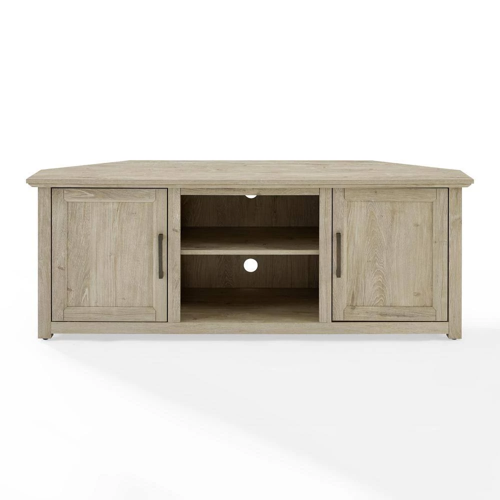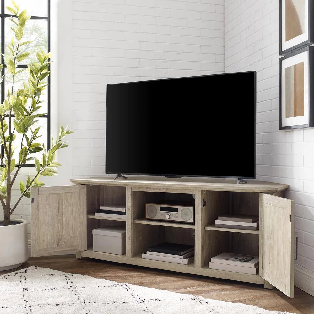 Ideal for smaller living spaces, the Camden 58 in. Corner TV Stand tucks neatly into any corner. Featuring two cabinets with an adjustable shelf in each, this stand is ready to corral your books, video games or other media. The open storage in the center offers an adjustable and removable shelf with two pre-cut holes in the back for cable management. Sized to fit most TV’s up to 60 in., the Camden 58 in. Low Profile TV Stand exudes rustic style with the look of wood-grain and substantial metal hardware.