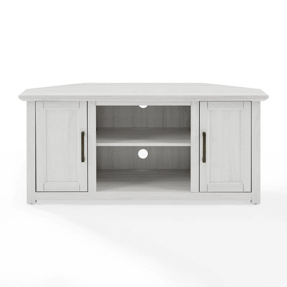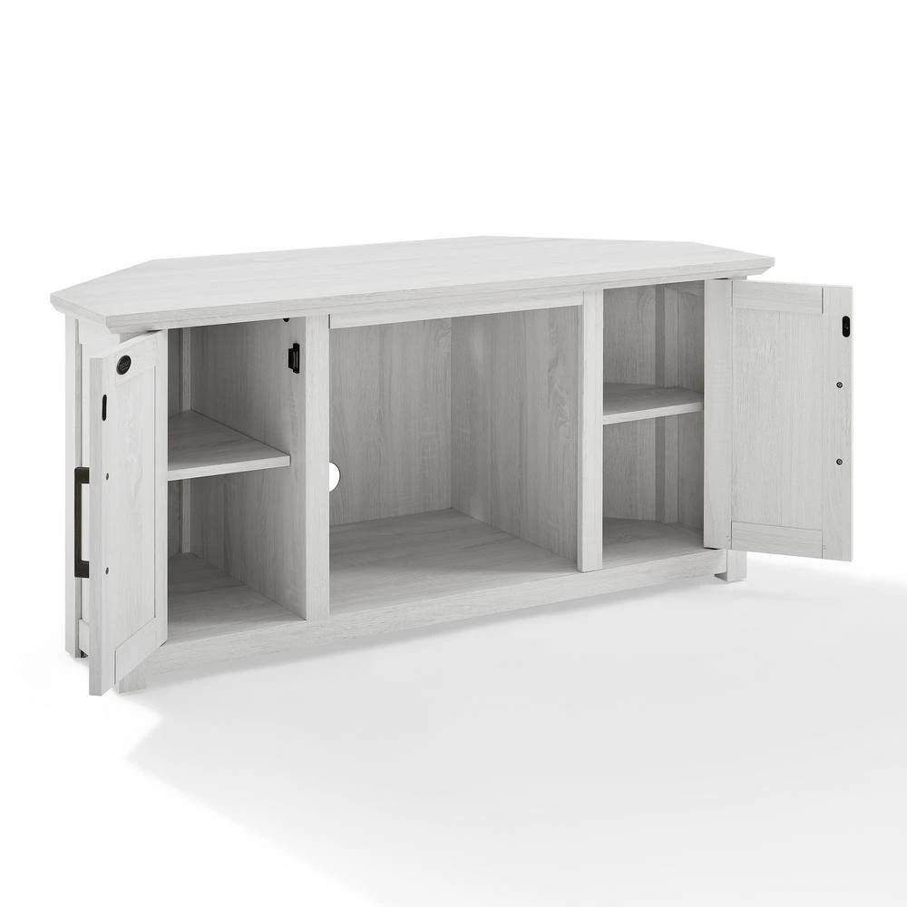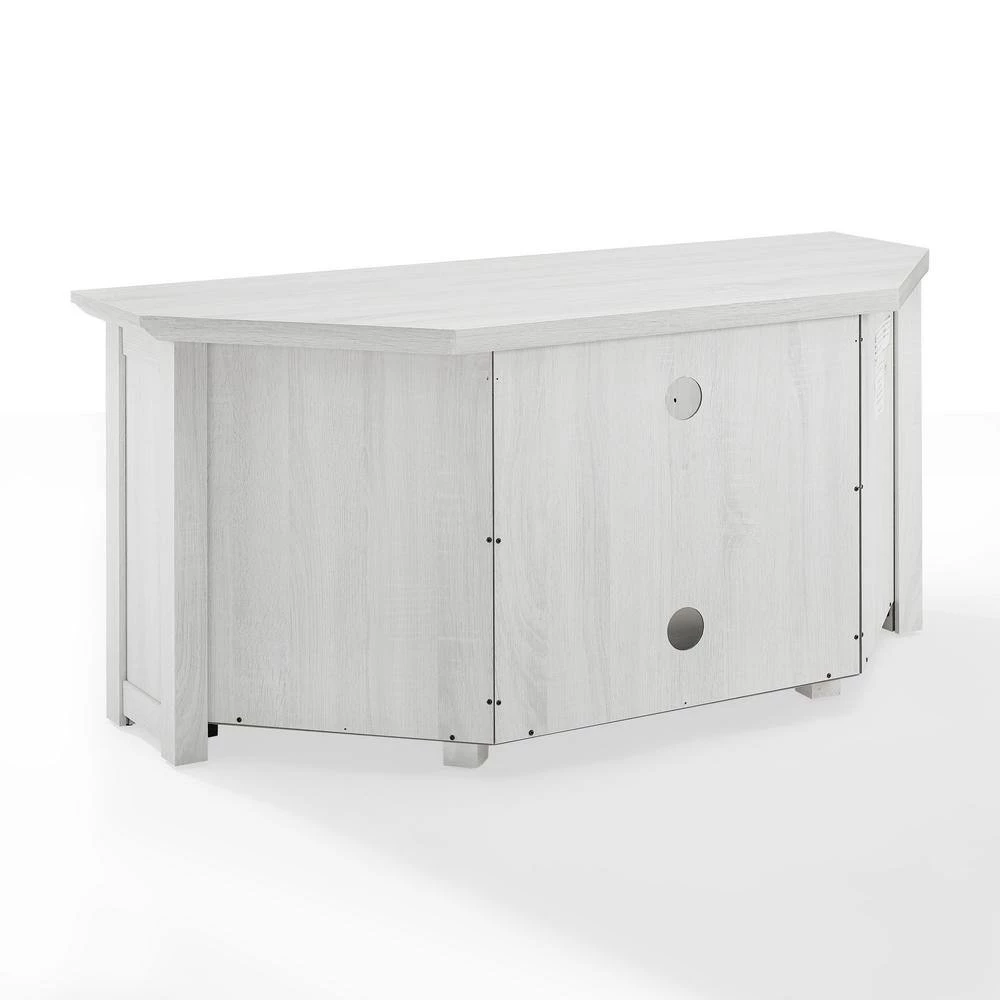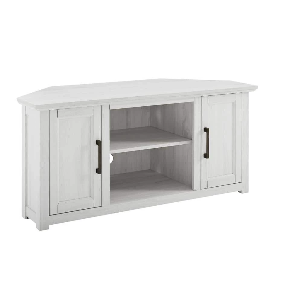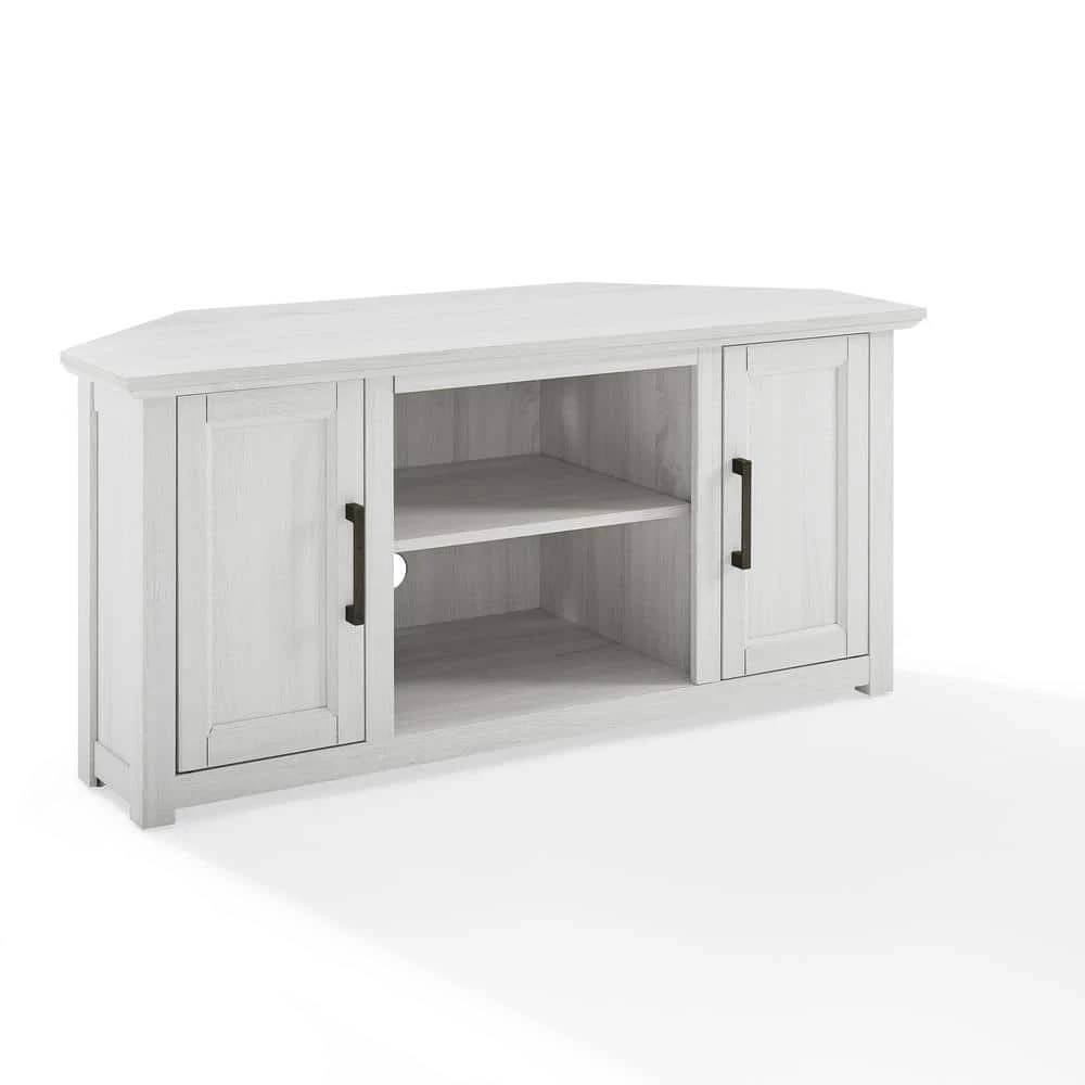 Ideal for smaller living spaces, the Camden 48 in. Corner TV Stand tucks neatly into any corner. Featuring two cabinets with an adjustable shelf in each, this stand is ready to corral your books, video games or other media. The open storage in the center offers an adjustable and removable shelf with two pre-cut holes in the back for cable management. Sized to fit most TV’s up to 50 in., the Camden 48 in. Corner TV Stand exudes rustic style with the look of wood-grain and substantial metal hardware.
