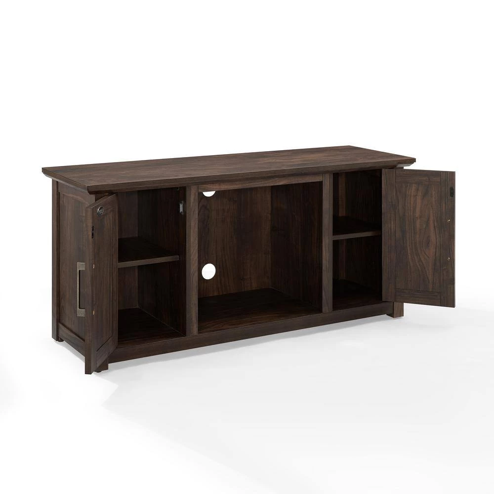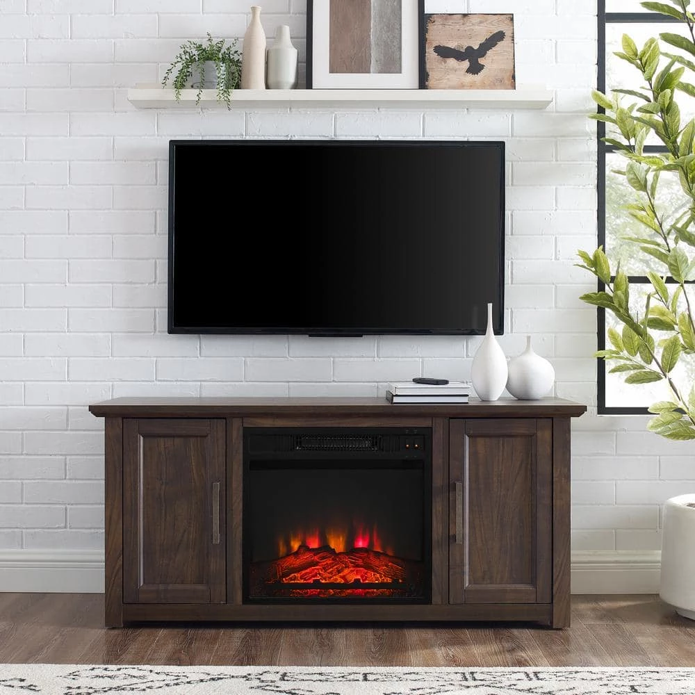 Cozy up for a relaxing evening with the Camden 48 in. Low Profile TV Stand and fireplace. This TV stand looks great showcasing your television while keeping media necessities hidden away. Each cabinet features an adjustable shelf that adapts to your storage needs. With an electric firebox in the center compartment, this TV stand doubles as a modern-day hearth, able to heat approximately 400 square feet of your home. Sized to fit most TV’s up to 50 in., the Camden 48 in. Low Profile TV Stand with fireplace exudes rustic style with the look of wood-grain and substantial metal hardware.