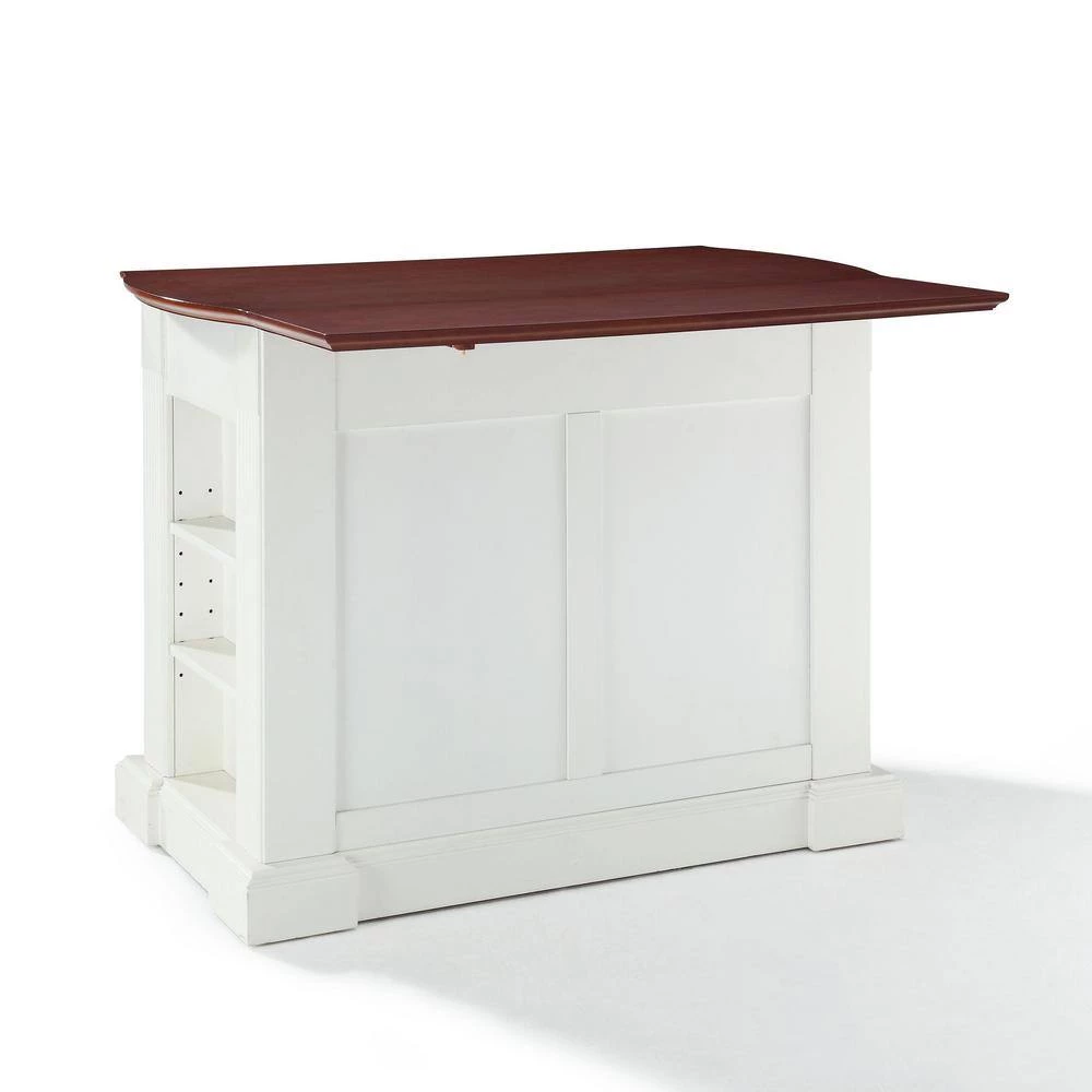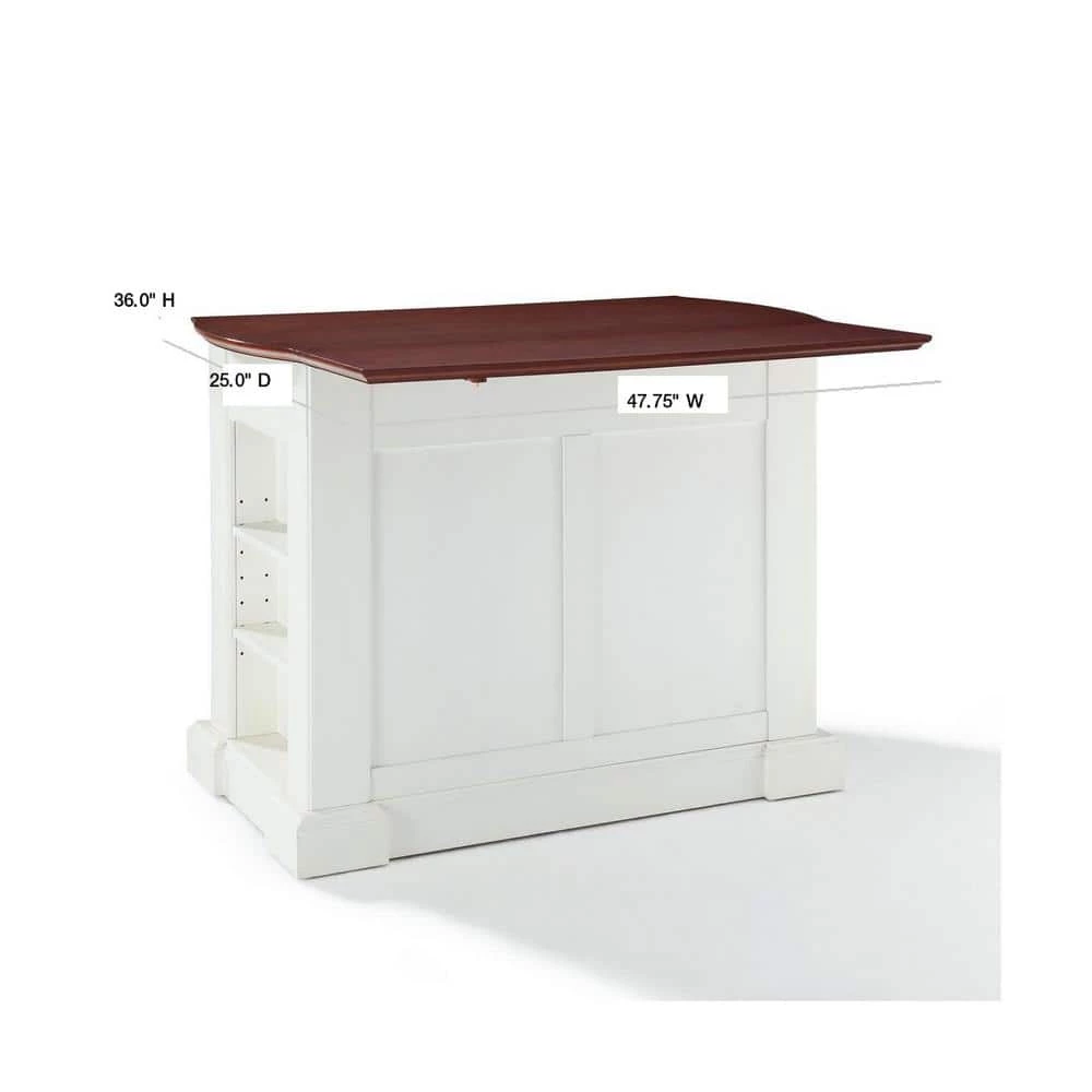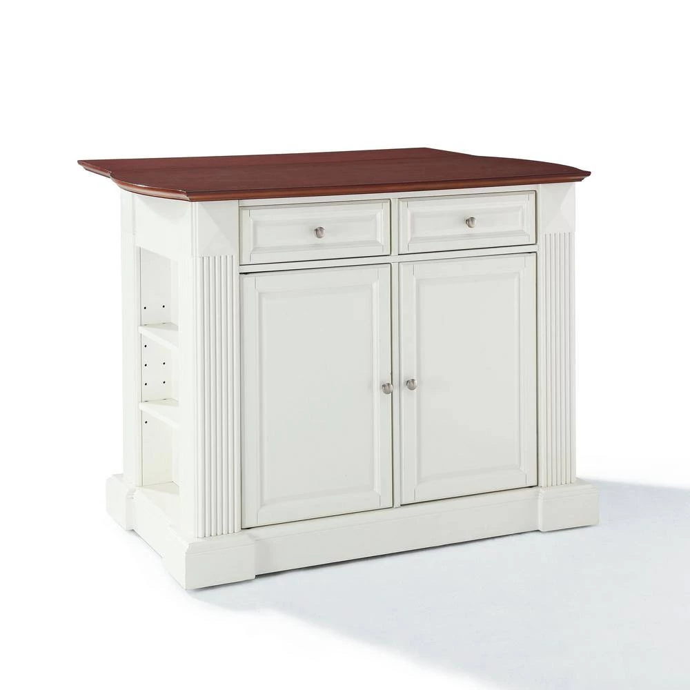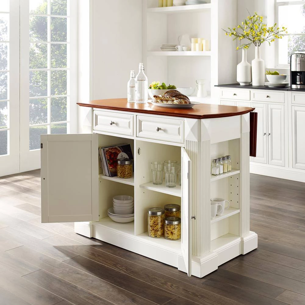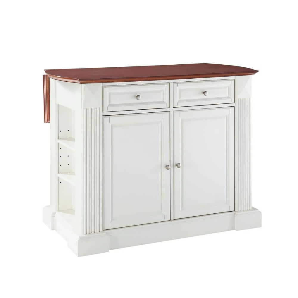 Constructed of solid hardwood and wood veneers, this kitchen island is designed for longevity. The handsome raised panel doors and drawer fronts provide the ultimate in style to dress up any culinary space. Raise the drop leaf to expand your serving space, or just sit at the breakfast bar and eat your meal. Behind the doors, you will find adjustable shelves and an abundance of storage space for objects youd prefer to keep hidden. Open storage on both ends provides easy access to frequently used items, and is perfect for displaying decorative objects. Raised diamond accents and fluted pilasters are sure to impress your guests. Style, function, and quality make this kitchen island a wise addition to your home.