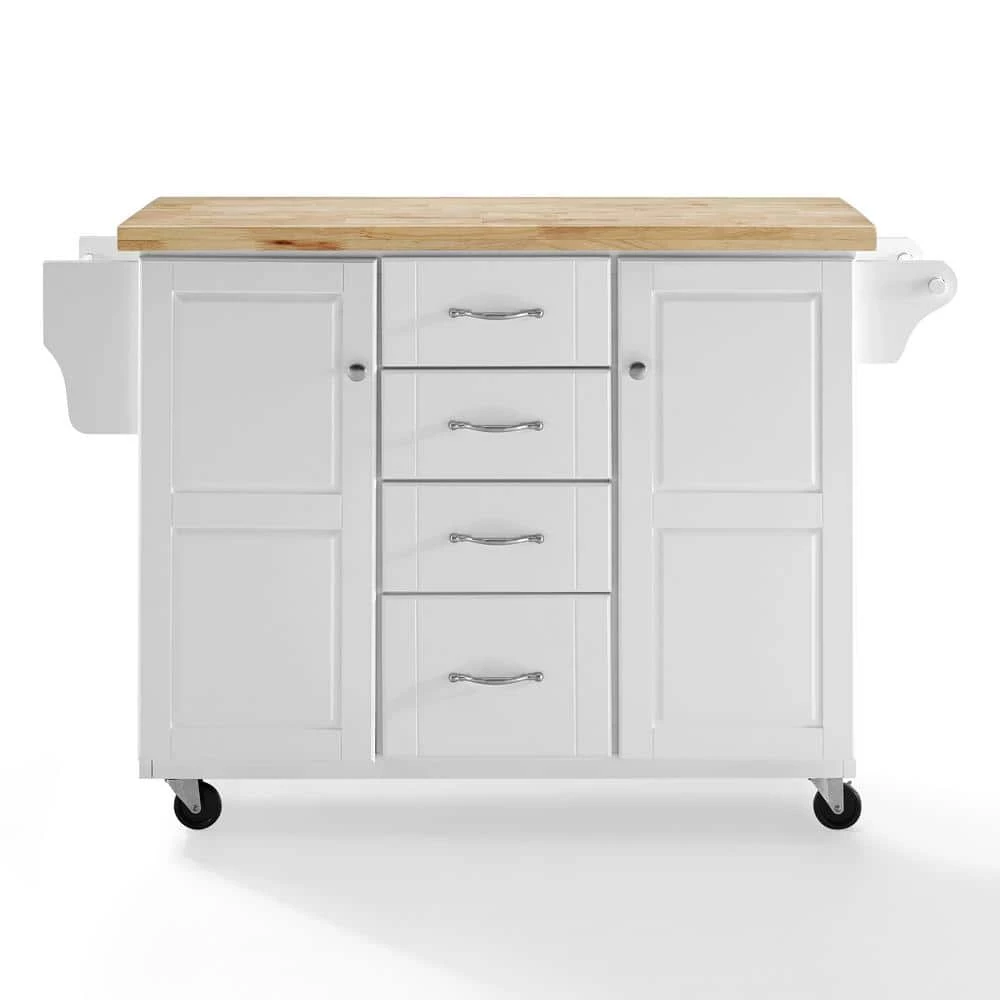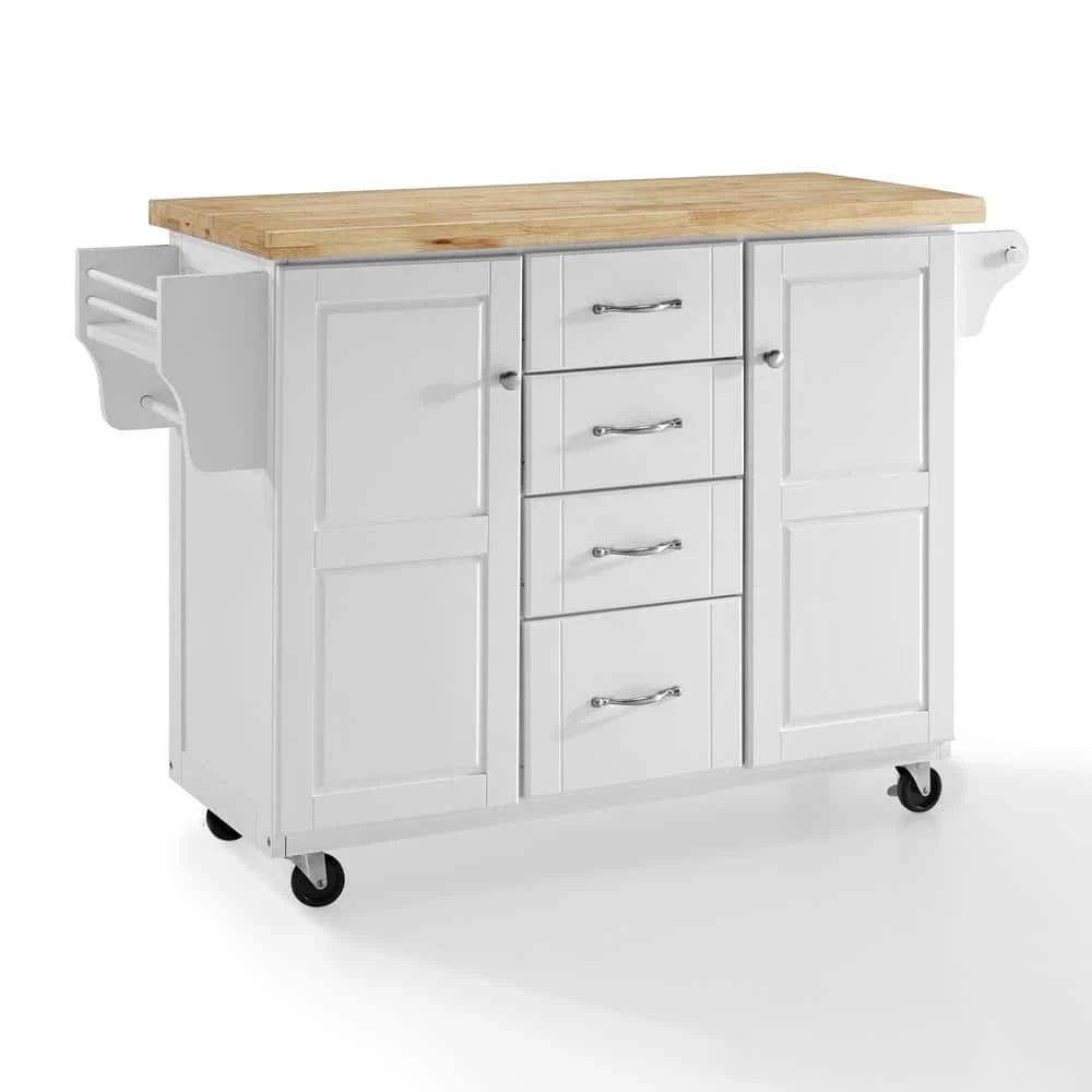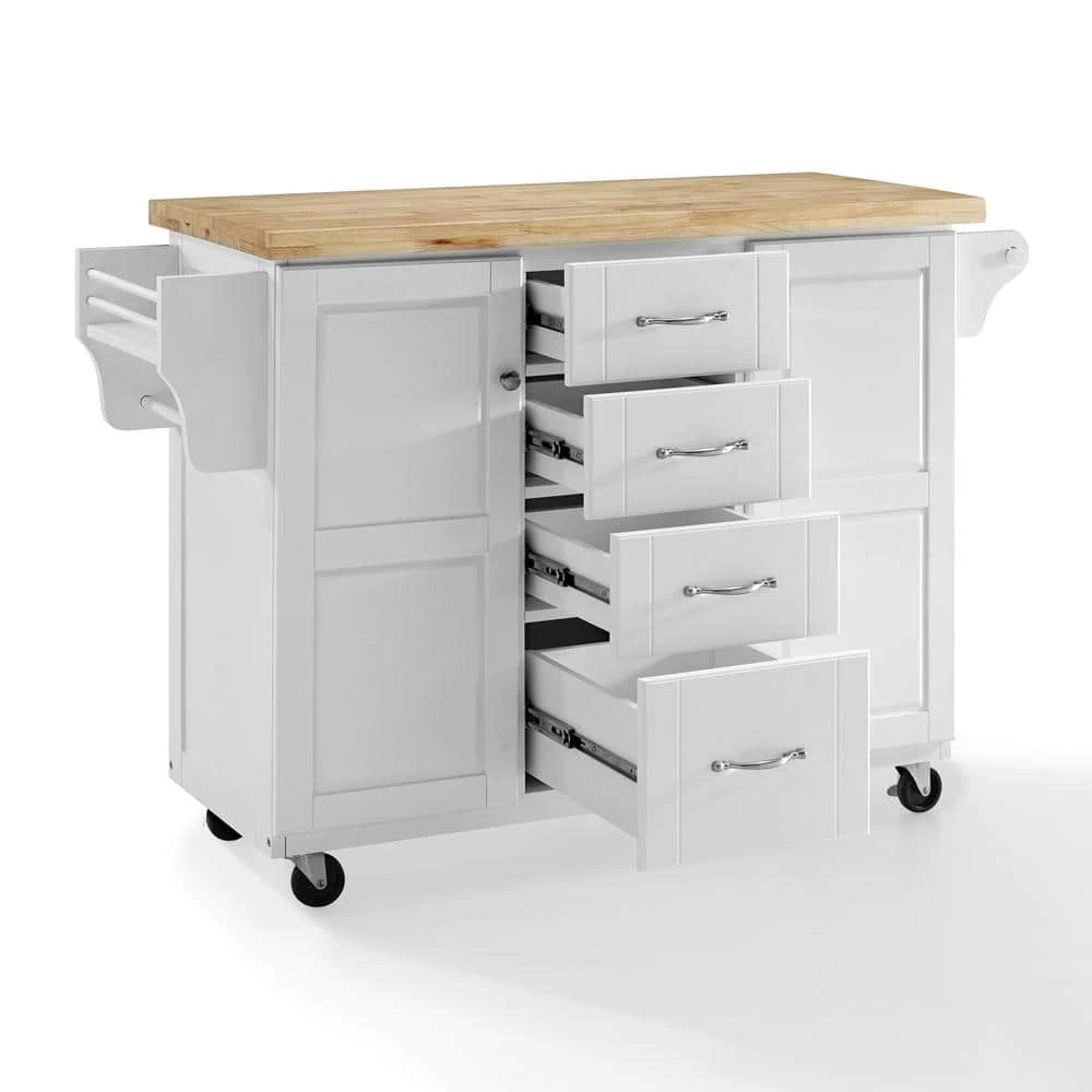 Prepare all your meals with ease using our Elliott Kitchen Cart. This cart features a natural wood built up top and numerous storage options to stow away all your prepping utensils. There are four spacious drawers and two cabinets along with a spice rack and towel rack on the ends. Constructed of solid hardwood and veneers with castors for mobility this sturdy cart will complement your kitchen decor while also providing much needed functionality.