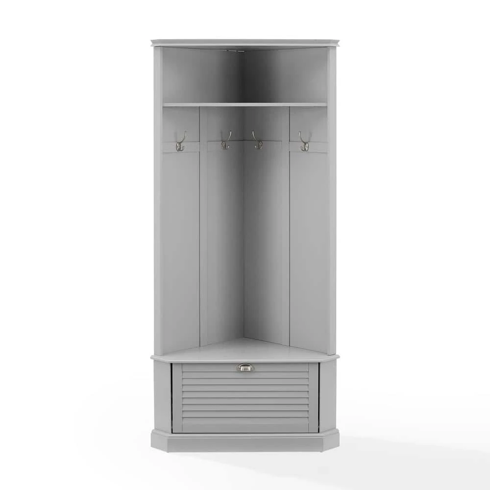 Keep your home’s entryway tidy and organized with the Ellison Corner Hall Tree. Featuring louvered accents on the drop-down cabinet door and raised paneling on the back, this hall tree gives home organization a classic look. This hall tree’s corner-hugging design makes it the perfect coat rack and landing zone for any size entryway. With hooks for hats and a lower cabinet for shoes, the Ellison Corner Hall Tree offers stylish storage wherever it goes.