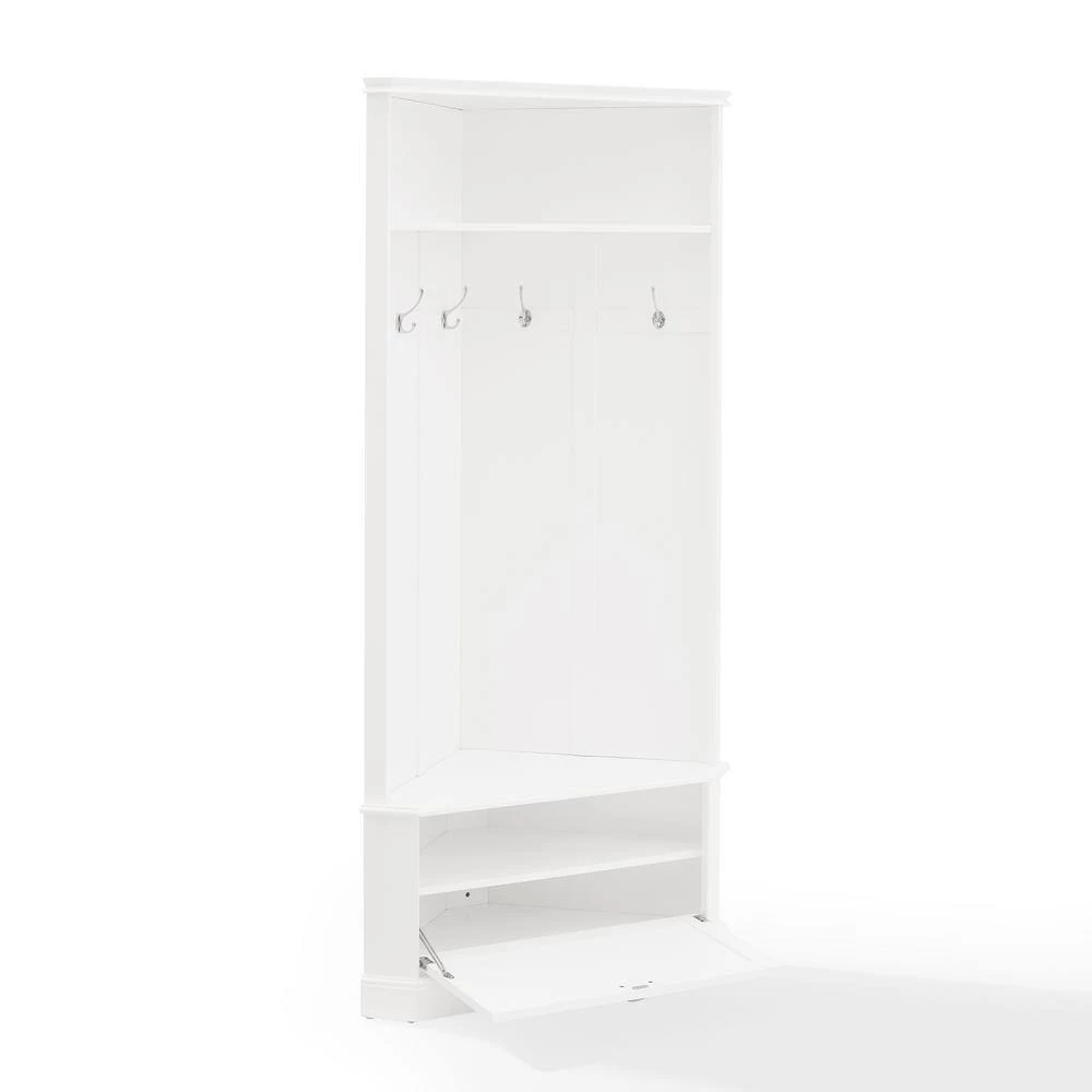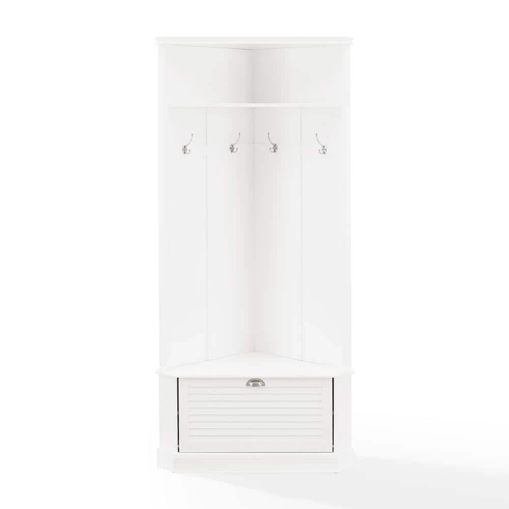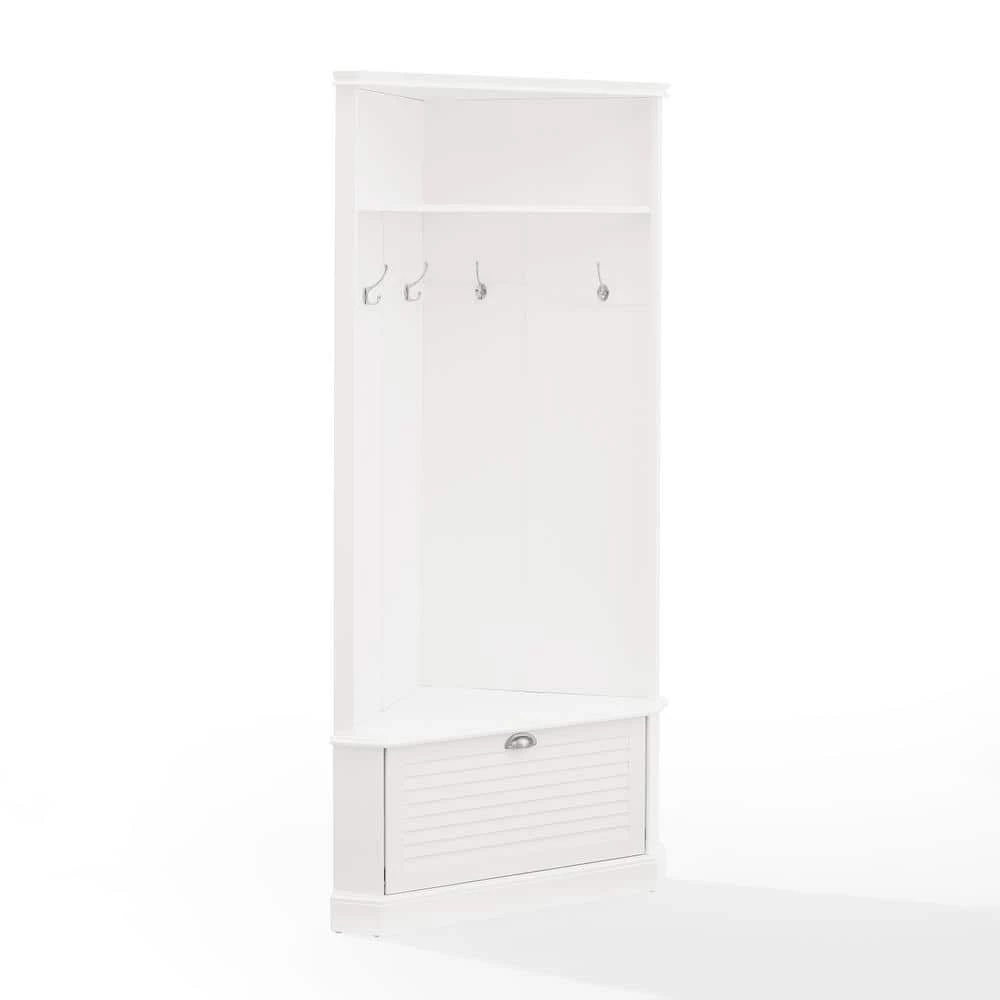 Keep your home’s entryway tidy and organized with the Ellison Corner Hall Tree. Featuring louvered accents on the drop-down cabinet door and raised paneling on the back, this hall tree gives home organization a classic look. This hall tree’s corner-hugging design makes it the perfect coat rack and landing zone for any size entryway. With hooks for hats and a lower cabinet for shoes, the Ellison Corner Hall Tree offers stylish storage wherever it goes.