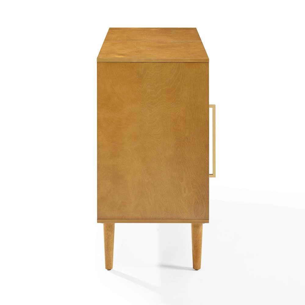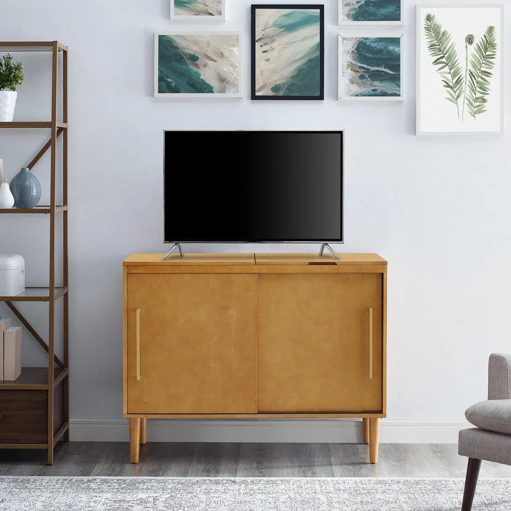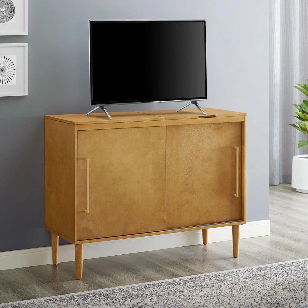 Add polish and style to your home with the sleek mid-century modern design of the Everett Media Console. Whether you need a home for your favorite turntable and album collection or a stylish accent cabinet, this media console has the versatility to fit the bill. Featuring sliding cabinet doors that open to adjustable shelving on one side, and album storage on the other, the Everett Media Console is a perfect storage solution for your home.