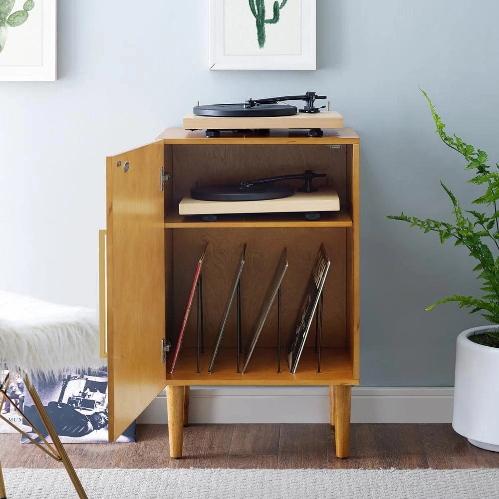 The classic mid-century modern design of the Everett Record Player Stand is the perfect complement to your treasured turntable and precious vinyl. Sized perfectly to accommodate most component-style record players, this stand is as functional as it is stylish. Tucked behind the cabinet door are wire record dividers and an adjustable shelf for storing accessories or a second turntable, making the Everette Record Player Stand a must have for any vinyl enthusiast.