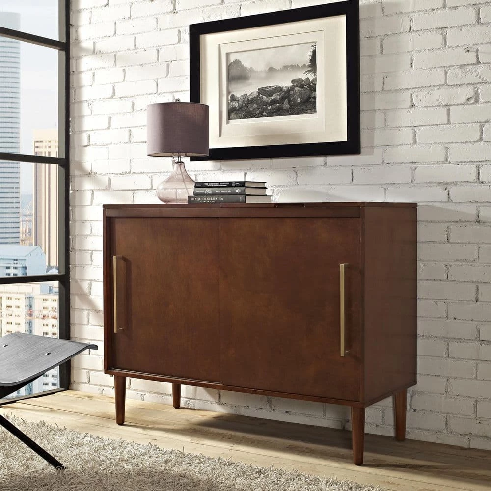 Add polish and style to your home with the sleek mid-century modern design of the Everett Media Console. Whether you need a home for your favorite turntable and album collection or a stylish accent cabinet, this media console has the versatility to fit the bill. Featuring sliding cabinet doors that open to adjustable shelving on one side, and album storage on the other, the Everett Media Console is a perfect storage solution for your home.