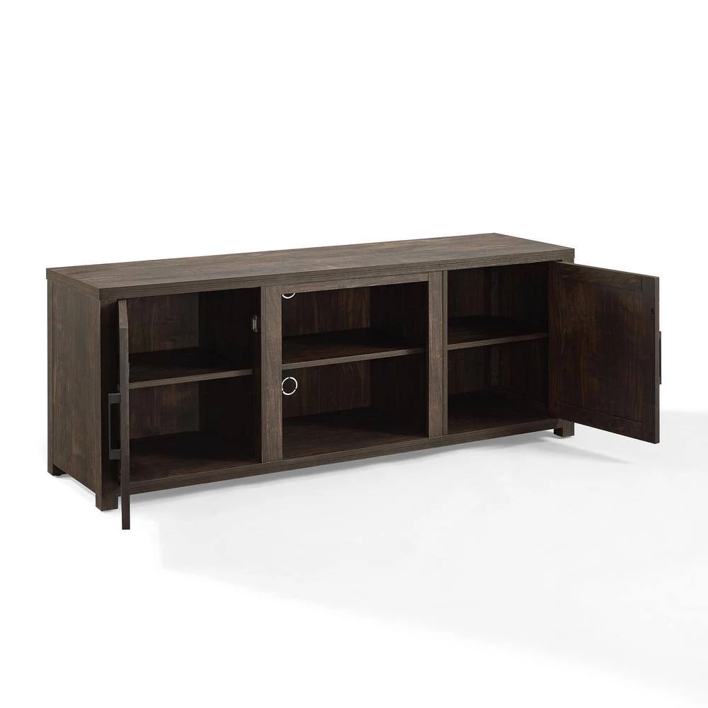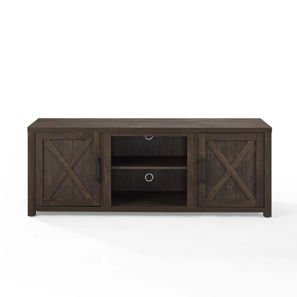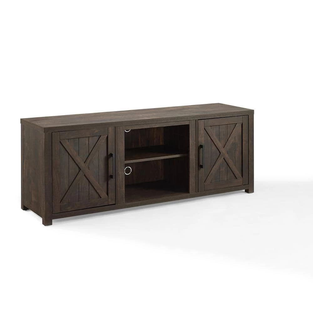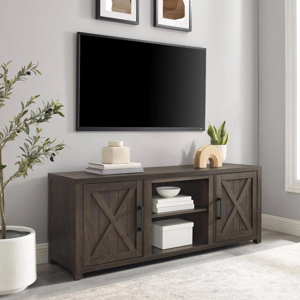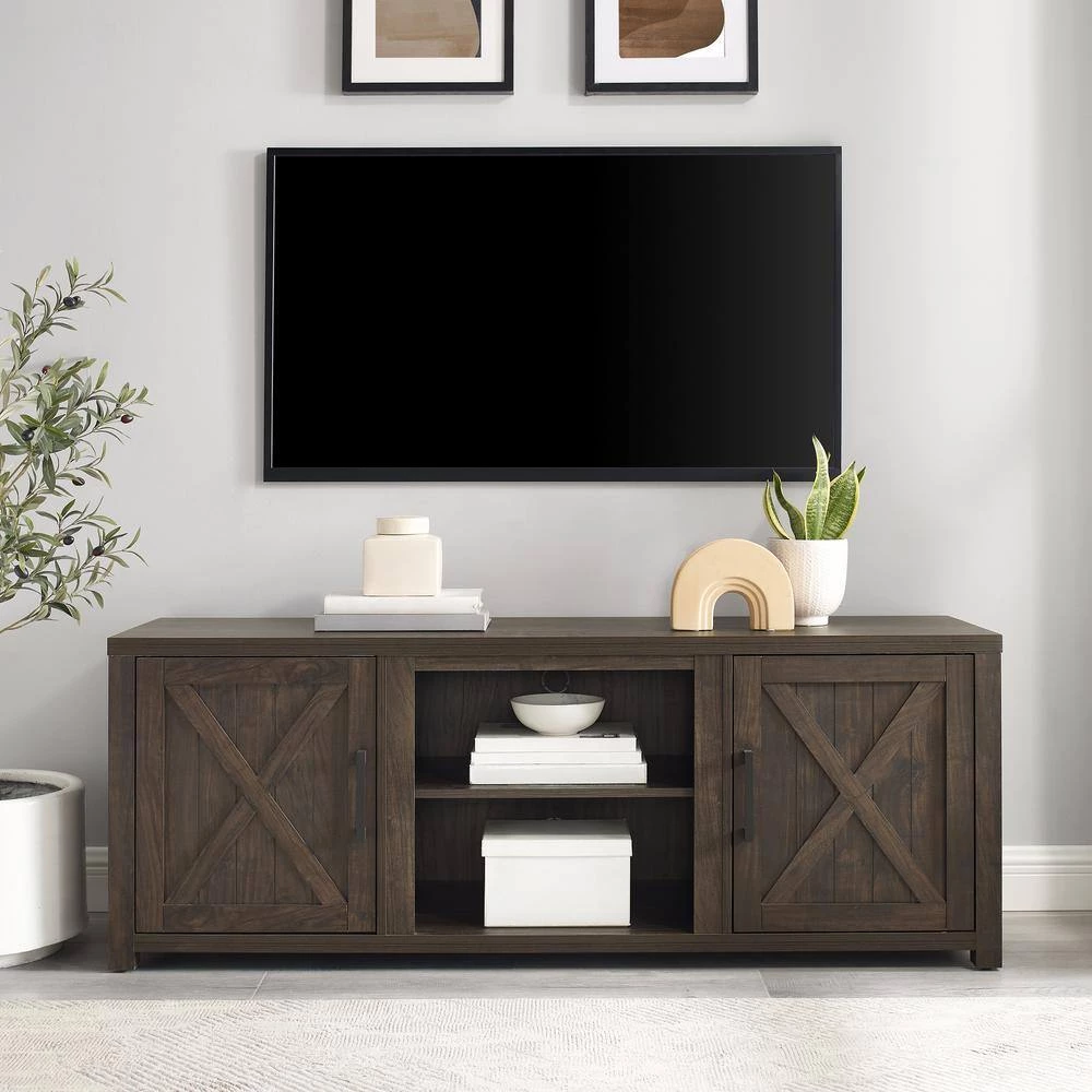 Ever-trending modern farmhouse design meets functional home entertainment with the Gordon 58 in. Low-Profile TV Stand. Echoing the rustic charm of a classic barn door, the cabinet doors feature a slatted look with an x-motif. Adjustable shelving in the cabinets and center compartment offers flexible space for media components. Ideal for TVs up to 65 in., the Gordon TV Stand will make a beautiful focal point in any room.