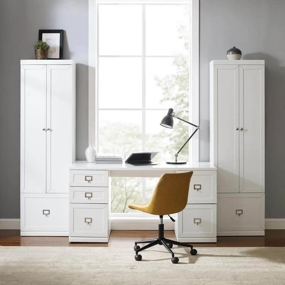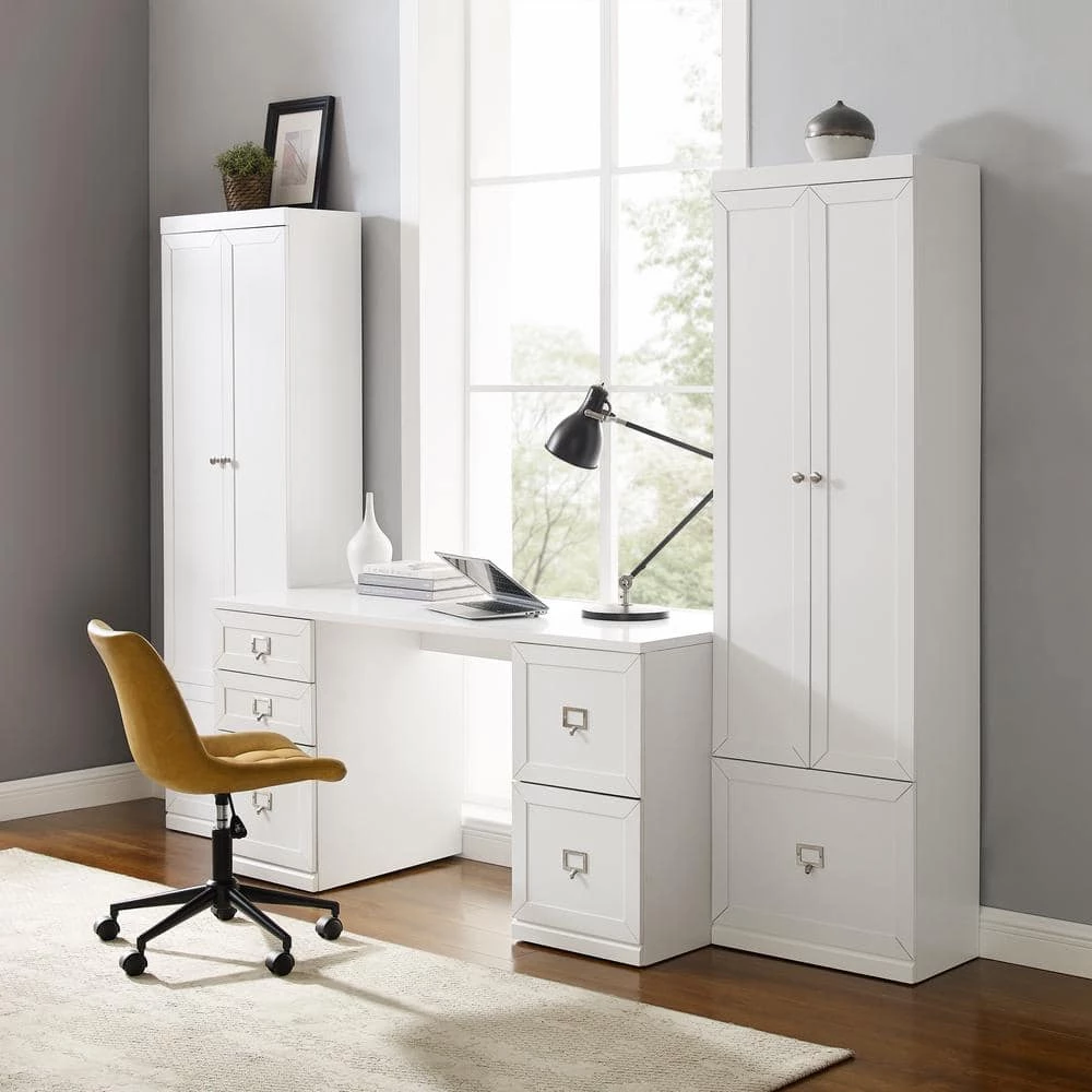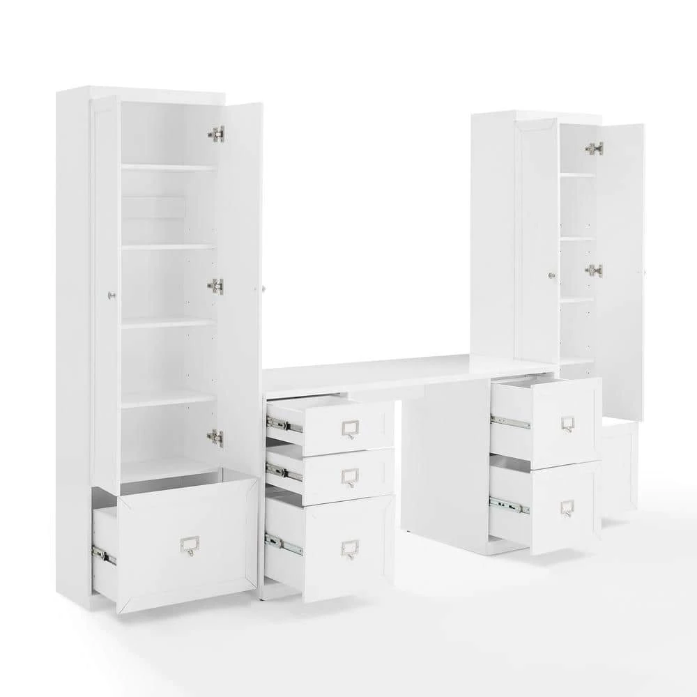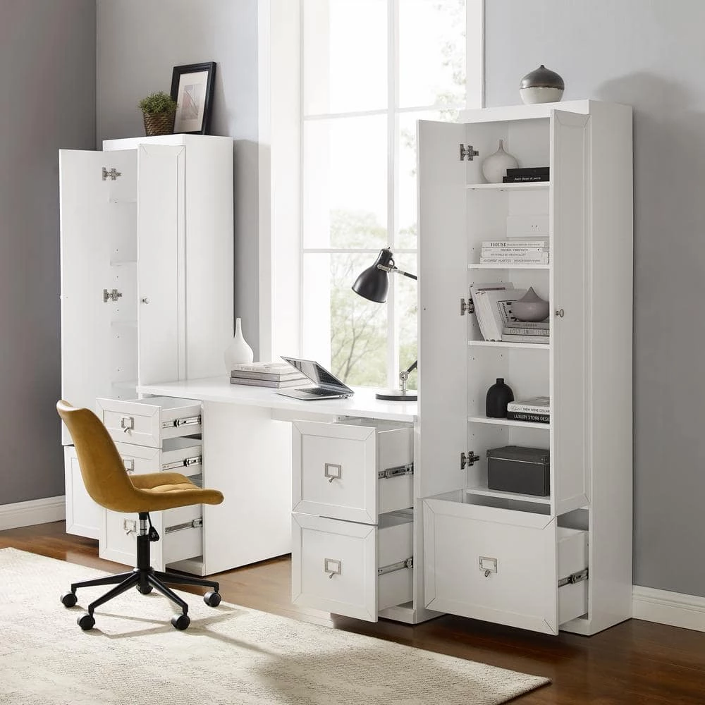 Maximize your productivity and organization with the Harper 3-piece Desk Set. Featuring four full-extension drawers and three file cabinet drawers, this set is a telecommuter’s dream. Important documents can be filed away, while larger items can be stored on the hooks and shelves of the bookcase storage cabinets. The spacious desktop has plenty of room for a laptop and other office supplies. With its sleek, modular design, the Harper desk set offers versatility for expanding your home office and creating a space tailored to your needs.