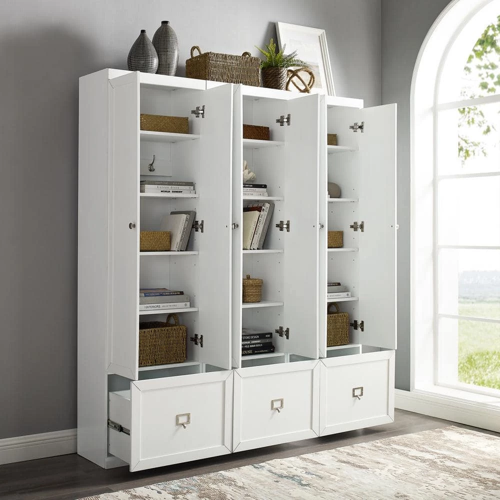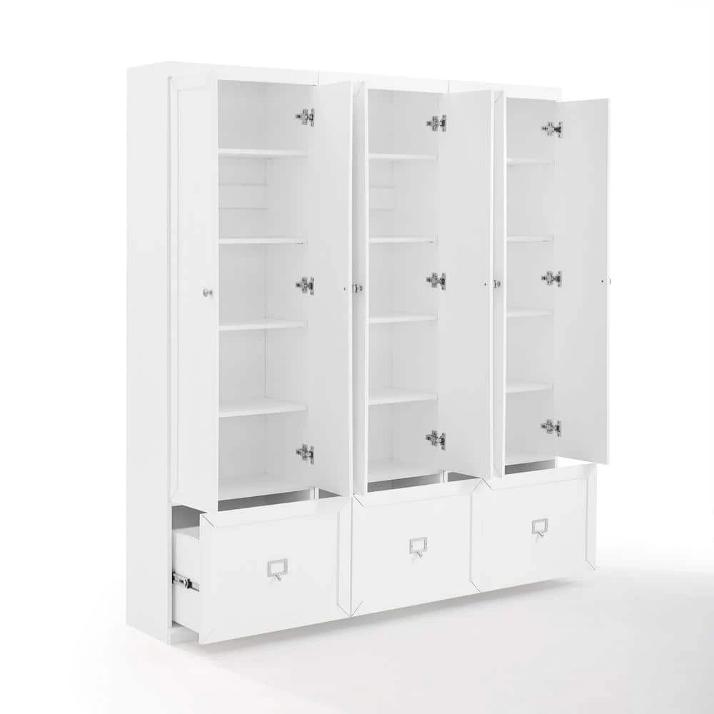 With all the storage of classic built-in cabinetry, the Harper 3-piece Entryway Set is the versatile home organization set you need. Featuring three pantry closets side by side, this modular set can adapt to the ever-changing needs of a bustling household. Each unit has 3-adjustable and removable shelves inside the cabinet. By removing the shelves within the cabinets you can install the hooks for hanging storage in an entryway or mudroom. The finishing touches are three full-extension storage drawers with label holder hardware that can be customized with personal labels. The Harper 3-piece Entryway Set is modular in design and can pair with other items within the collection.