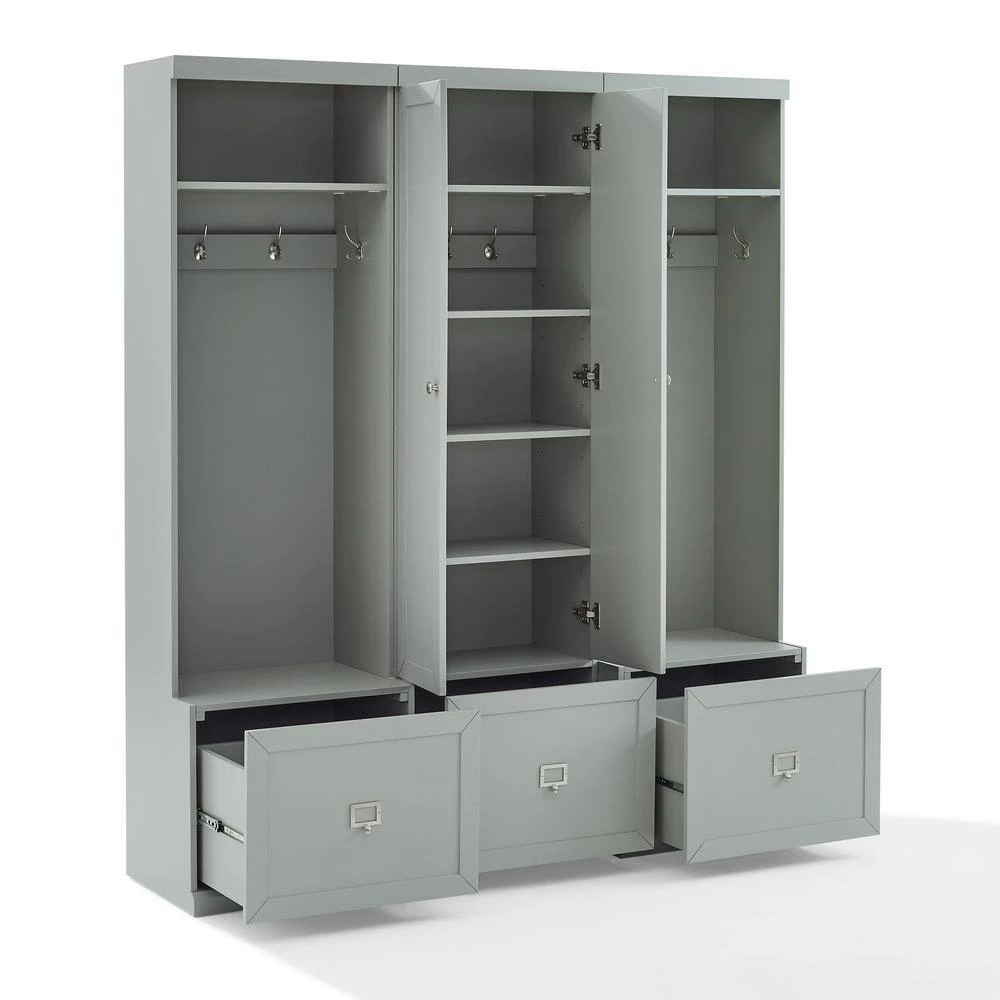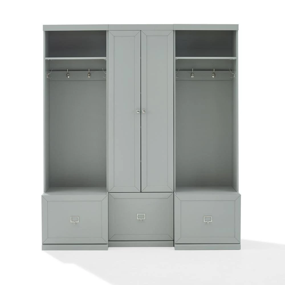 Take your home organization to the next level with the Harper 3pc Entryway Set. Comprised of two hall trees flanking either side of a pantry closet, this set is a multi-functional dream. Each hall tree offers open hanging storage with four large double hooks, plus an open-top shelf to tuck small storage baskets. The pantry closet houses three adjustable and removable shelves that can adapt to a variety of storage needs. When you remove the shelves you can install the large double hooks for hanging storage. Both the hall trees and pantry closet feature large full-extension storage drawers with label holder hardware that can be customized with personal labels. The Harper 3pc Entryway Set can pair modularly with other items in the collection and create the look of genuine built-in storage.