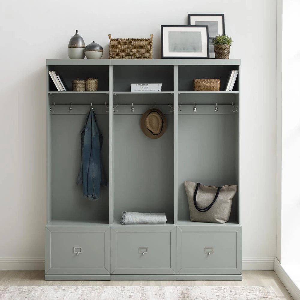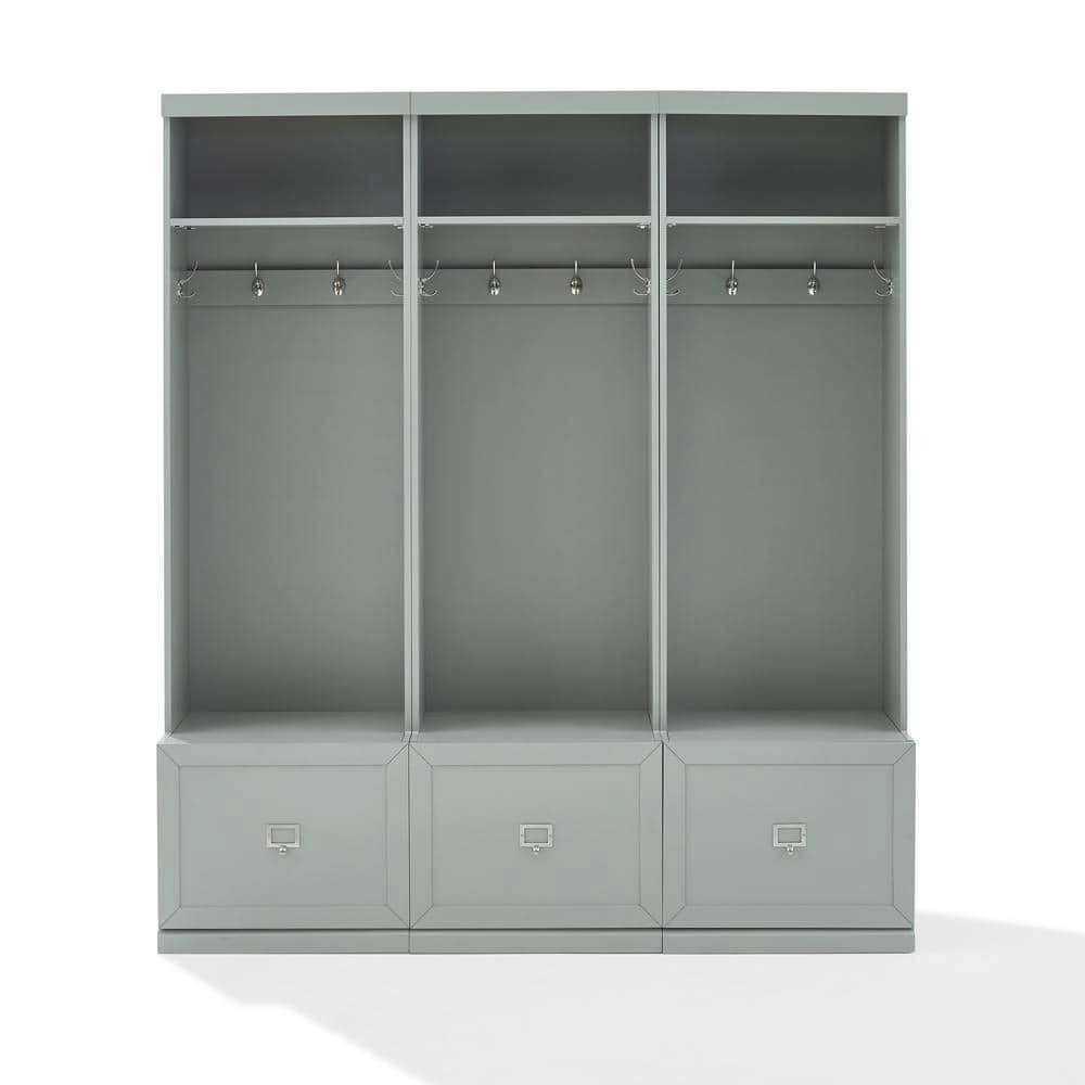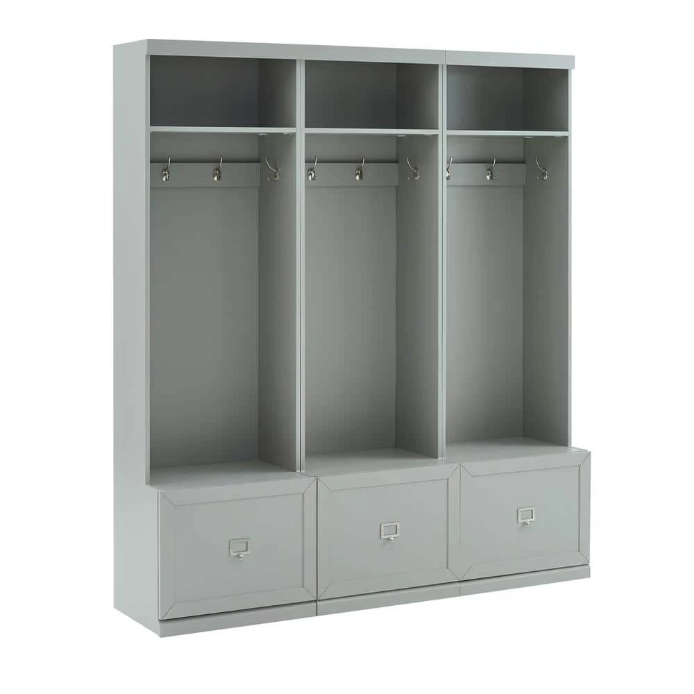 Tame your tumultuous entryway with the Harper 3pc Entryway Set. Comprised of three slim hall trees side by side, this set is a home organization dream. A total of 12 classic double hooks will provide hanging storage for coats, hats, and book bags. Three full-extension storage drawers with label holder hardware can be customized with personal labels. The three upper shelves are ideal for small storage baskets to hold your wallet, phone, and keys. The Harper 3pc Entryway Set can pair modularly with other items in the collection and create the look of genuine built-in storage.