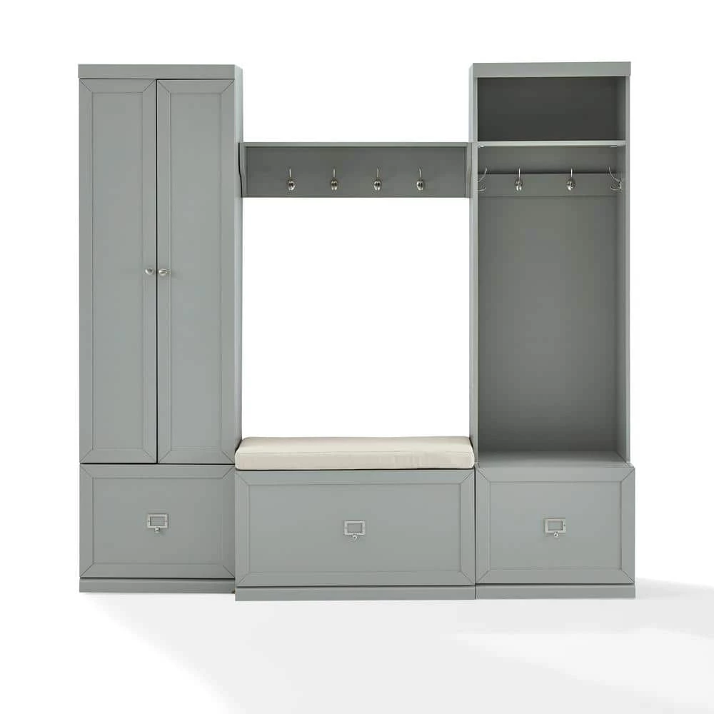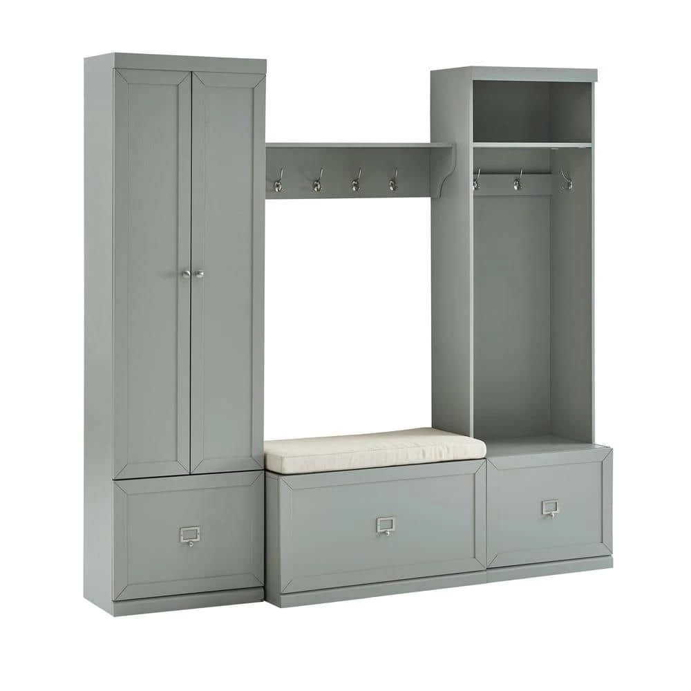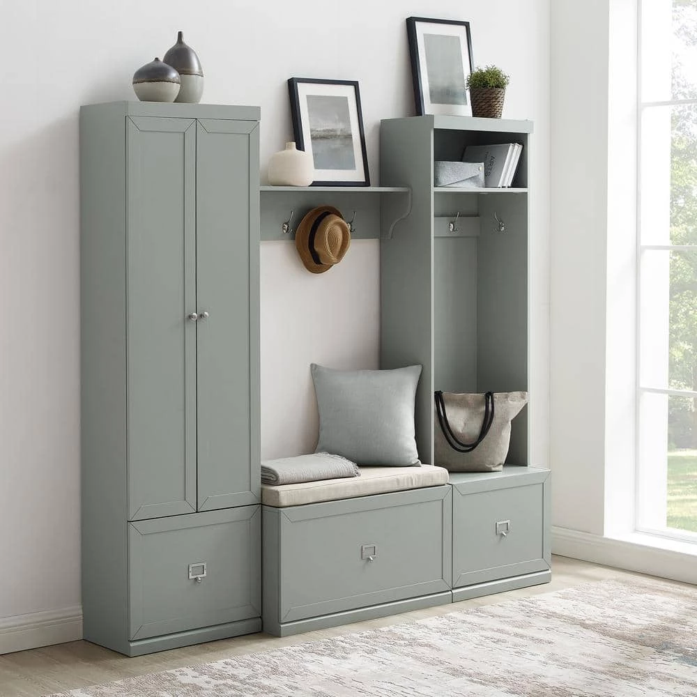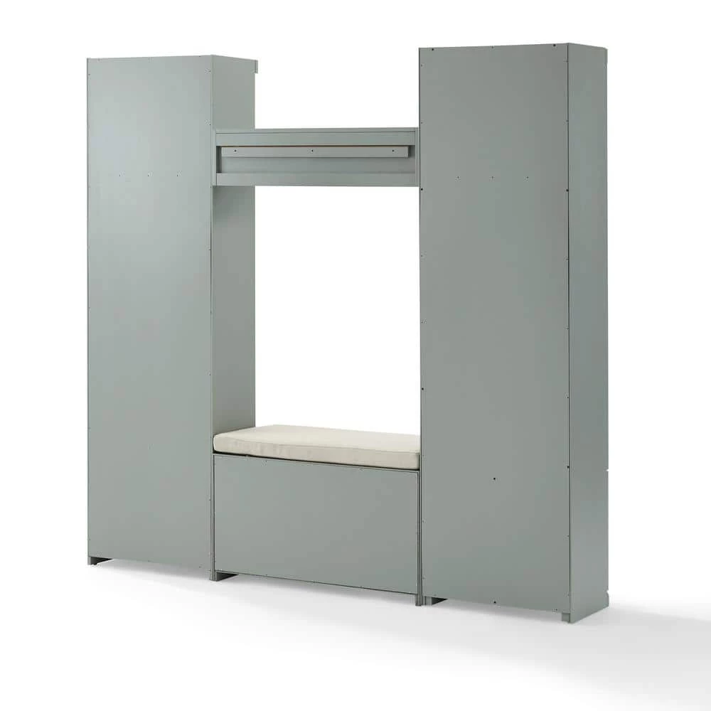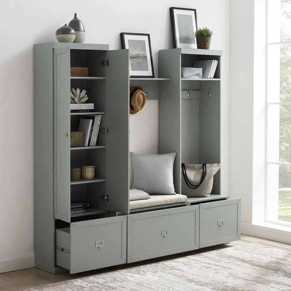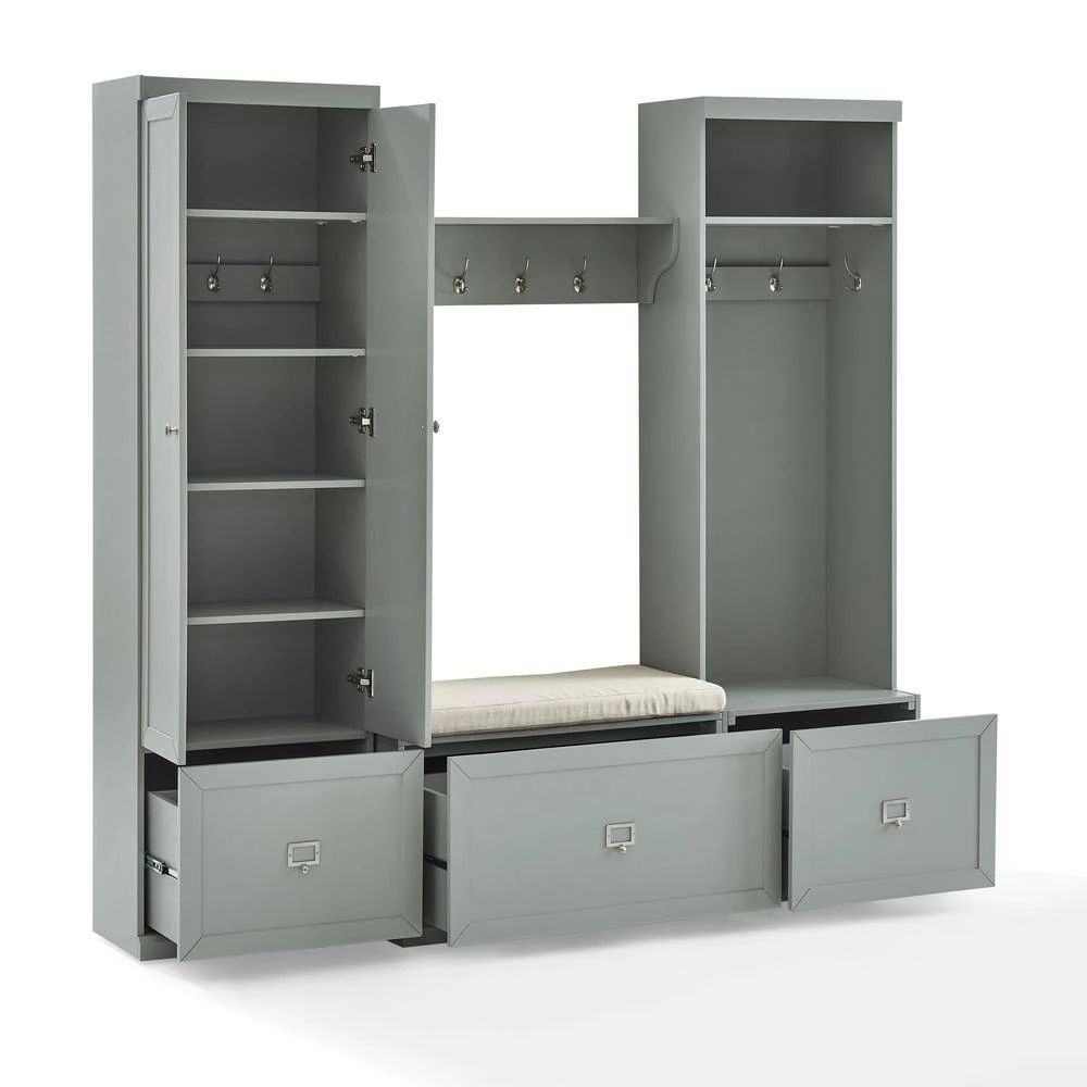 The Harper 4-piece Entryway Set offers a great combination of storage solutions for your foyer or mudroom. The pantry closet provides adjustable and removable shelves, plus a full-extension drawer in the base. Without the shelves, the pantry closet offers hanging storage when you install the optional hooks. The hall tree also provides hooks for coats and hats and another full-extension drawer. An entryway bench with a cushioned seat and a wall-mounted shelf sits at the center of the set. Featuring label holder hardware, each storage drawer can be customized with personal labels. Every component of the Harper 4-piece Entryway Set is modular, allowing for flexibility and the look of genuine built-in storage.