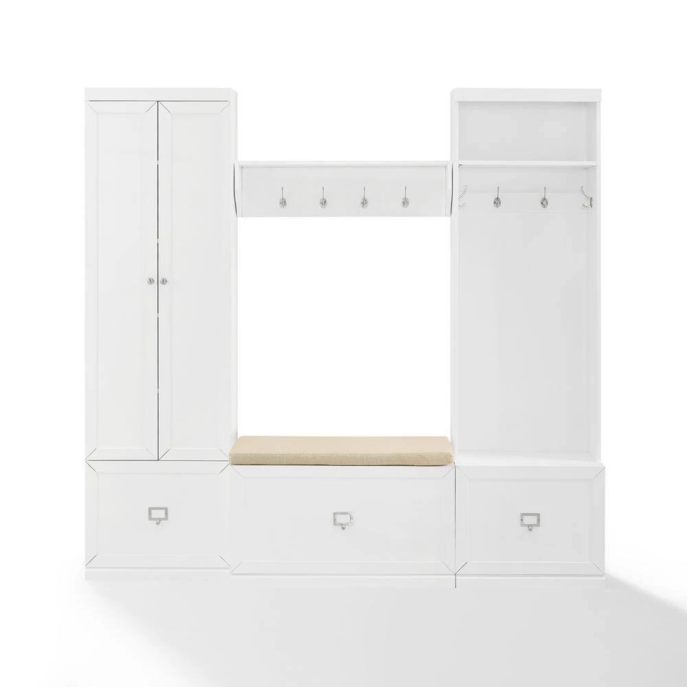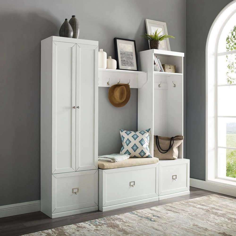 The Harper 4pc Entryway Set offers a great combination of storage solutions for your foyer or mudroom. The pantry closet provides adjustable and removable shelves, plus a full-extension drawer in the base. Without the shelves, the pantry closet offers hanging storage when you add the additional double hooks. The hall tree also provides hooks for coats and hats, plus another full-extension drawer. Tucked between the pantry closet and hall tree is an entryway bench with a cushioned seat and a wall-mounted shelf. Featuring label holder hardware, each storage drawer can be customized with personal labels. Every component of the Harper 4Pc Entryway Set is modular, allowing for flexibility and the look of genuine built-in storage.