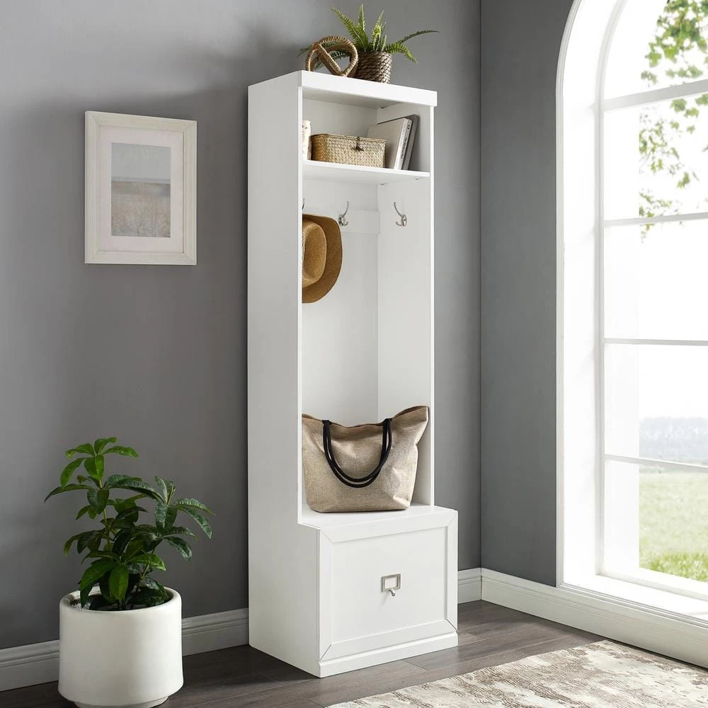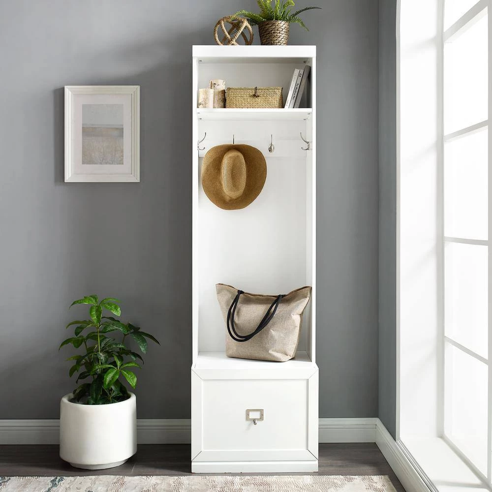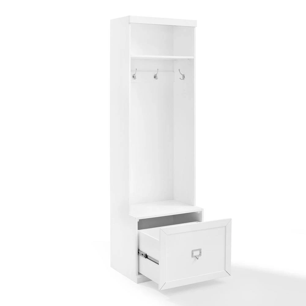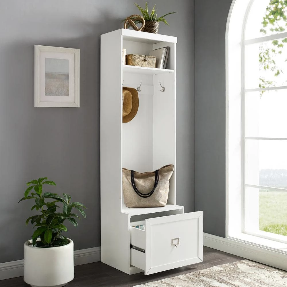 Embrace the beauty of an organized entryway with the Harper Hall Tree. Slimmer than a traditional hall tree, this tower has four large hooks for hanging coats, hats, and scarves. An open storage shelf on top and a full-extension drawer in the base, make this tower more than a traditional coat rack. The label holder hardware on the storage drawer is customizable allowing for more personalized organization. Modular in design, the Harper Hall Tree can be paired with a variety of items within the collection.