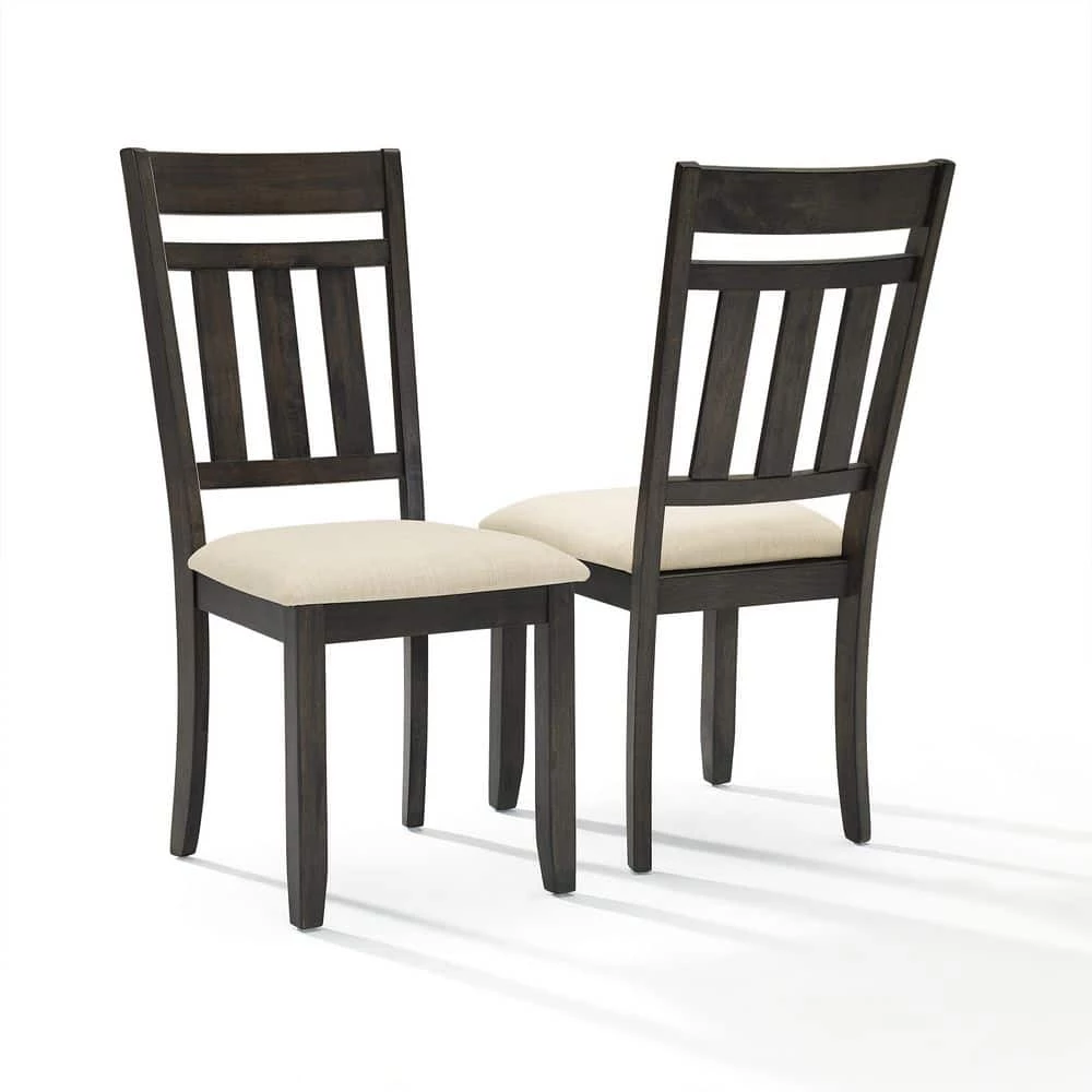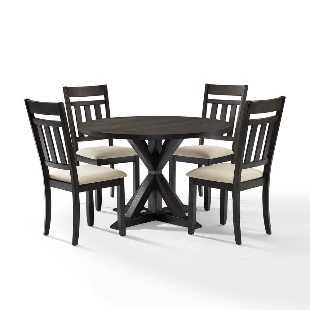 Sure to be the focal point of your modern farmhouse decor, the Hayden 5 piece Round Dining Set brings rustic style to family gatherings. The large round table top can comfortably accommodate four diners for a casual family meal. The pedestal base with intersecting legs compliments the classic slat back design of the dining chair, making the Hayden 5 piece Round Dining Set a timeless centerpiece for your dining room.