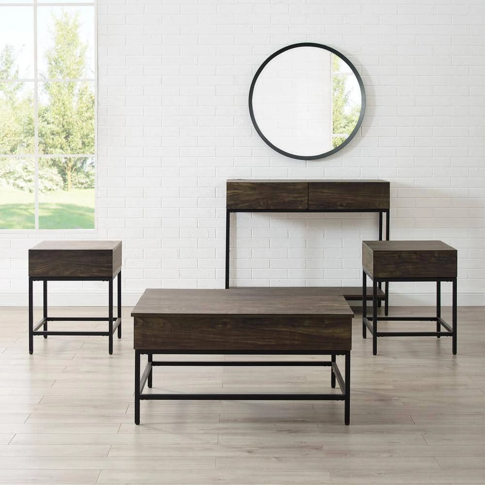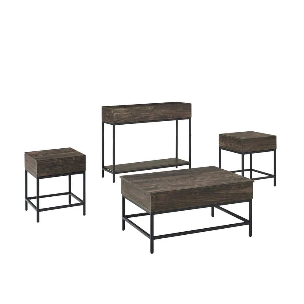 The modern family room is a multifunctional space in need of storage, tablespace, and a place to entertain, that’s where the Jacobsen 4-piece Coffee Table Set comes in. Featuring 2-end tables, a coffee table and console table, this set offers a stylish industrial aesthetic by combining the look of rustic wood with steel. The end tables and console table all feature full-extension storage drawers with sleek flat drawer fronts. The coffee table offers a unique storage option with its lift-top design that opens to storage within the table. Once raised, the lift-up top can become a dining or work space, offering much needed flexibility for the bustling households of today.