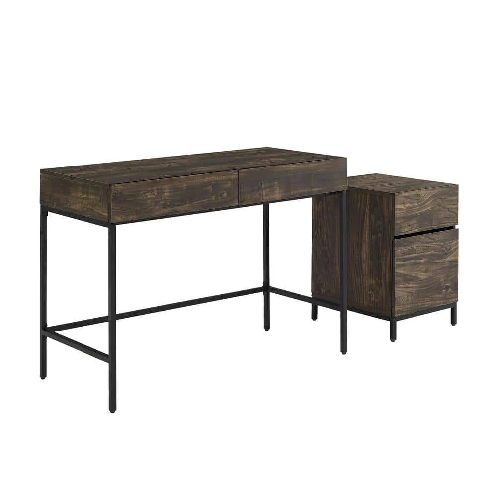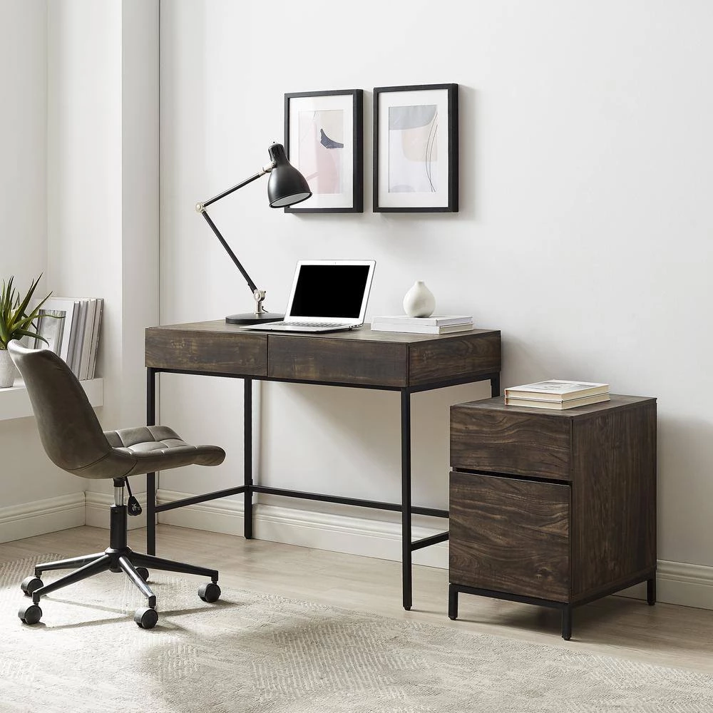 Streamlined and modern, the Jacobsen 2-piece Desk Set makes setting up a home office easy. This modular desk and file-cabinet can sit side-by-side, or the file-cabinet can tuck neatly beneath the desk for a smaller footprint. Both the desk and file-cabinet feature full-extension-drawers for maintaining a tidy workspace. A beautiful combination of faux wood and metal, the Jacobsen 2-piece Desk Set will keep you stylish and productive when working from home.