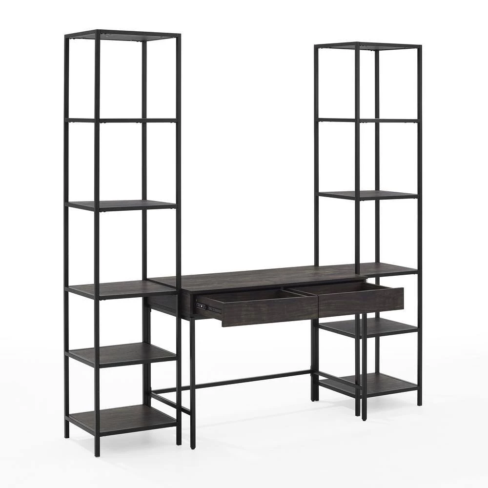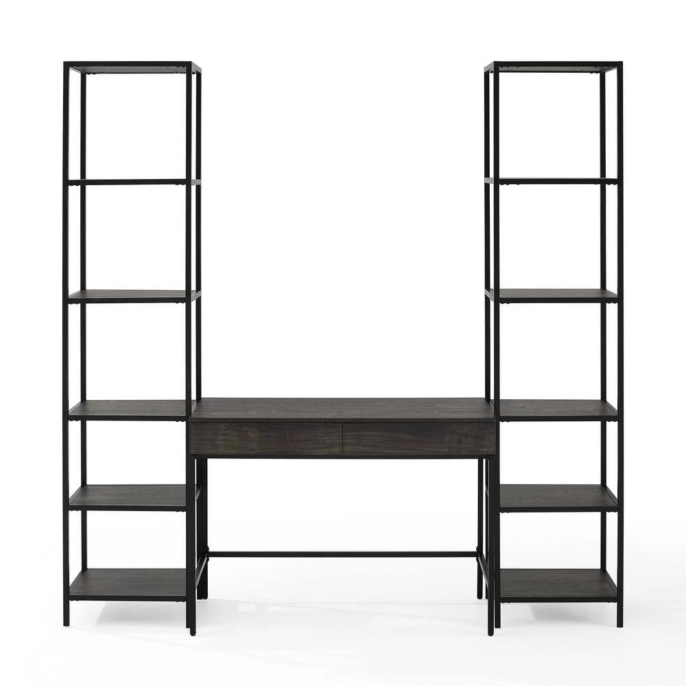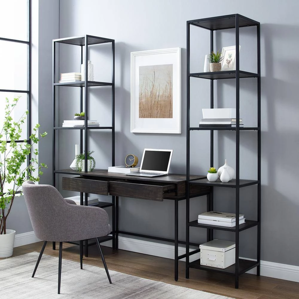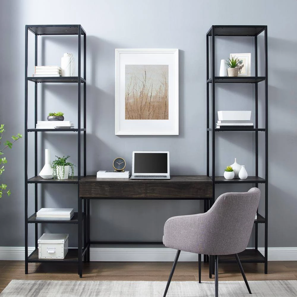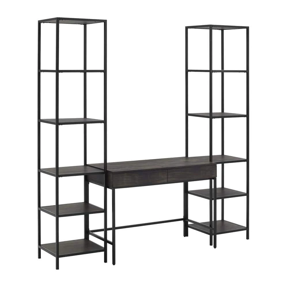 Add industrial chic to your home office with the Jacobsen 3-piece Desk Set. The sleek desk is flanked by 2-narrow etageres, creating an organized work station with ample storage. Each etagere has 5-open stationary shelves and the desk features a large workspace with 2-full-extension flat front drawers. Perfect for telecommuting, the Jacobsen 3-piece Desk Set is a home office standout with its mix of sturdy steel and the look of rustic wood.