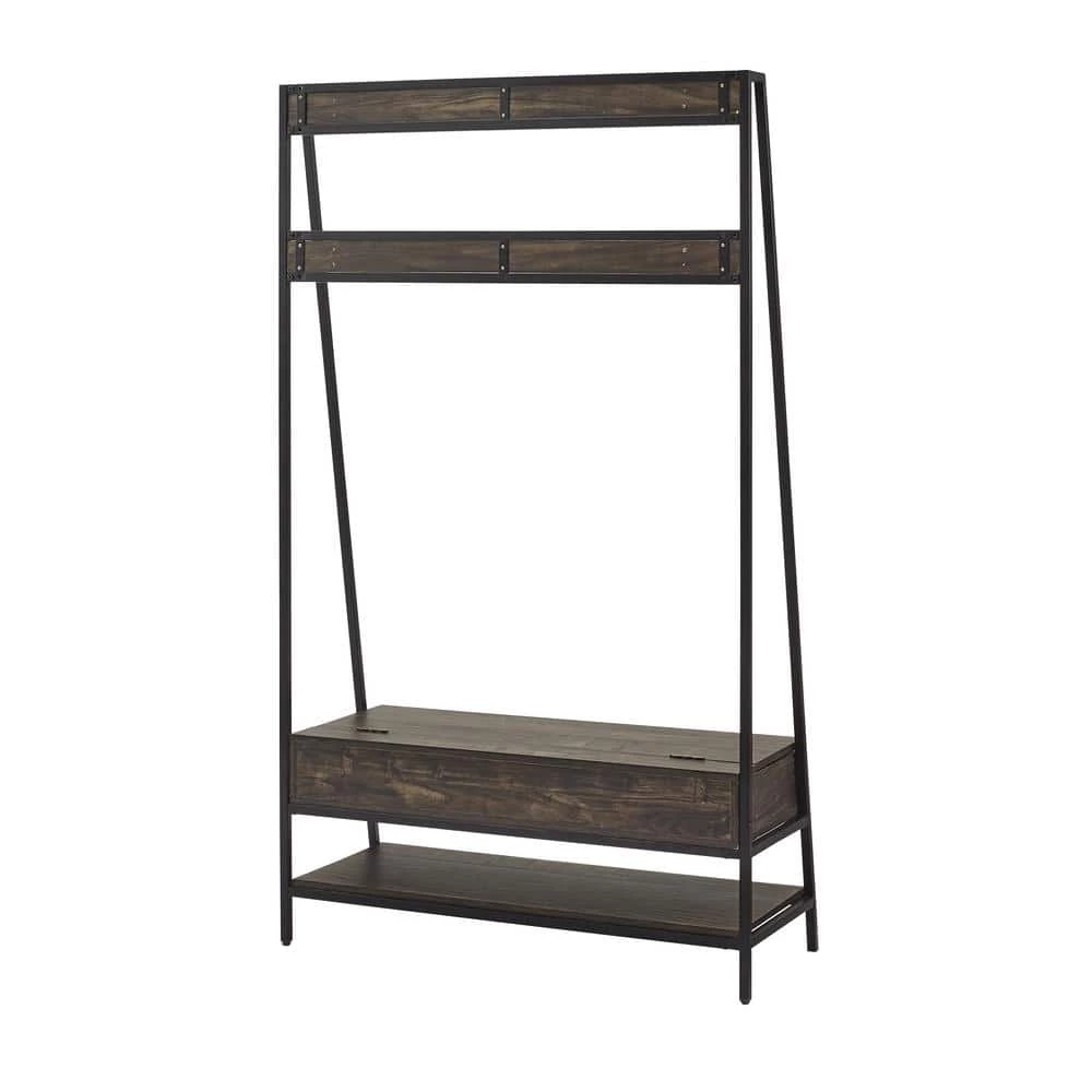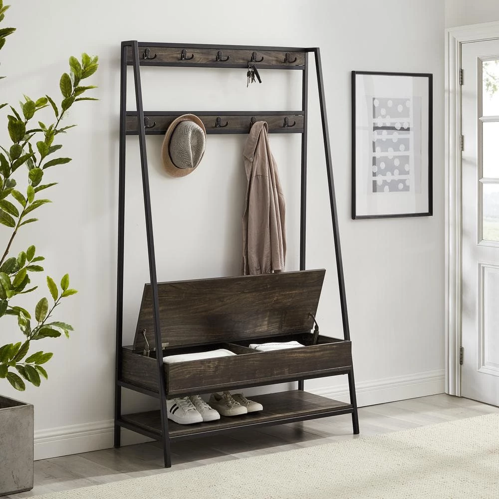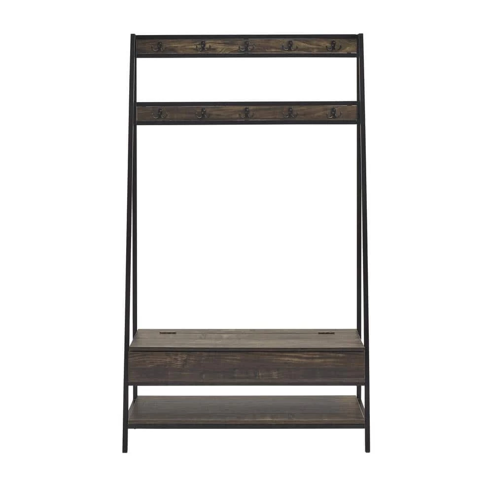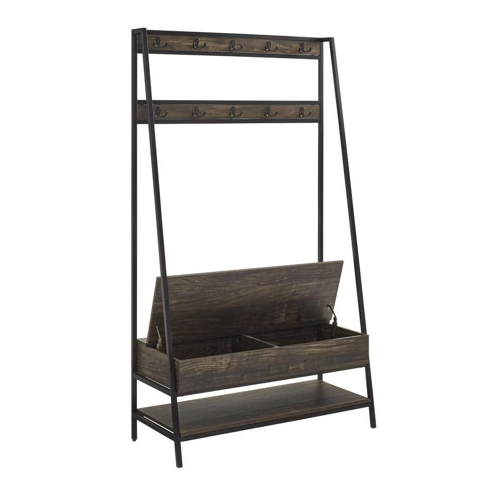 Need a coat rack. Need an entryway bench. Need shoe storage. Look no further than the Jacobsen Hall Tree. Created with elements of industrial style, this wood and metal hall tree offers 10 double prong hooks for hanging coats and book bags plus a lower shelf perfect for storing shoes. Ensuring a clutter-free entryway, this hall tree also has a built-in storage bench with a hinged lift-up top ideal for smaller items like gloves and sunglasses. Streamlined with a modern edge, the Jacobsen Hall Tree will keep you organized without overcrowding your foyer or hallway.