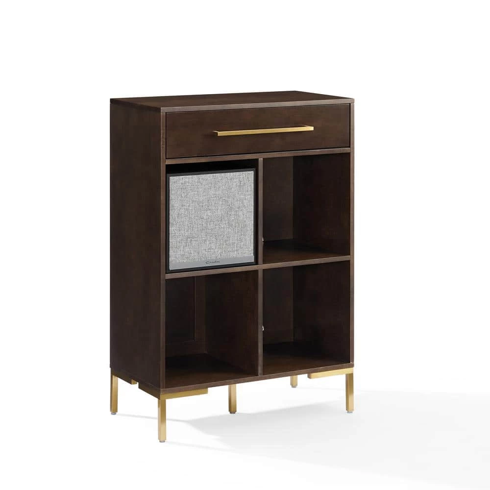 Incorporate streamlined modern storage into your home with the Juno Record Storage Cube Bookcase with Speaker. Featuring a sleek silhouette and stylish hardware, this bookcase has 4 cube shelves sized perfectly for standard records as well as books or decor. The drawer offers storage for electronic accessories and cleaning supplies, while the top of the bookcase accommodates a variety of standard record players. Ideal for every music lover, this bookcase includes a 40W output Bluetooth speaker that blends seamlessly into any of the cube shelves. Create a dedicated listening room anywhere in your home with the Juno Record Storage Cube Bookcase with Speaker.