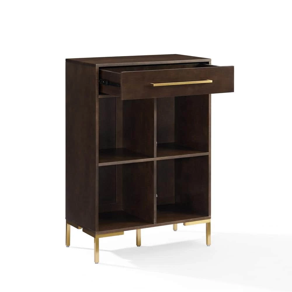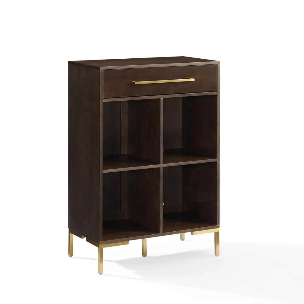 - Dark brown finish on bookcase with steel legs in a brushed brass finish