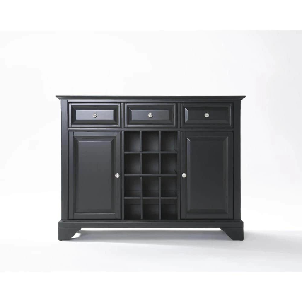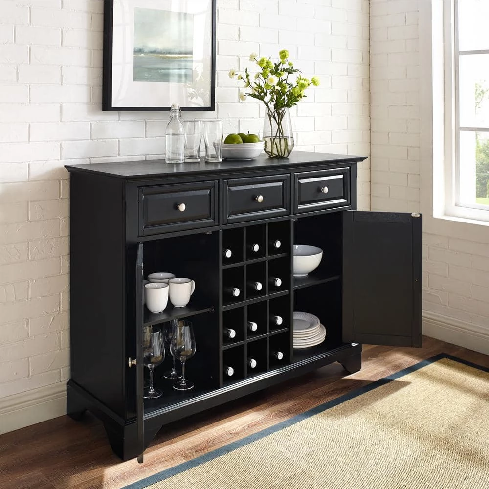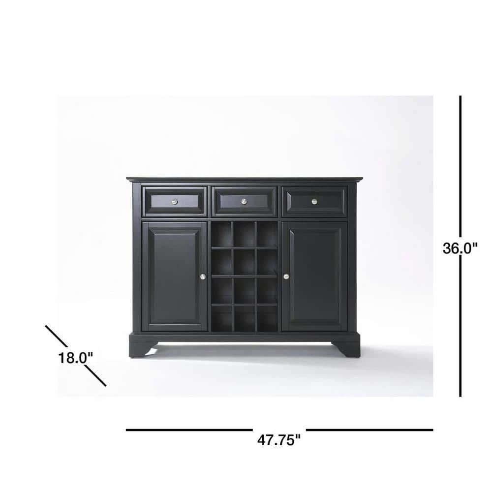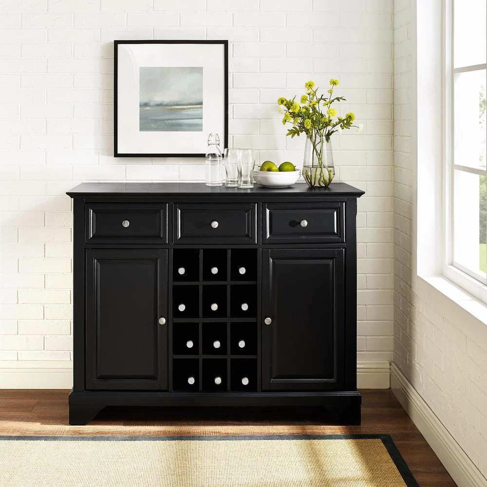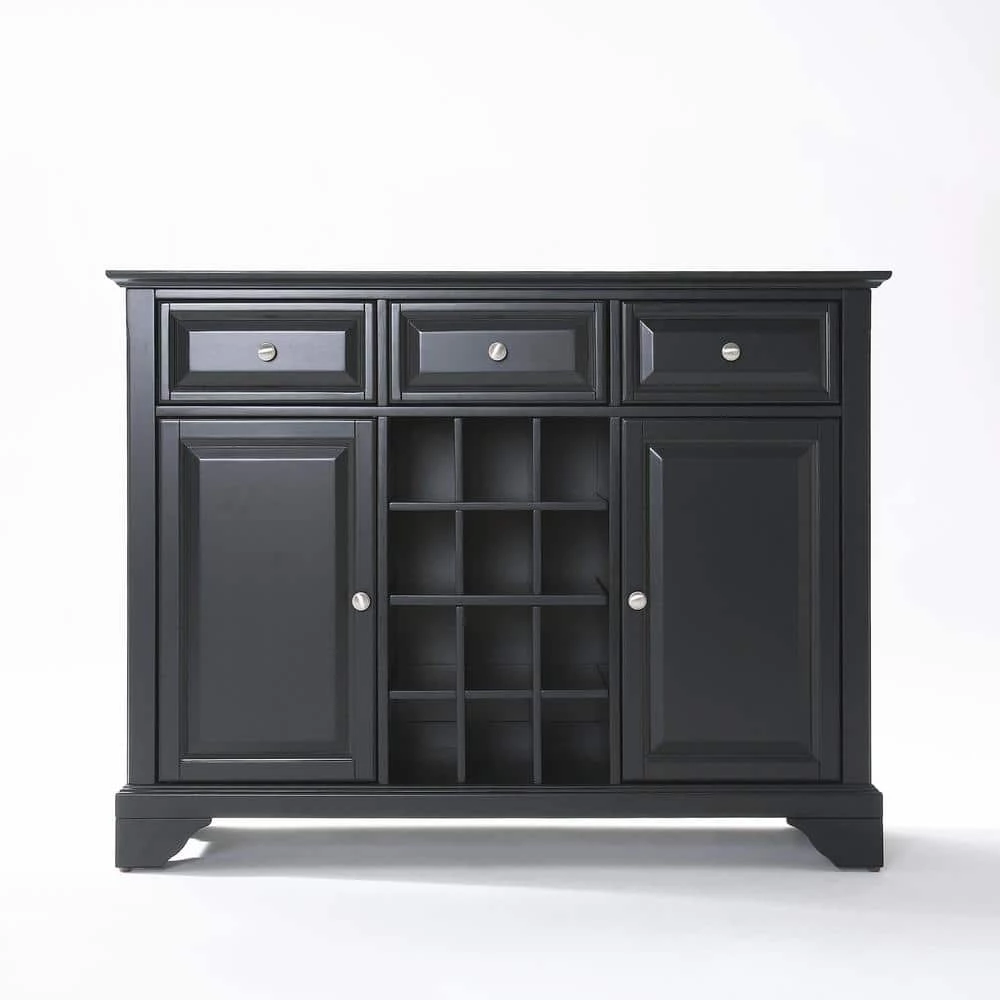 Constructed of solid hardwood and wood veneers, this Buffet Server / Sideboard Cabinet is designed for longevity. The beautiful raised panel doors and drawers, provide the ultimate in style to dress up your home. The three deep drawers provide an abundance of storage space. Behind the two doors, you will find adjustable shelves and storage space for things that you prefer to be out of sight. The center storage area is great for up to 12-bottles of wine, or if you prefer, remove the wine storage cubes to reveal an adjustable shelf. Style, function and quality make this Buffet Server a wise addition to your home.