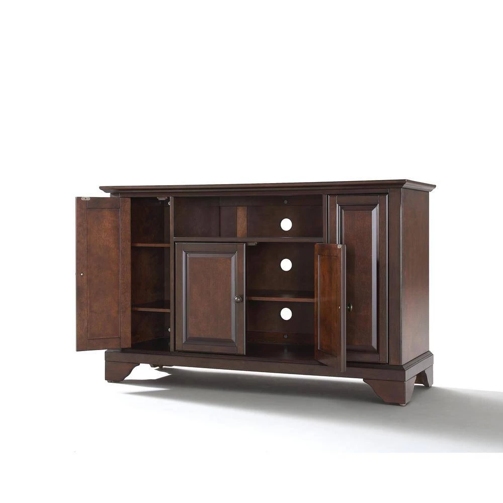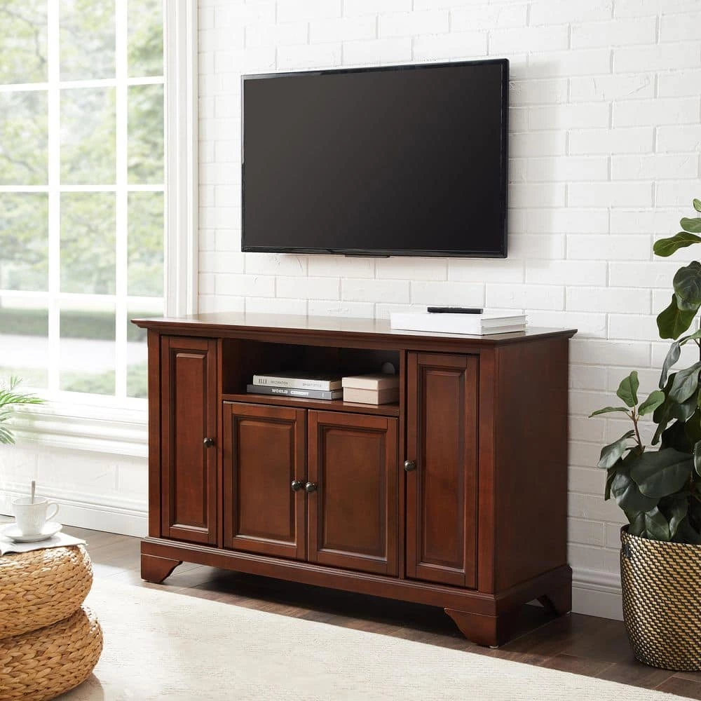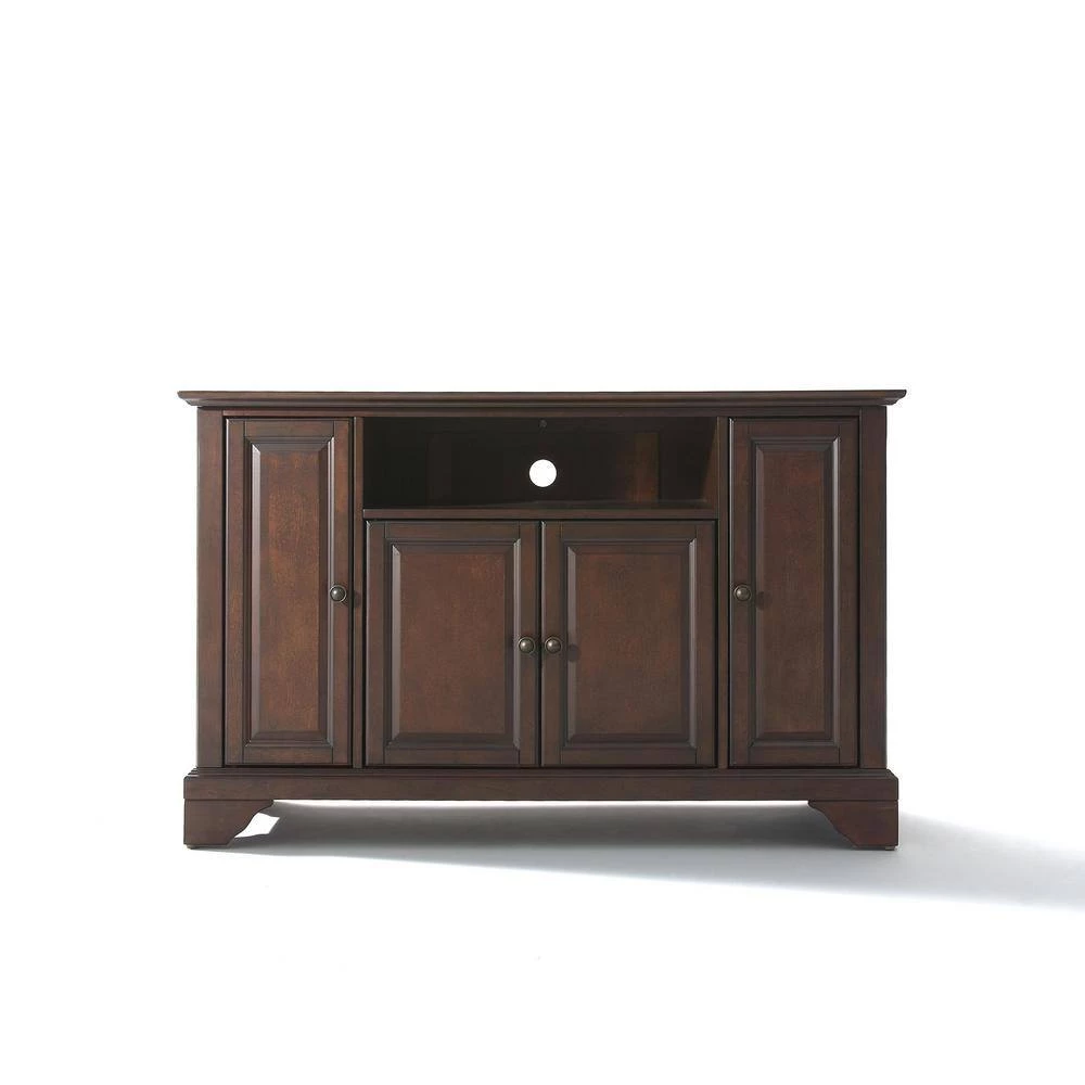 Constructed of solid hardwood and wood veneers, this cabinet is designed for longevity. The rich hand rubbed, multi-step Vintage Mahogany finish is perfect for blending with the family of furniture that is already part of your home. Antique Brass finish hardware adds a touch of style to this already beautiful cabinet. There is plenty of storage space and wire management behind the beautiful raised panel doors to hide electronic components, gaming consoles, DVDs and other items that you would prefer to be out of sight. The 47-3/4 in. width means that this cabinet is perfect for most 50 in. TV’s. Style, function and quality make this cabinet a wise choice for your home furnishings needs and is sure to be a part of your home for years to come.
