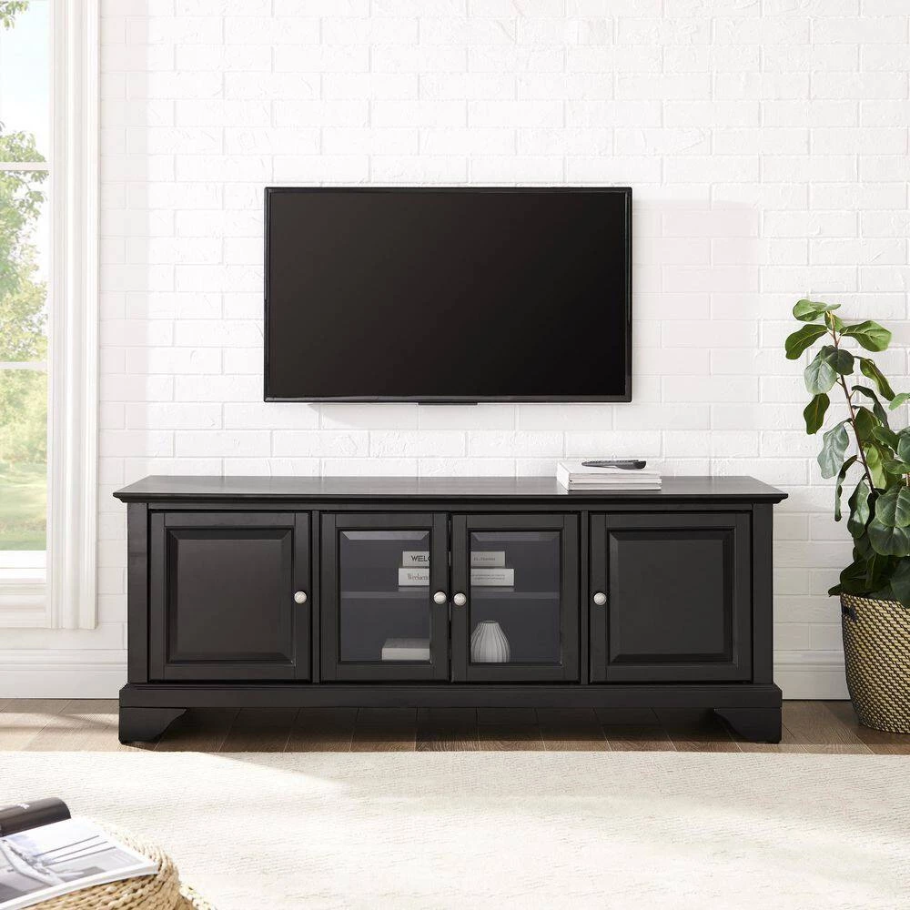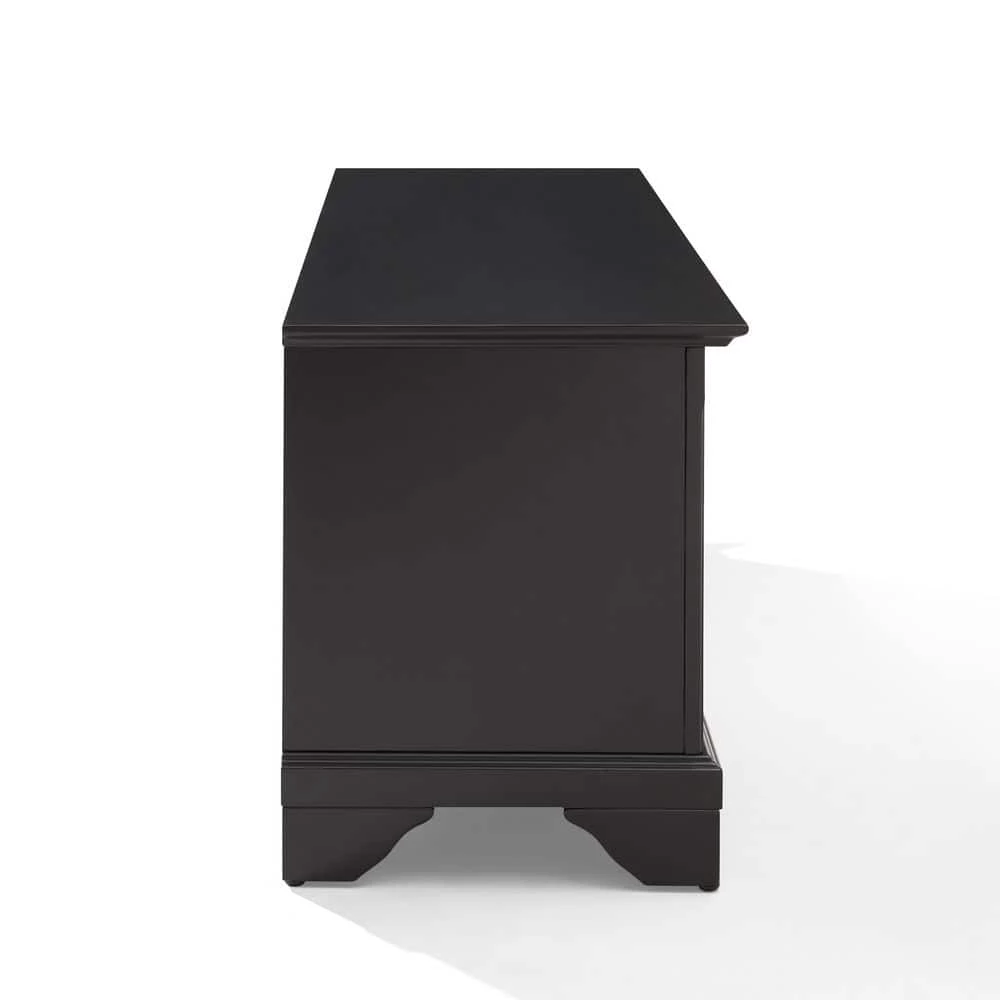 Enhance your living space with Crosley’s impeccably-crafted low profile TV stand. This signature cabinet accommodates most flat panel TVs and is handsomely proportioned featuring character-rich details sure to impress. The hand rubbed, multi-step Black finish with brushed nickel hardware is perfect for blending with the family of furniture that is already part of your home. Raised panel doors strategically conceal stacks of CD/DVDs and various media paraphernalia. Tempered beveled glass doors not only add a touch of class; they protect those valued electronic components, while allowing for complete use of remote controls. Adjustable shelving offers an abundance of versatility to effortlessly organize by design, while cord management tames the unsightly mess of tangled wires. Style, function and quality make this cabinet a wise choice for your home furnishings needs.