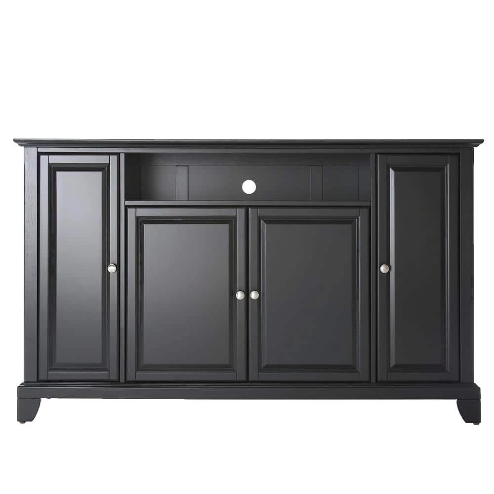 Constructed of solid hardwood and wood veneers, this cabinet is designed for longevity. The rich hand rubbed, multi-step black finish is perfect for blending with the family of furniture that is already part of your home. Brushed Nickel hardware adds a touch of style to this already beautiful cabinet. There is plenty of storage space and wire management behind the beautiful raised panel doors to hide electronic components, gaming consoles, DVDs and other items that you would prefer to be out of sight. The 59-3/4 in. width means that this cabinet is perfect for most 60 in. TV’s. This cabinet is not just for the TV room. The 36 in. height makes for great TV viewing in the bedroom. Behind the four doors, you will find adjustable shelves and lots of storage space for things other than electronics. Style, function and quality make this cabinet a wise choice for your home furnishings needs and is sure to be a part of your home for years to come.