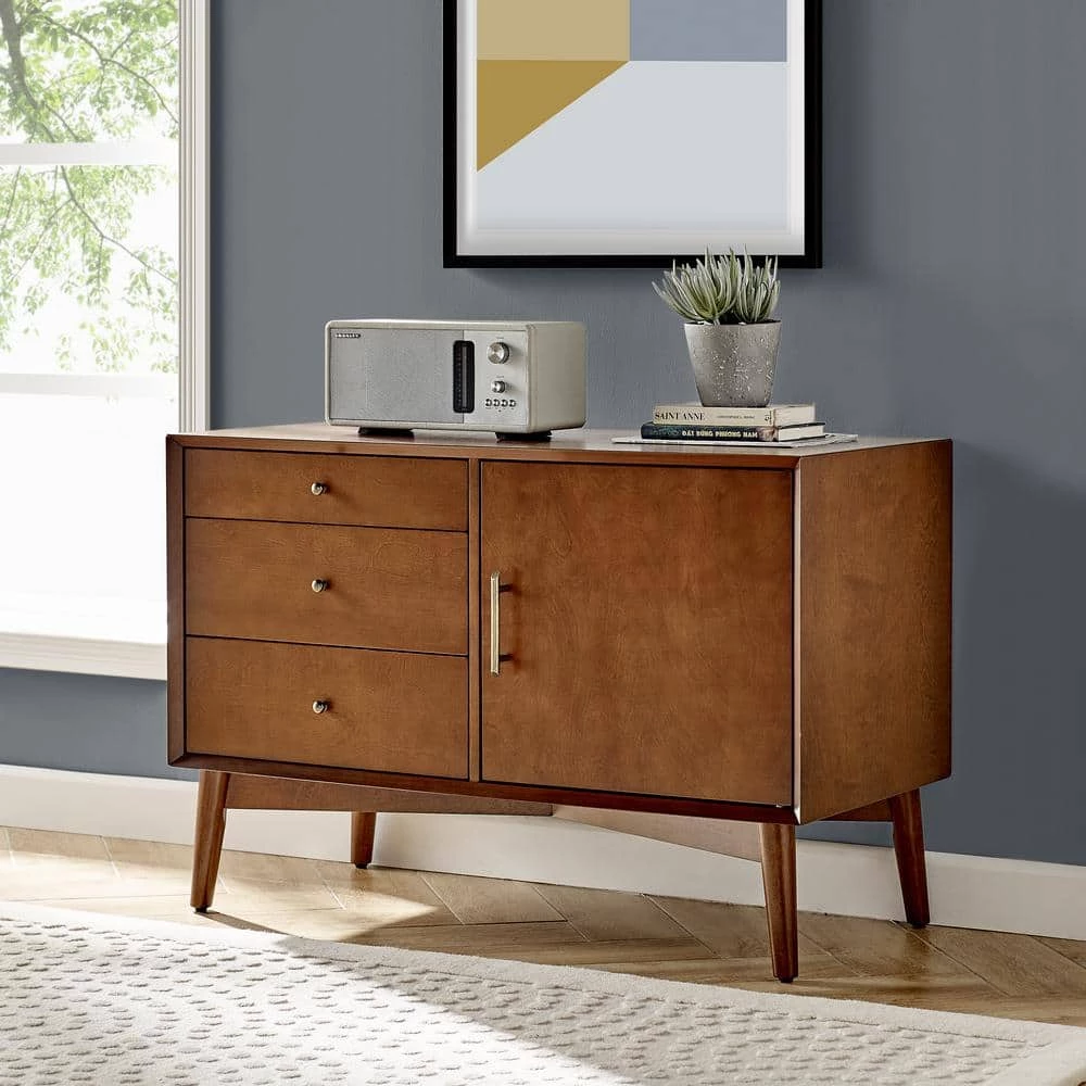 Taking cues from mid-century modern design, the Landon Media Console can serve as an innovative media cabinet or a sleek accent chest. Along with the spacious cabinet and adjustable shelves, the three side drawers roll out on full extension glides, giving easy access to every corner. With slender tapered legs and modern lines, the Landon Media Console brings elegant simplicity into any home.