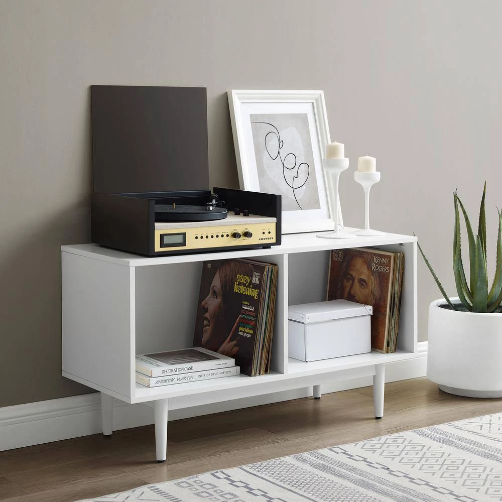 Simple, practical, stunning. The Liam Medium Record Storage Console Cabinet blends modern functionality and mid-century style. Perched atop classic tapered legs, this storage console features two divided sections sized perfectly for your precious vinyl. With a low profile, this storage console will complement any room in the home without overwhelming the space. Whether it’s used for record storage or for other household items, the Liam Medium Record Storage Console Cabinet is the versatile home organization solution you need.