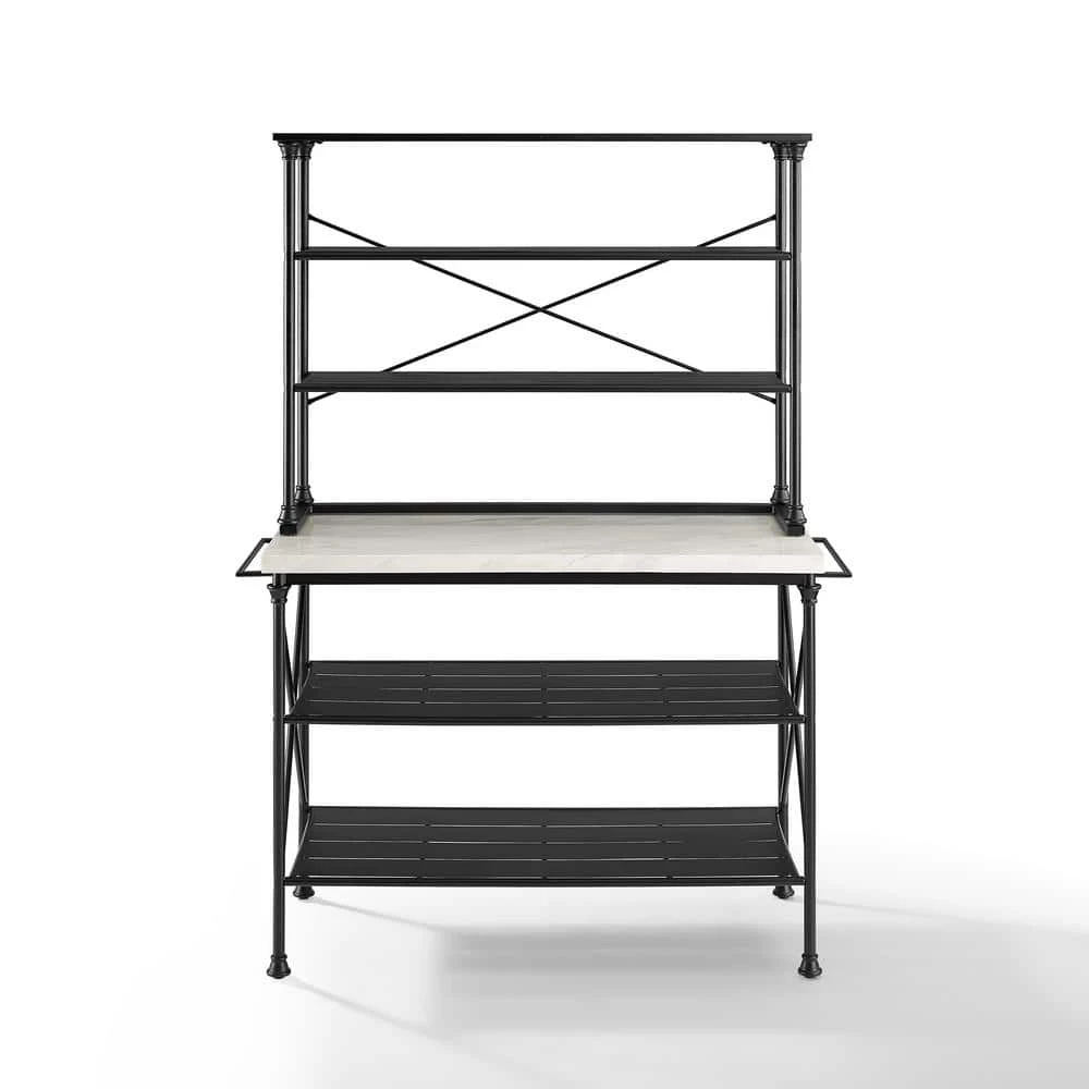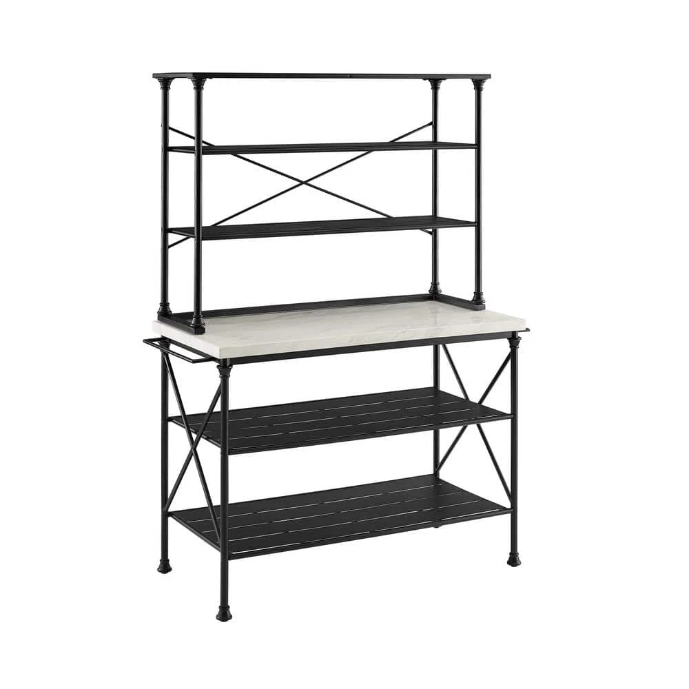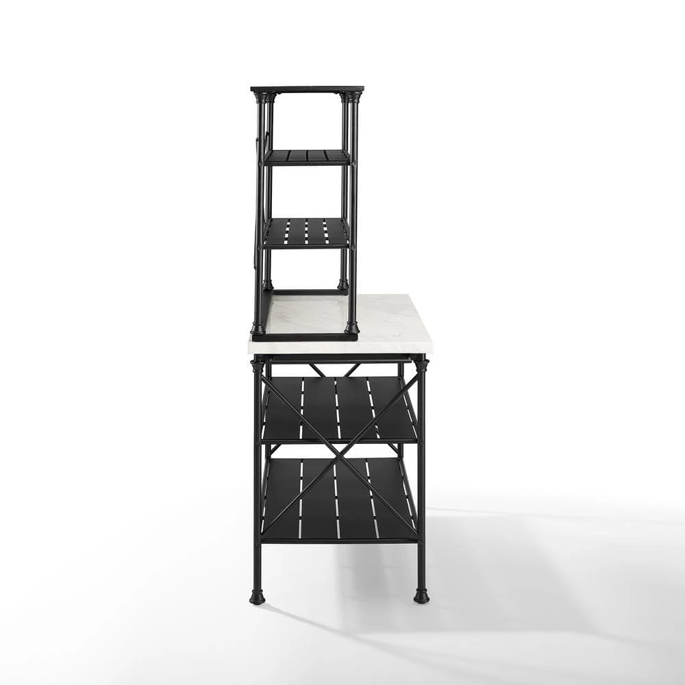 Inspired by the French industrial revival, the madeleine Kitchen Island and hutch set brings a stylish aesthetic to the kitchen. Featuring open metal shelving on the hutch and island base and a faux marble top, the sleek profile of this set offers functionality without overpowering your space. The hutch’s shelving is perfect for display or storage while the lower shelves provide ample space for larger kitchen or dining items. You can keep your kitchen or dining area organized in style with the Madeleine Kitchen Island and Hutch.