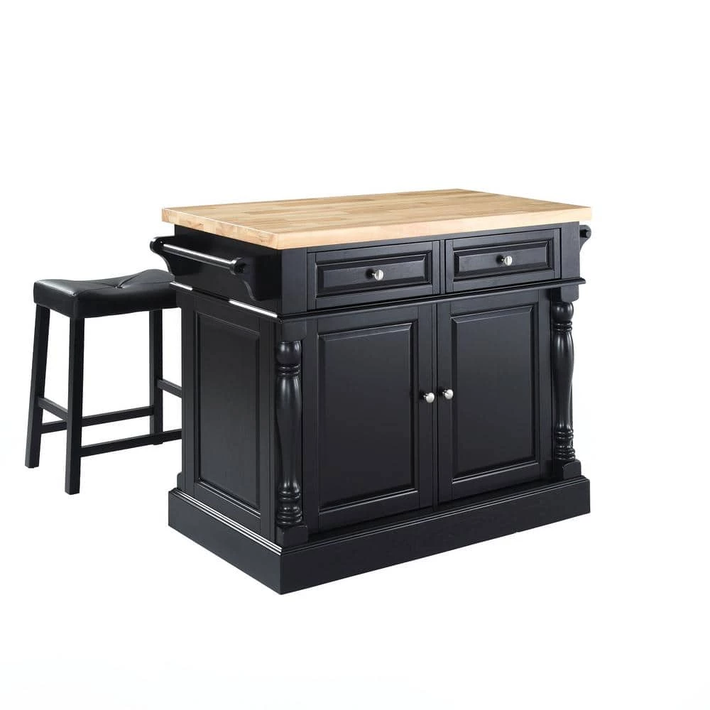 Constructed of solid hardwood and wood veneers, this kitchen island is designed for longevity. The handsome raised panel doors and drawer fronts provide the ultimate in style to dress up any culinary space. Great for food preparation, the butcher block top is a plus in any kitchen. Fully functional doors and drawers on both sides of the cabinet provide beauty and convenience. Behind the doors, you will find adjustable shelves and an abundance of storage space for objects you’d prefer to keep hidden. Deep push-through drawers are great for holding essential items, such as utensils or storage containers. Style, function, and quality make this kitchen island a wise addition to your home.
