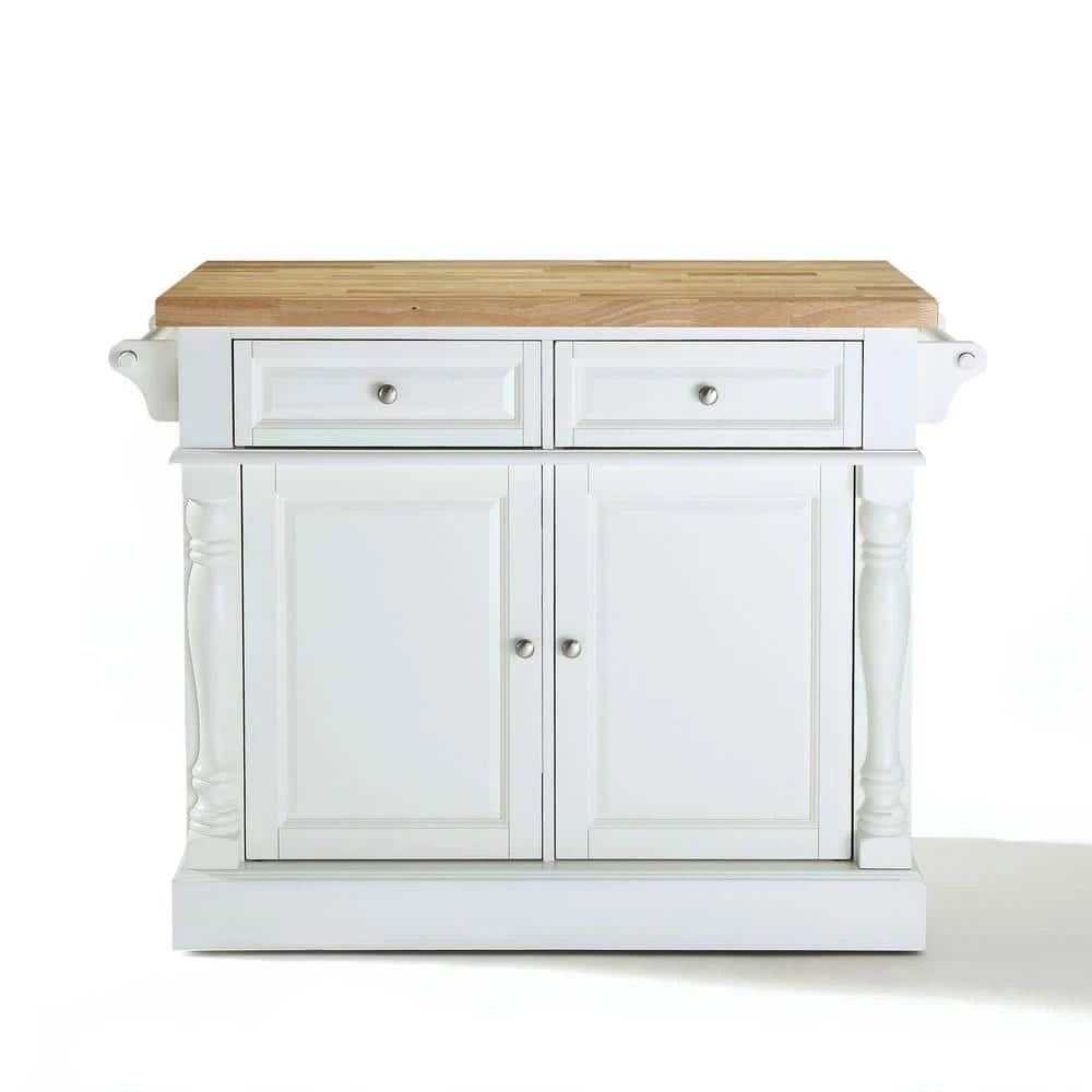 Constructed of solid hardwood and wood veneers, this kitchen island is designed for longevity. The handsome raised panel doors and drawer fronts provide the ultimate in style to dress up any culinary space. Great for food preparation, the butcher block top is a plus in any kitchen. Fully functional doors and drawers on both sides of the cabinet provide beauty and convenience. Behind the doors, you will find adjustable shelves and an abundance of storage space for objects you’d prefer to keep hidden. Deep push-through drawers are great for holding essential items, such as utensils or storage containers. Style, function, and quality make this kitchen island a wise addition to your home.