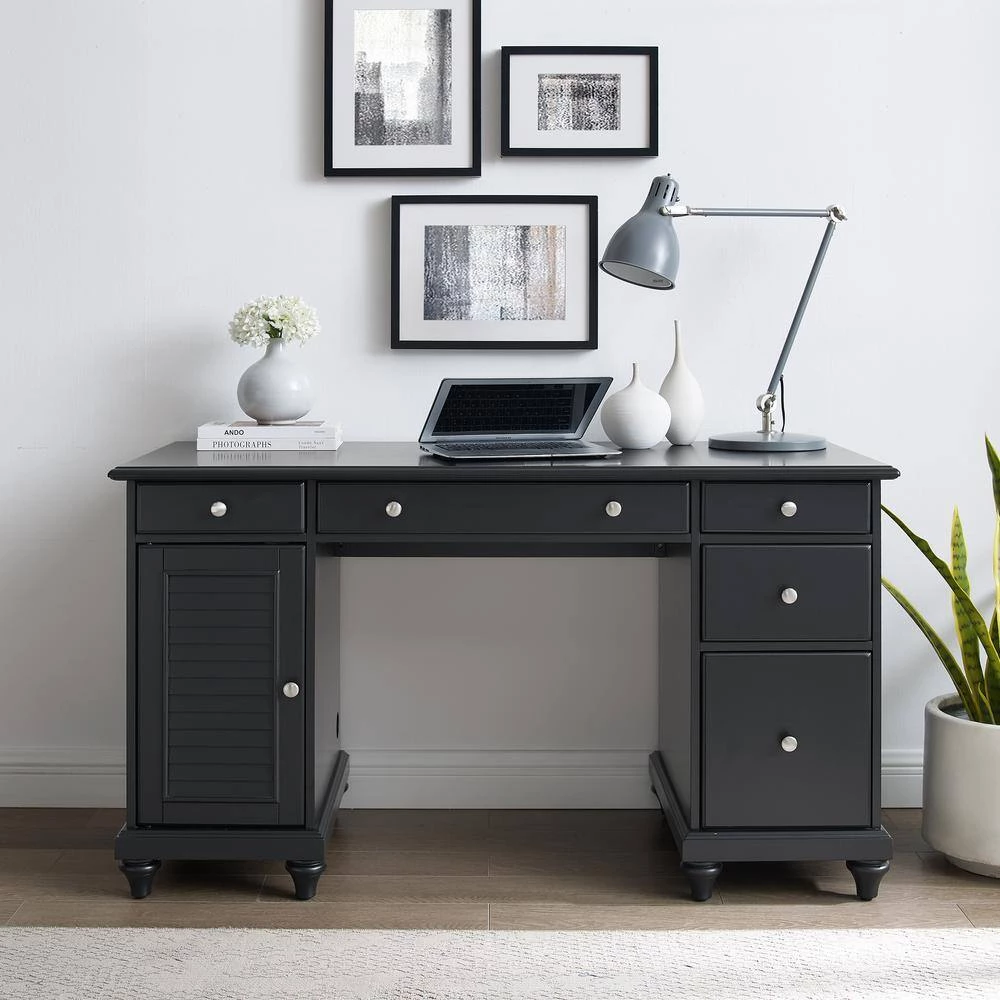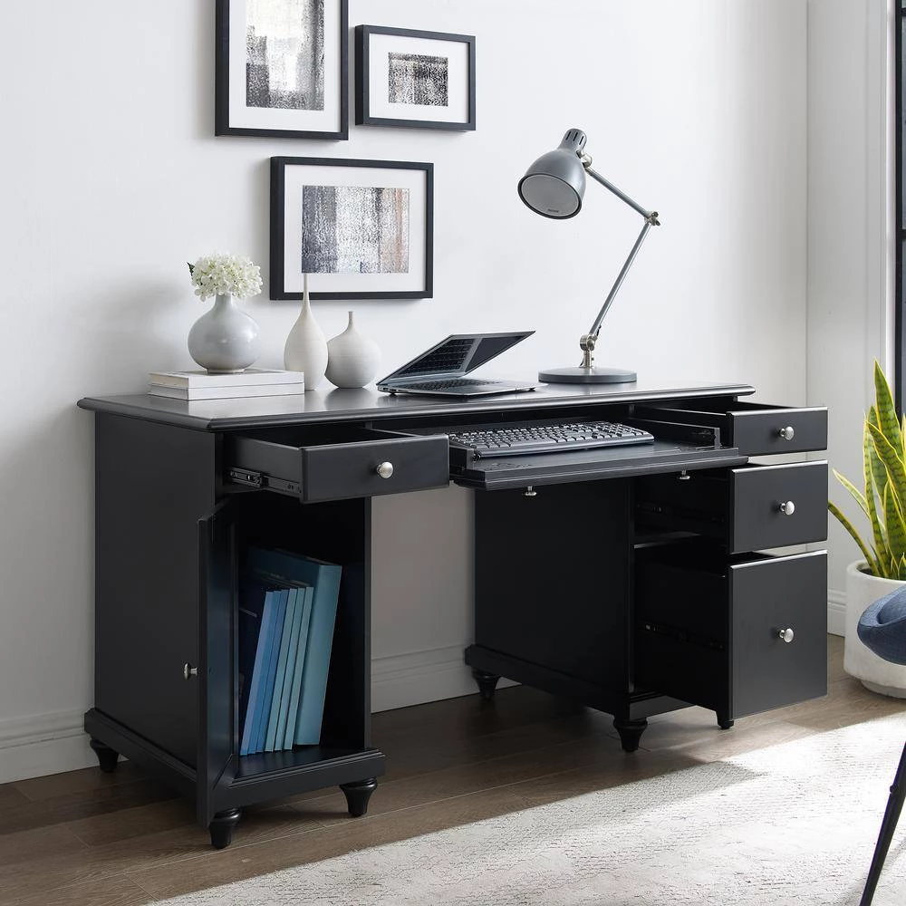 Classic multi-functional design and ample storage are hallmarks of the Palmetto Computer Desk. Featuring a drop-down keyboard tray and a cabinet for your computer tower, this desk creates a modern workstation. Three storage drawers keep your home office organized, while the large file cabinet drawer keeps documents tidy and close at hand. With decorative elements like turned feet and louvered accents, the Palmetto Computer Desk brings style wherever it goes.