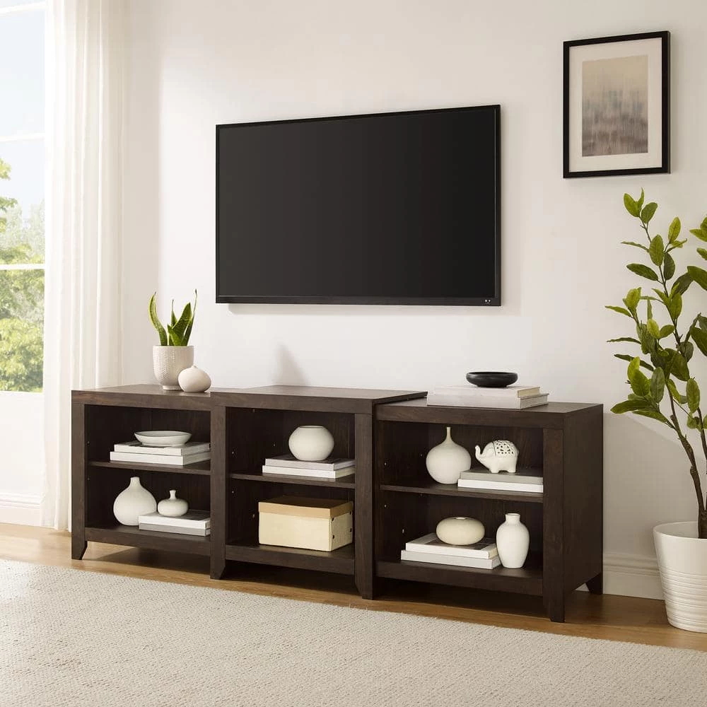 Whether you’re watching the big game or having a family movie night, the Ronin 69″ TV Stand is the perfect companion for wall-mounted televisions up to 75″. This extra-wide TV stand offers three open cabinets with adjustable shelving, plus pre-cut holes for cable management. With a low-profile silhouette and tapered legs, the Ronin TV Stand is a stylish upgrade to a classic entertainment center or media console.