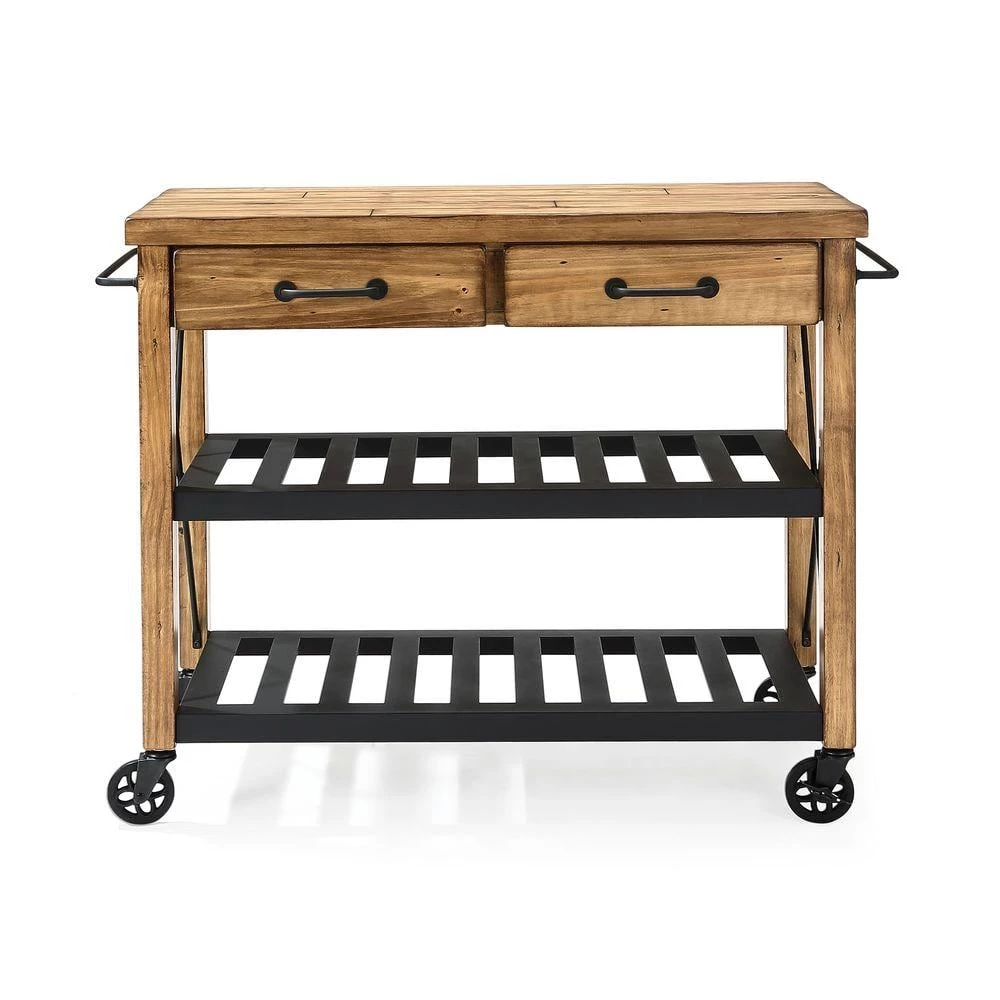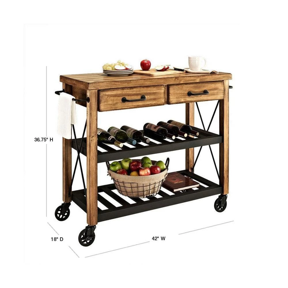 The relaxed lifestyle of French Wine country comes to life in Crosley’s new Roots Rack. Its rustic design is reflective of a time when recycling wasn’t a societal choice, but a way of life. Starting with a solid pine top, we simulate the popular “reclaimed” wood look by hand-etching a weathered plank design into the surface. The rich honey finish extends to the sturdy legs, riding on industrial style casters wrapped in rubber. 2-spacious drawers sit on full-extension glides, providing maximum utility. The sturdy metal shelves are finished in black and are perfectly notched to secure individual wine bottles. Completing the package are industrial style drawer pulls, towel bars and X-supports. The Roots Rack is perfect for any kitchen activity slicing, dicing, mixing, or mingling.